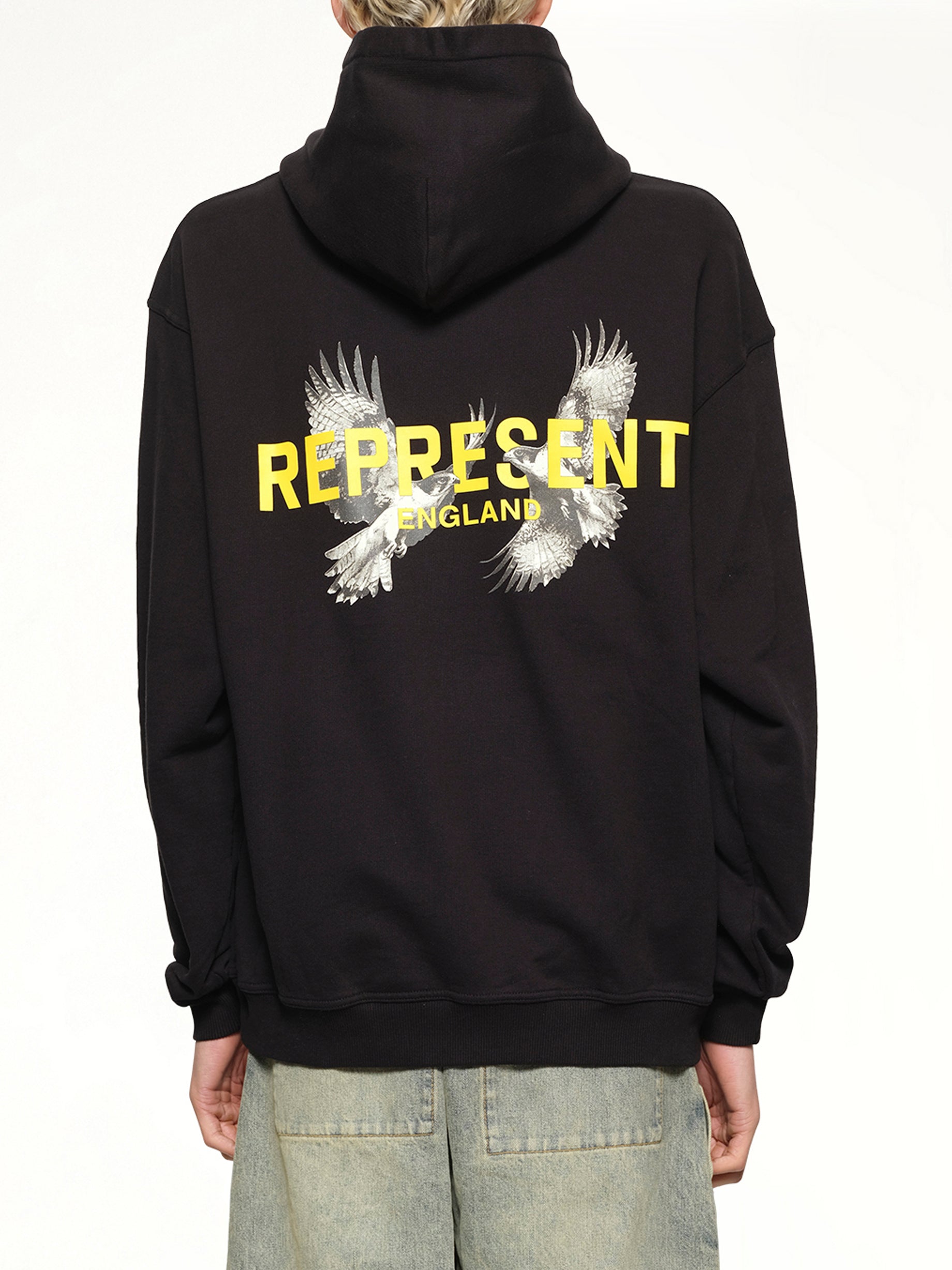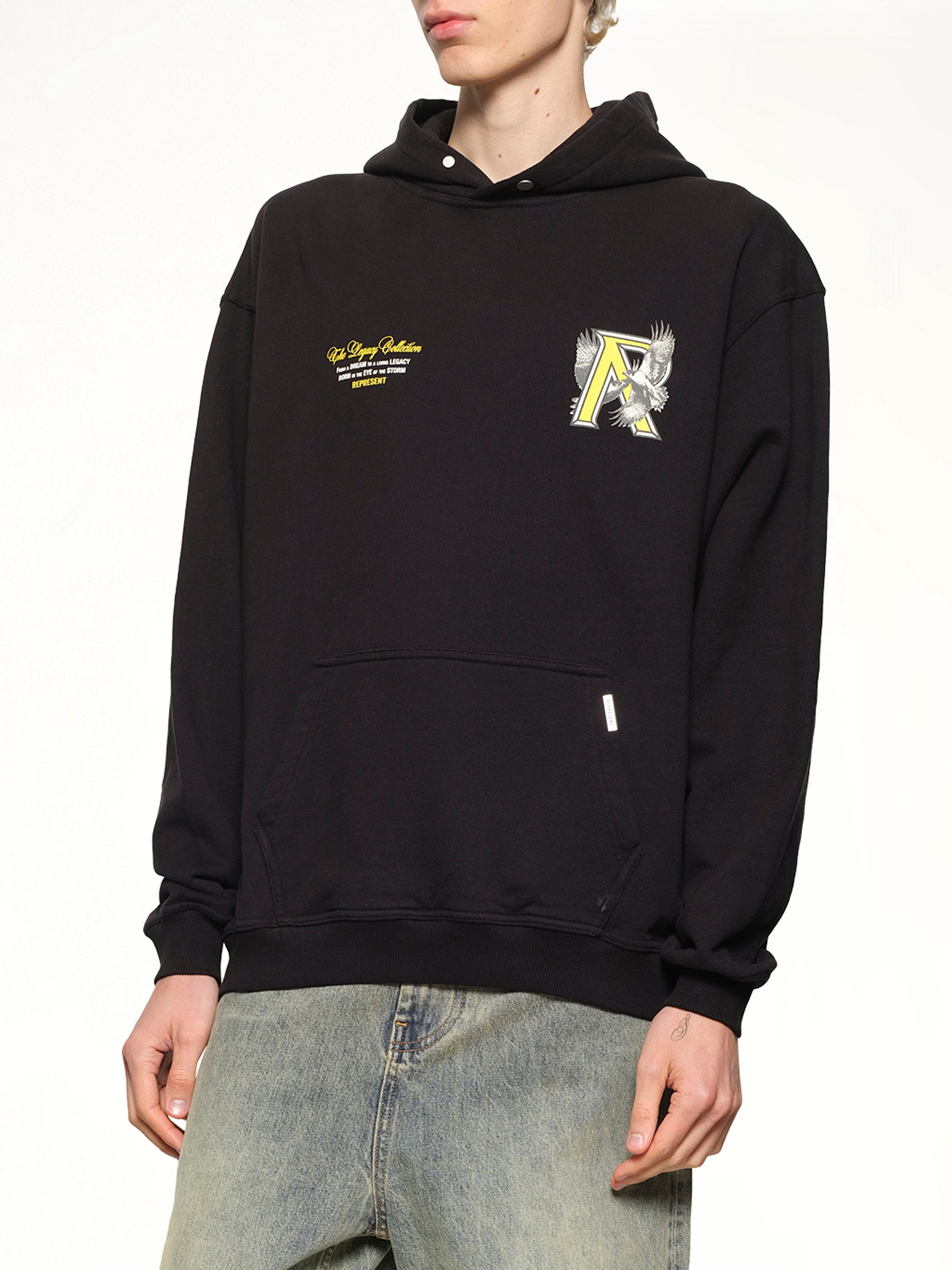 Represent's Legacy Falcon Hoodie in Jet Black is a stylish and versatile addition to any wardrobe. This hoodie combines comfort with a sleek design, perfect for everyday wear.