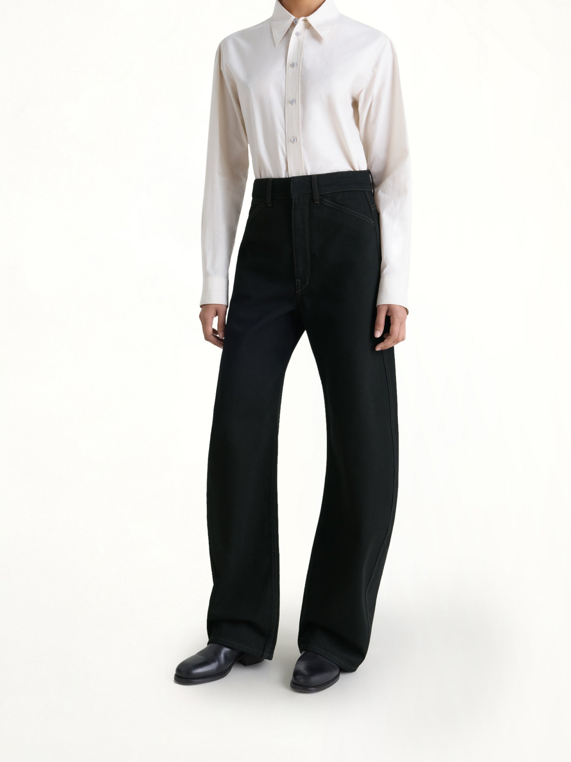 Lemaire's High Waisted Curved Pants in Black is a sophisticated addition to any wardrobe, offering a modern silhouette with a timeless appeal. These pants are designed to provide both comfort and style, making them perfect for various occasions.