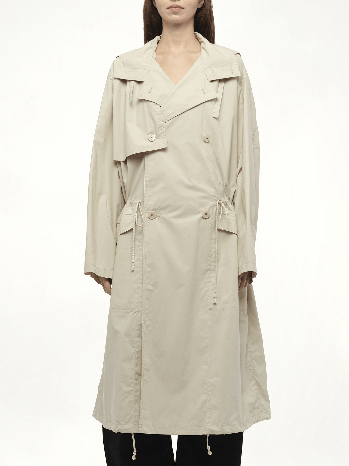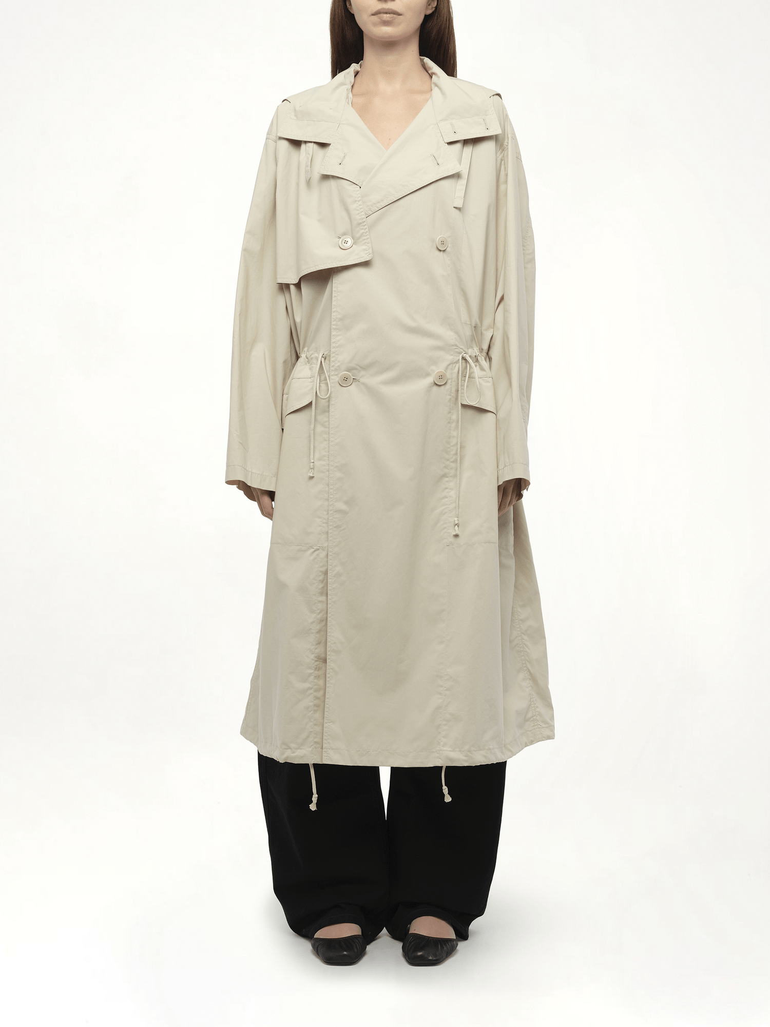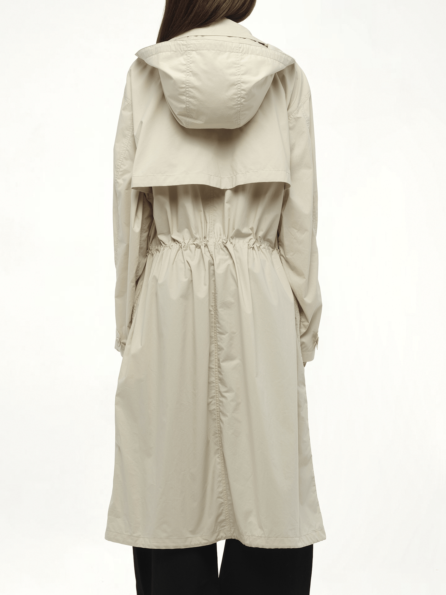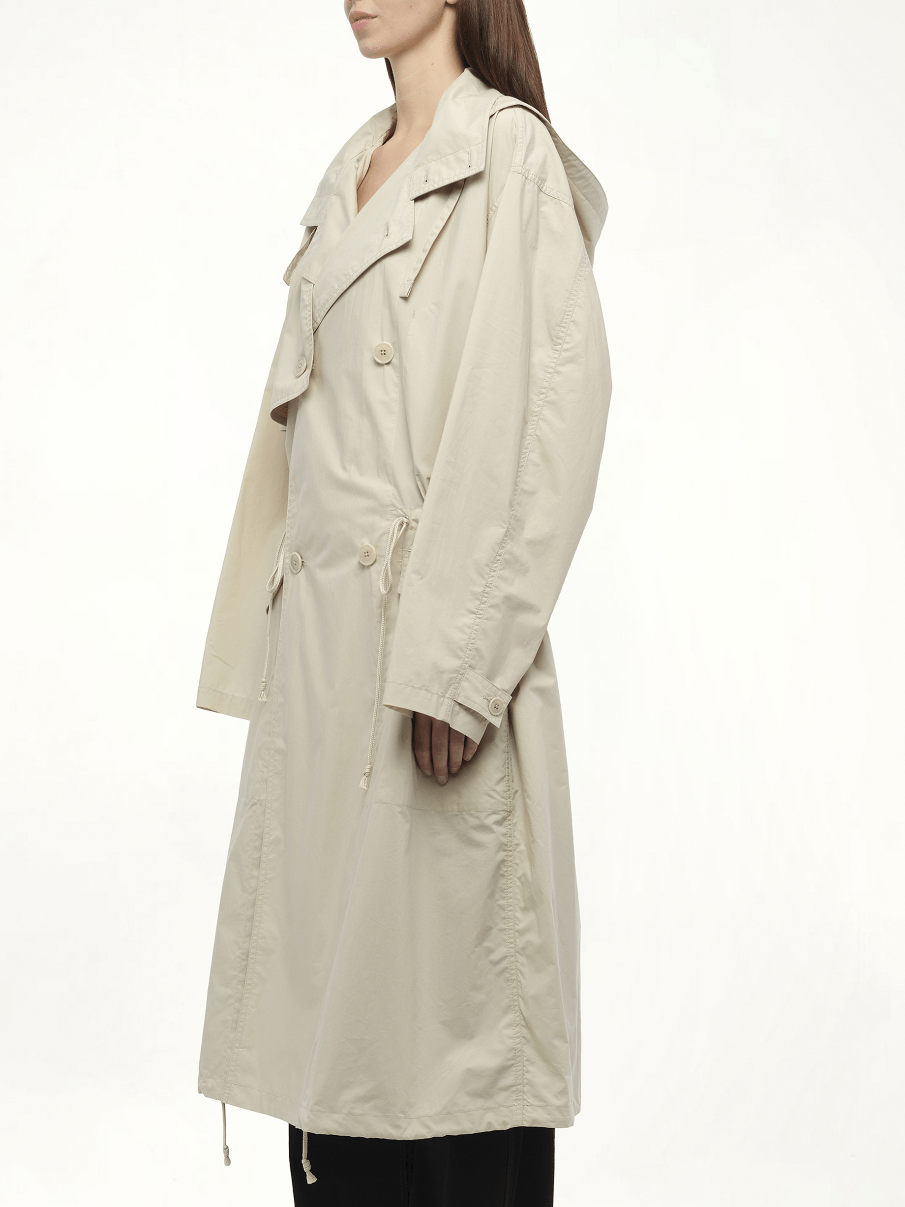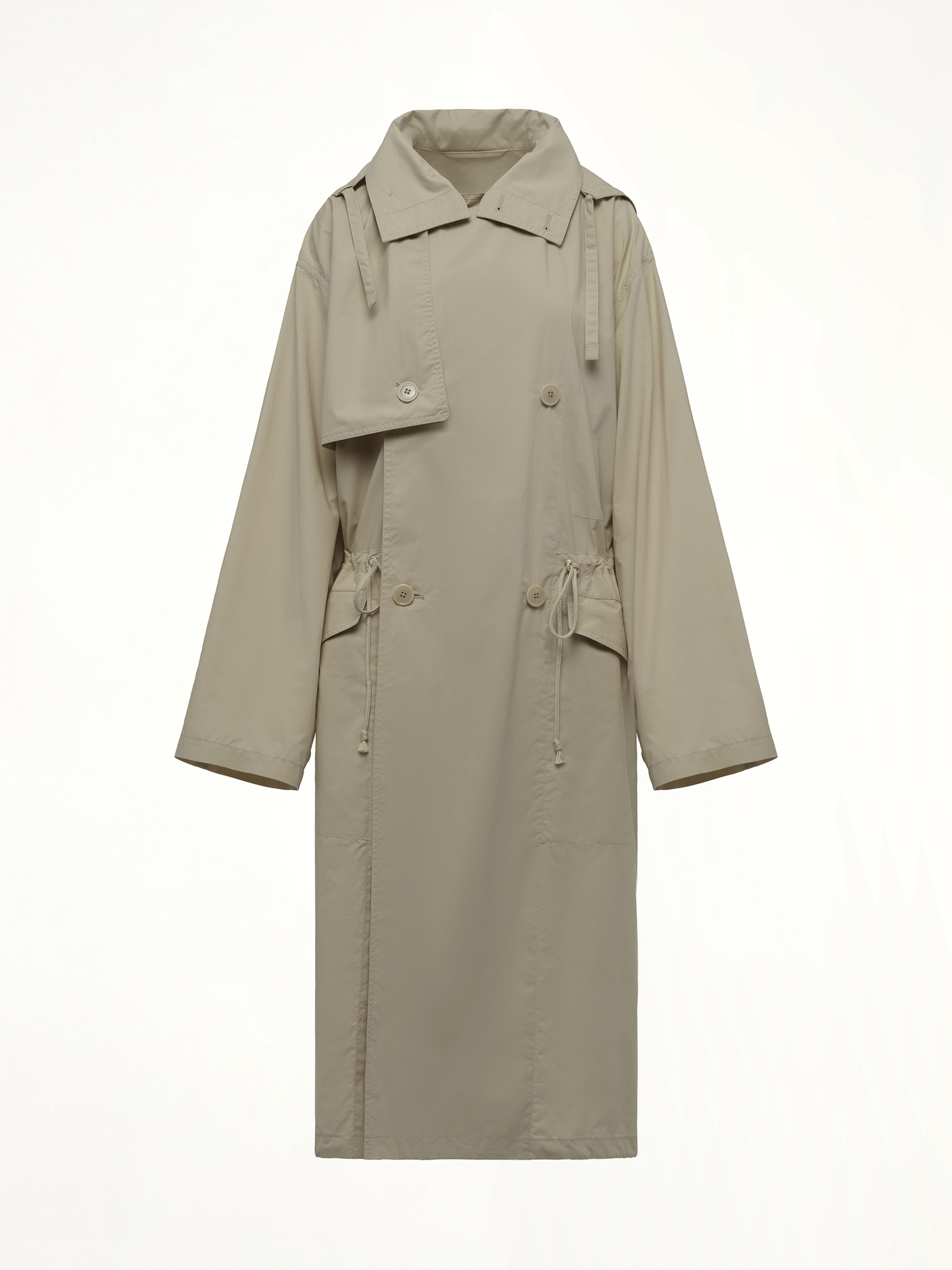 Lemaire's Light Hooded Trench in Stone Beige, this lightweight trench features a fluid silhouette with a relaxed yet refined cut. The hooded design adds practical coverage without sacrificing elegance.