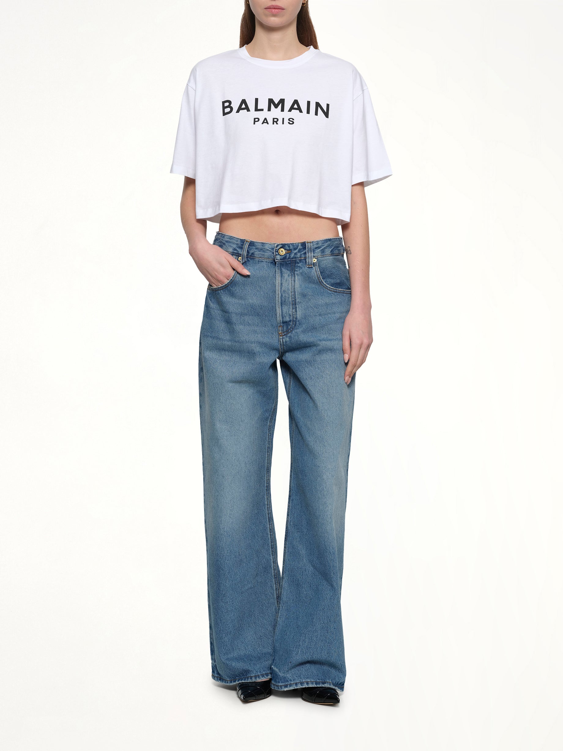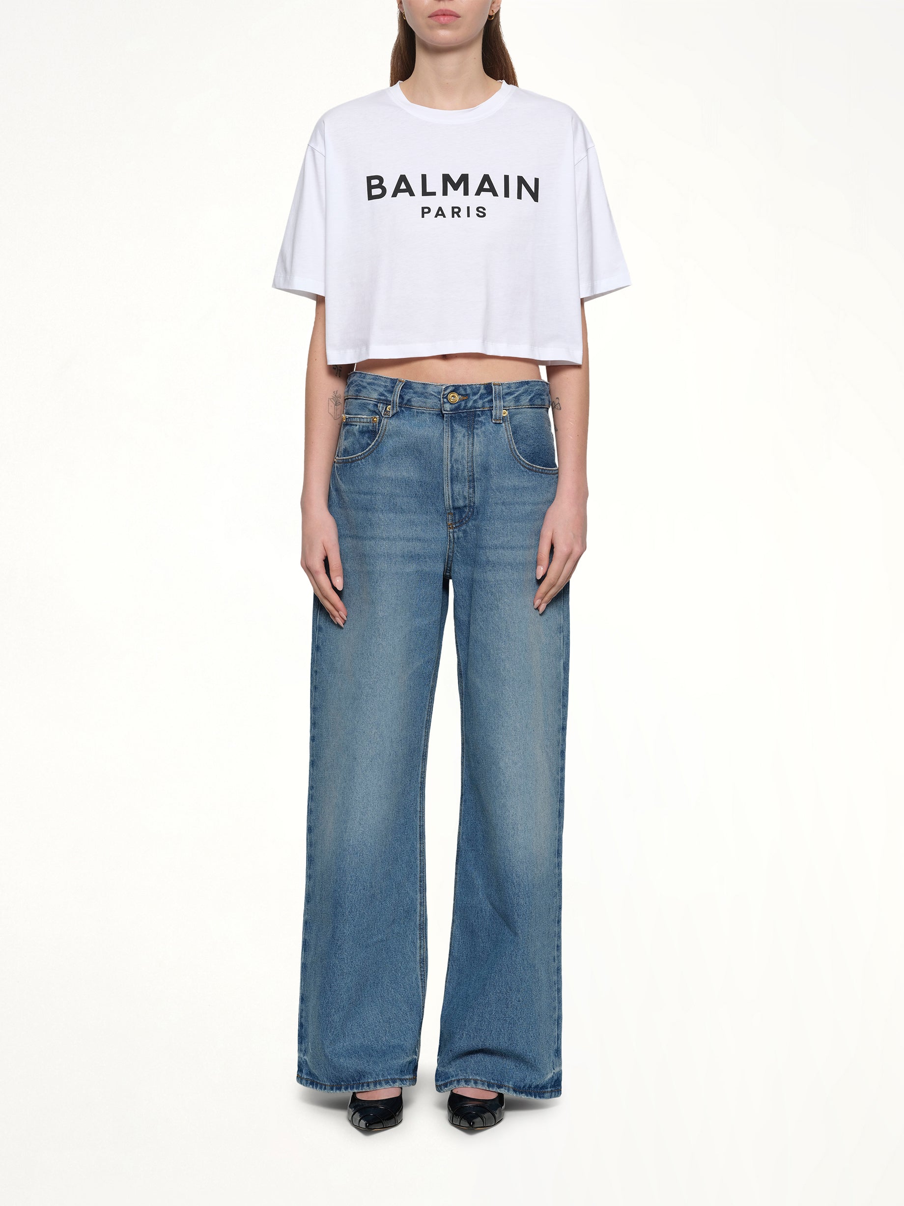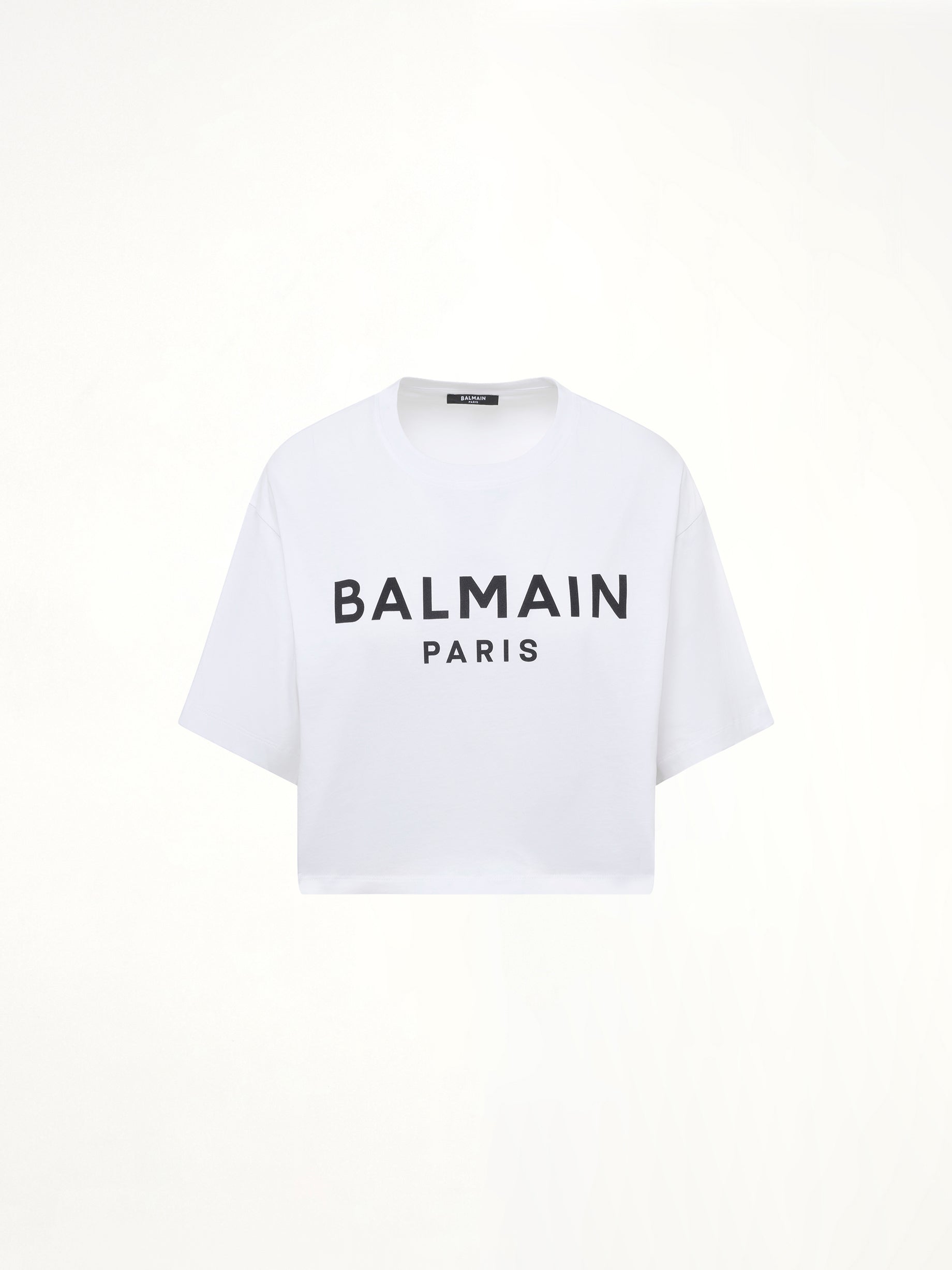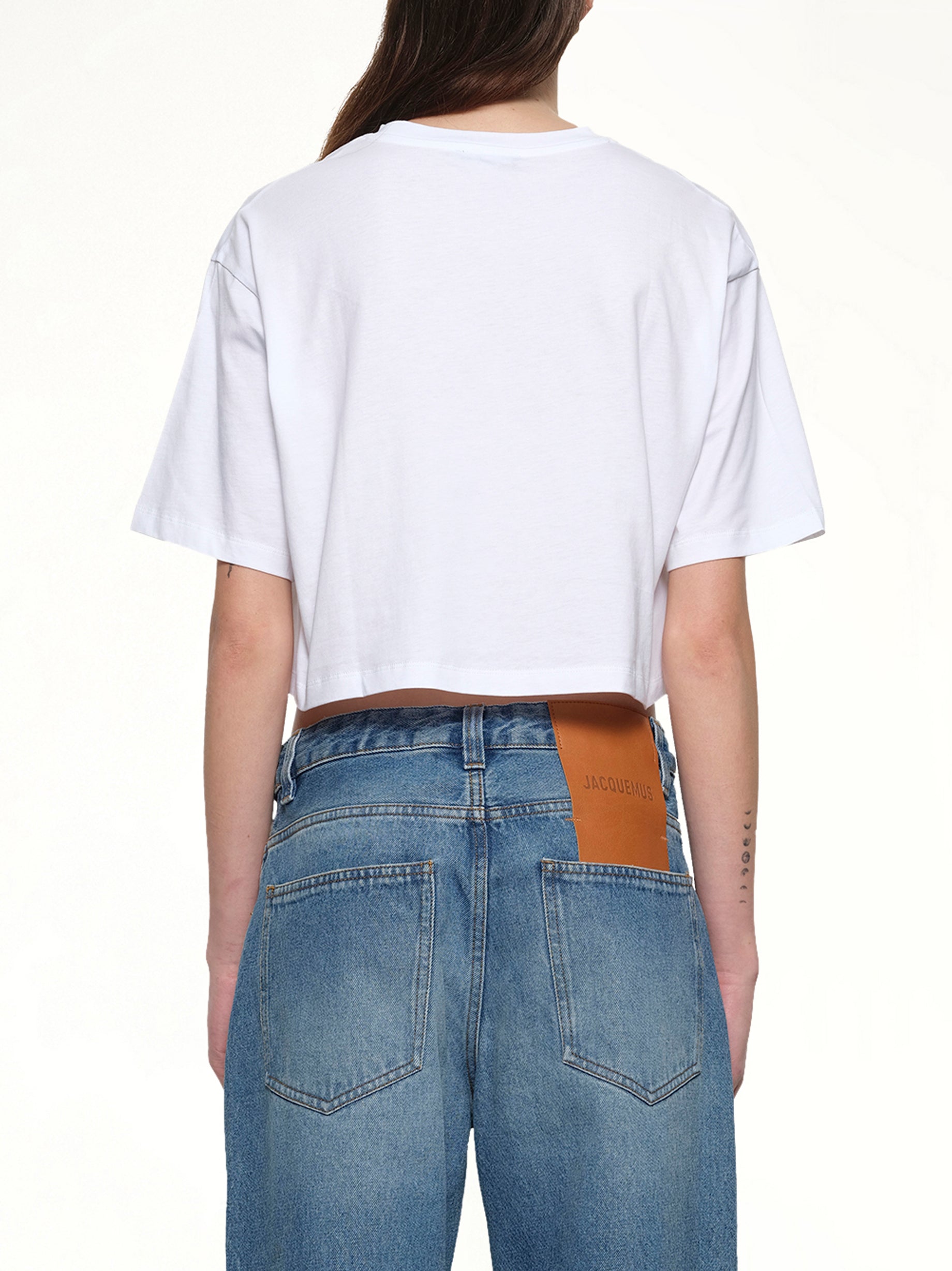 Short sleeves cropped T-shirt in white with round neck and relaxed fit The T-shirt also features a logo print at the front, which adds a recognisable element to the design. The T-shirt is an eco-friendly item that would be suitable for all casual occasion and easy to be paired with.