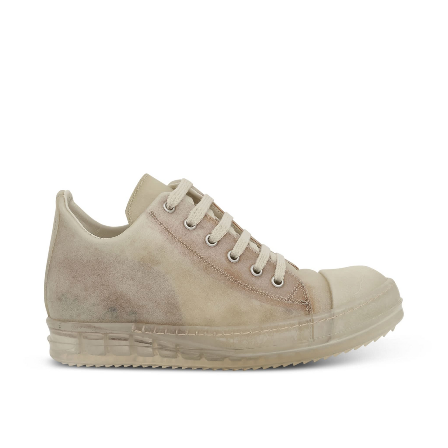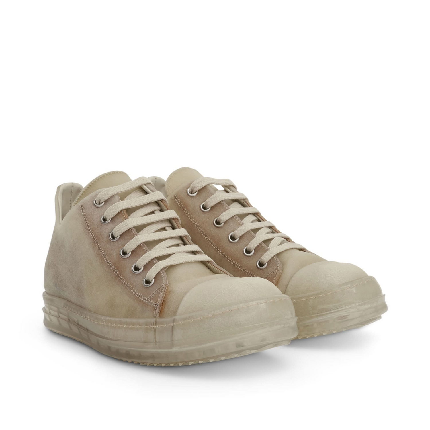 Low distressed-finish sneakers from Rick Owens featuring, calf leather in natural, distressed finish, round toe, front lace-up fastening and flat rubber sole.