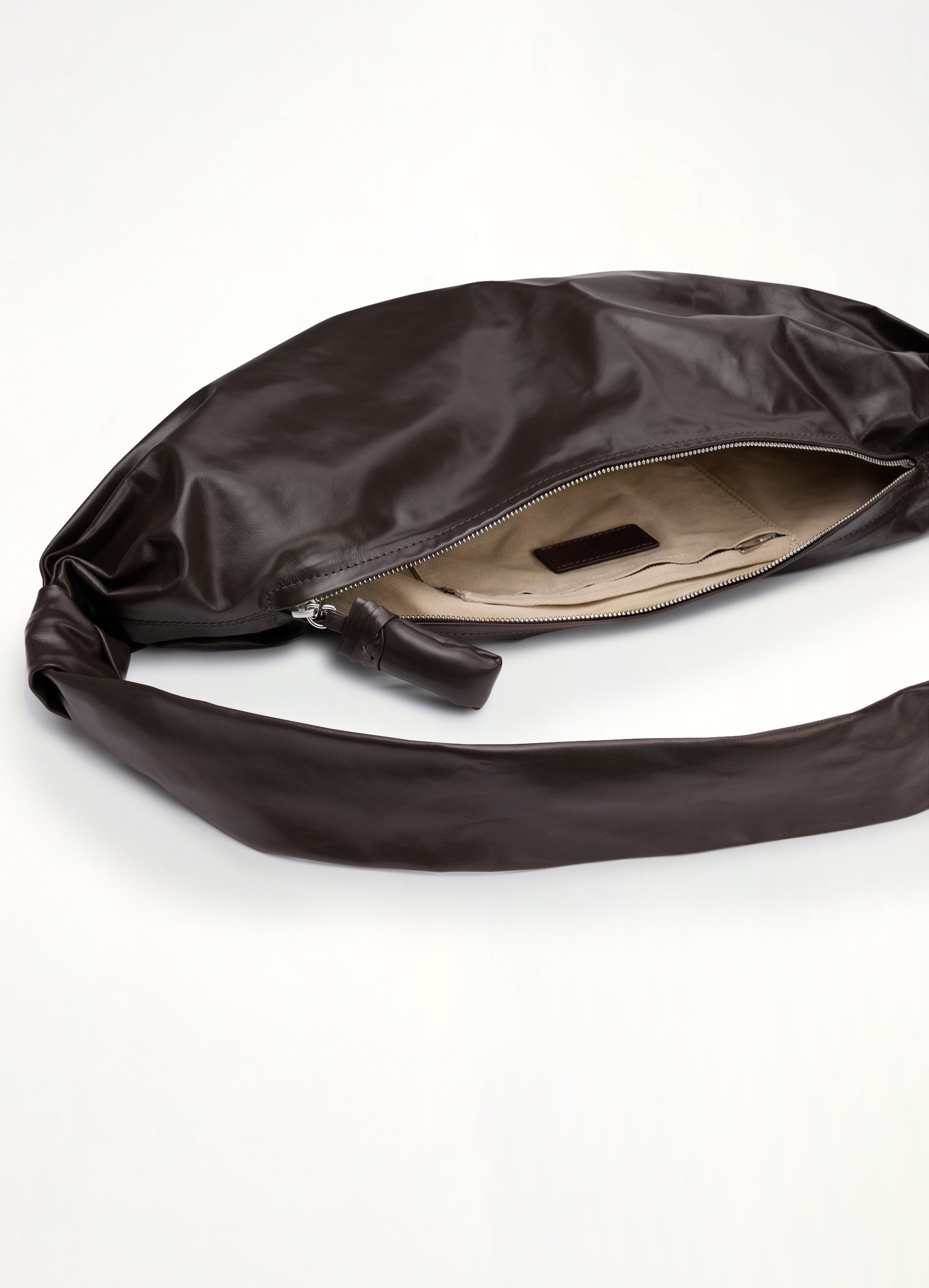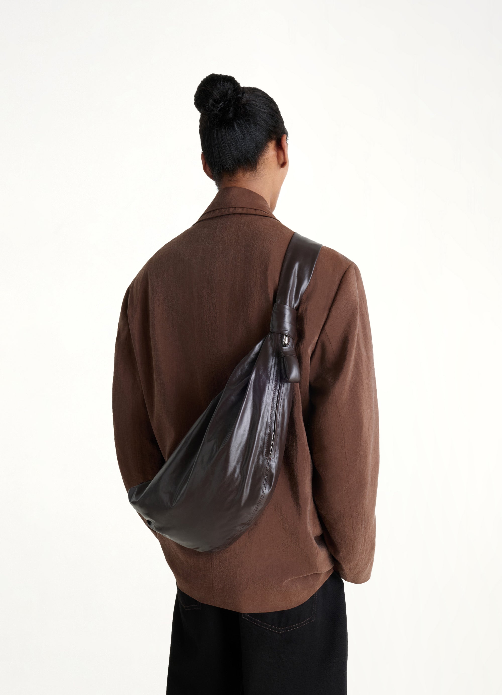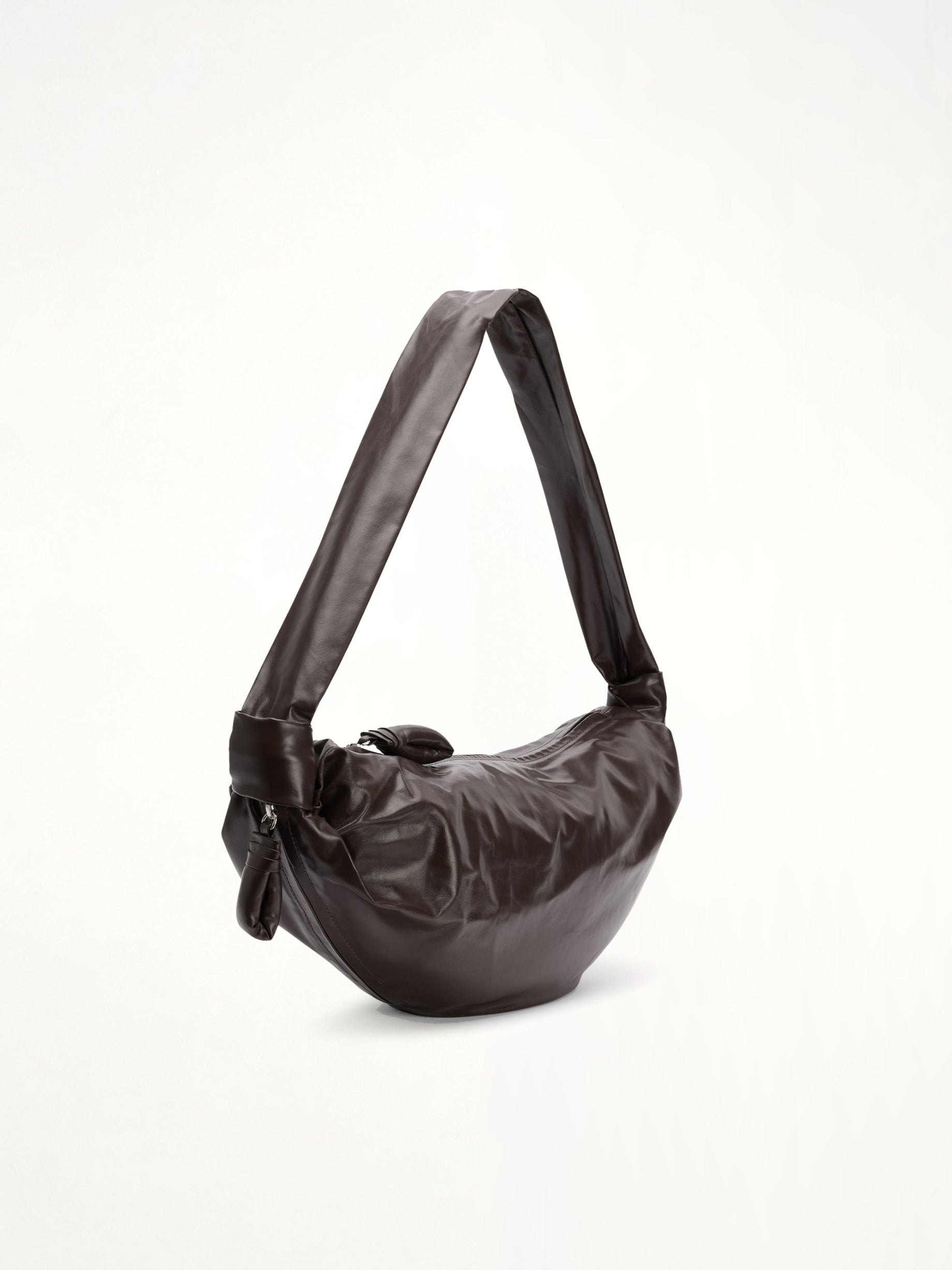 Lemaire's Medium Soft Croissant Bag in Dark Chocolate is a sculptural shoulder bag with a curved, folded silhouette that recalls the shape of a croissant. Its rich Dark Chocolate tone adds depth and sophistication, making it a versatile companion for both day and evening wear.
