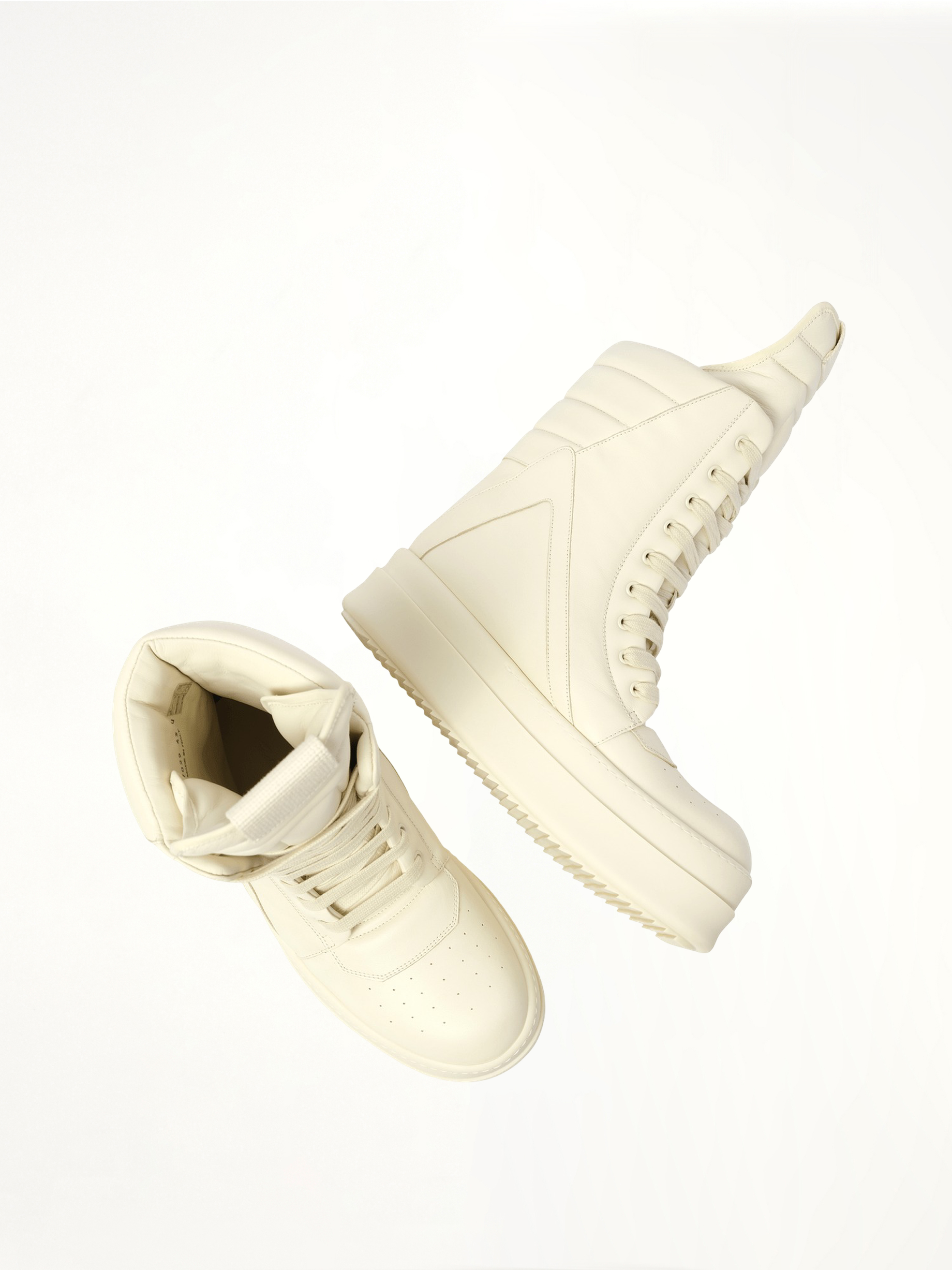 Rick Owens' Mega Geobasket in Milk/Milk takes the iconic Geobasket silhouette to new heights with its exaggerated proportions and unique milk-coloured leather. The high-top sneakers feature a bold, futuristic design with oversized detailing and distinctive stitching, making them a statement piece for any wardrobe.