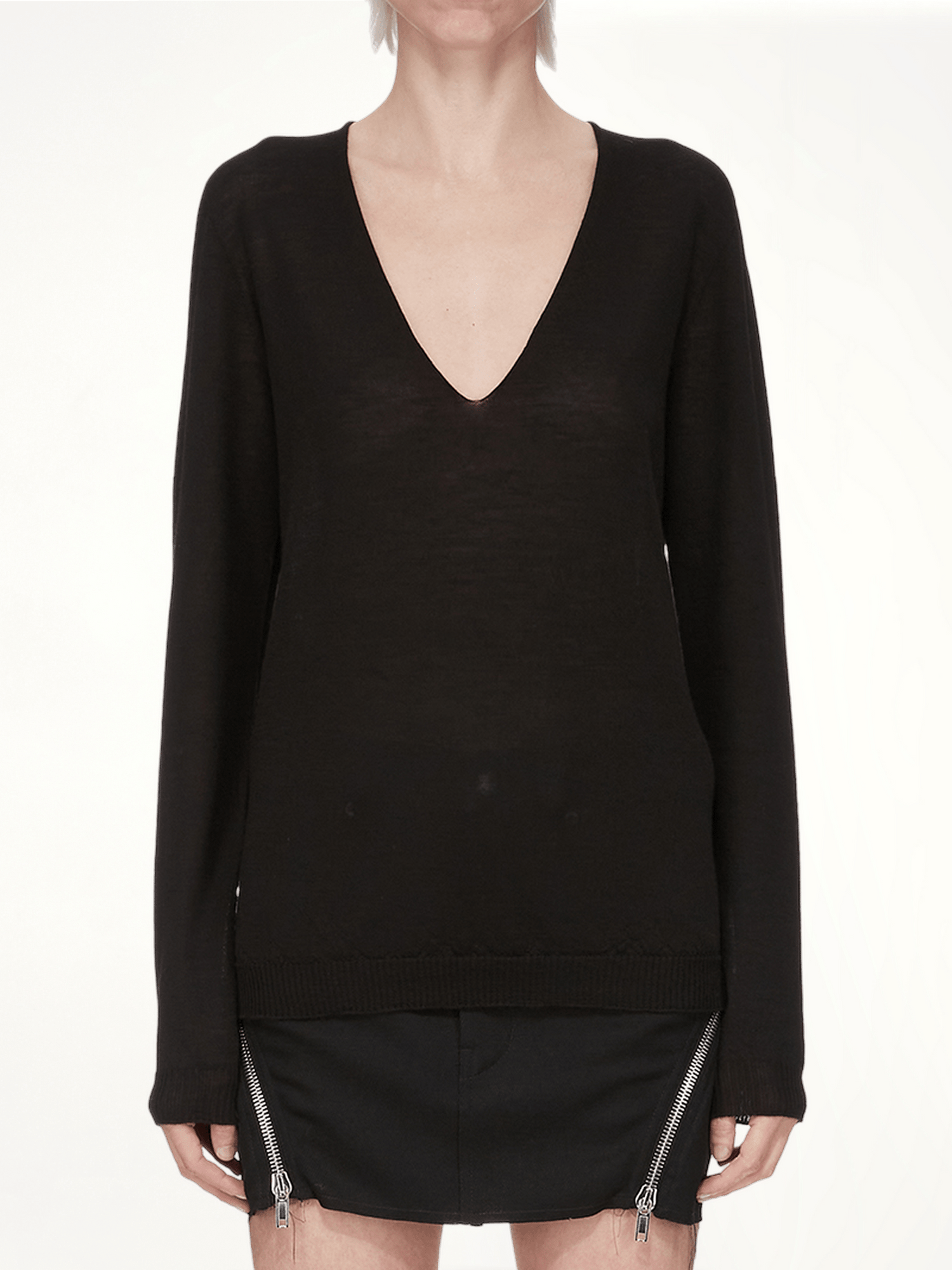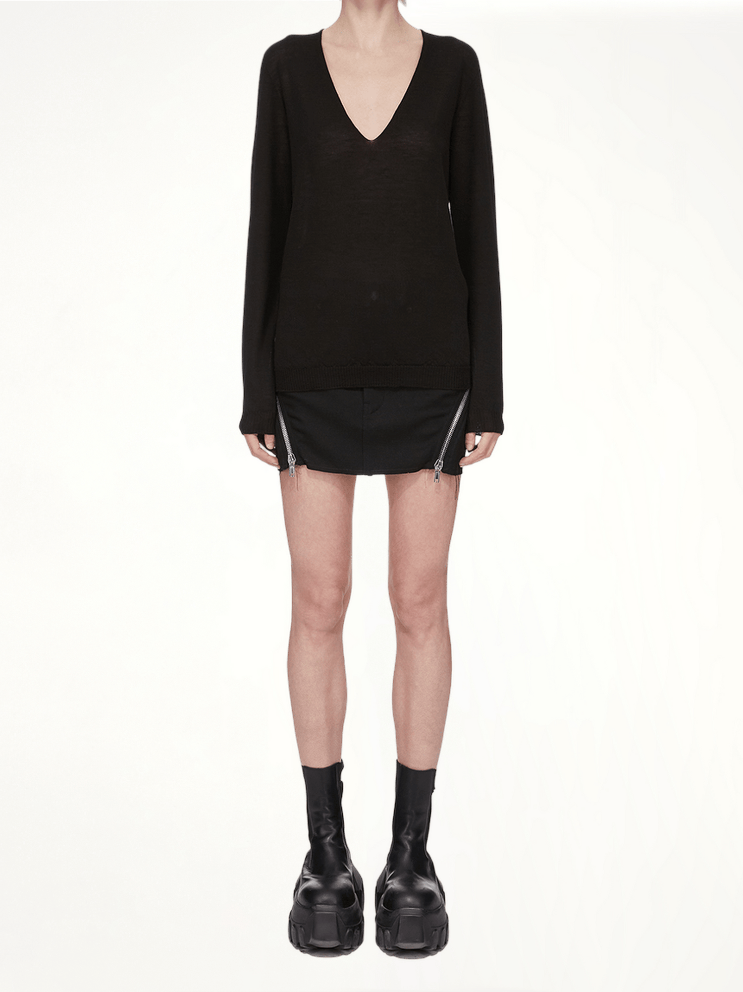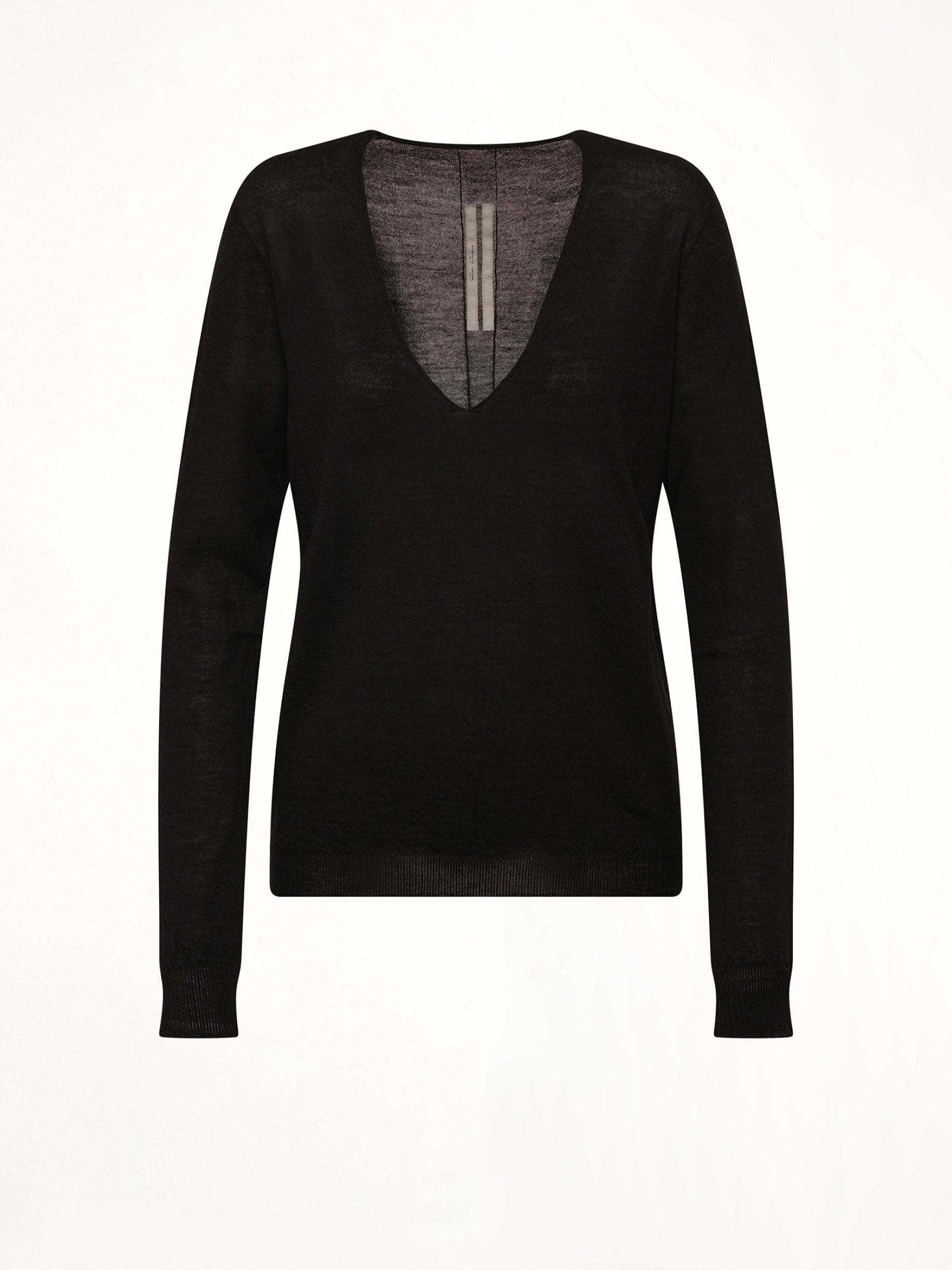 Rick Owens's Merino V-Neck Pull in Black is a sophisticated and versatile piece, perfect for any wardrobe. Its sleek design and luxurious feel make it an essential for both casual and formal settings.