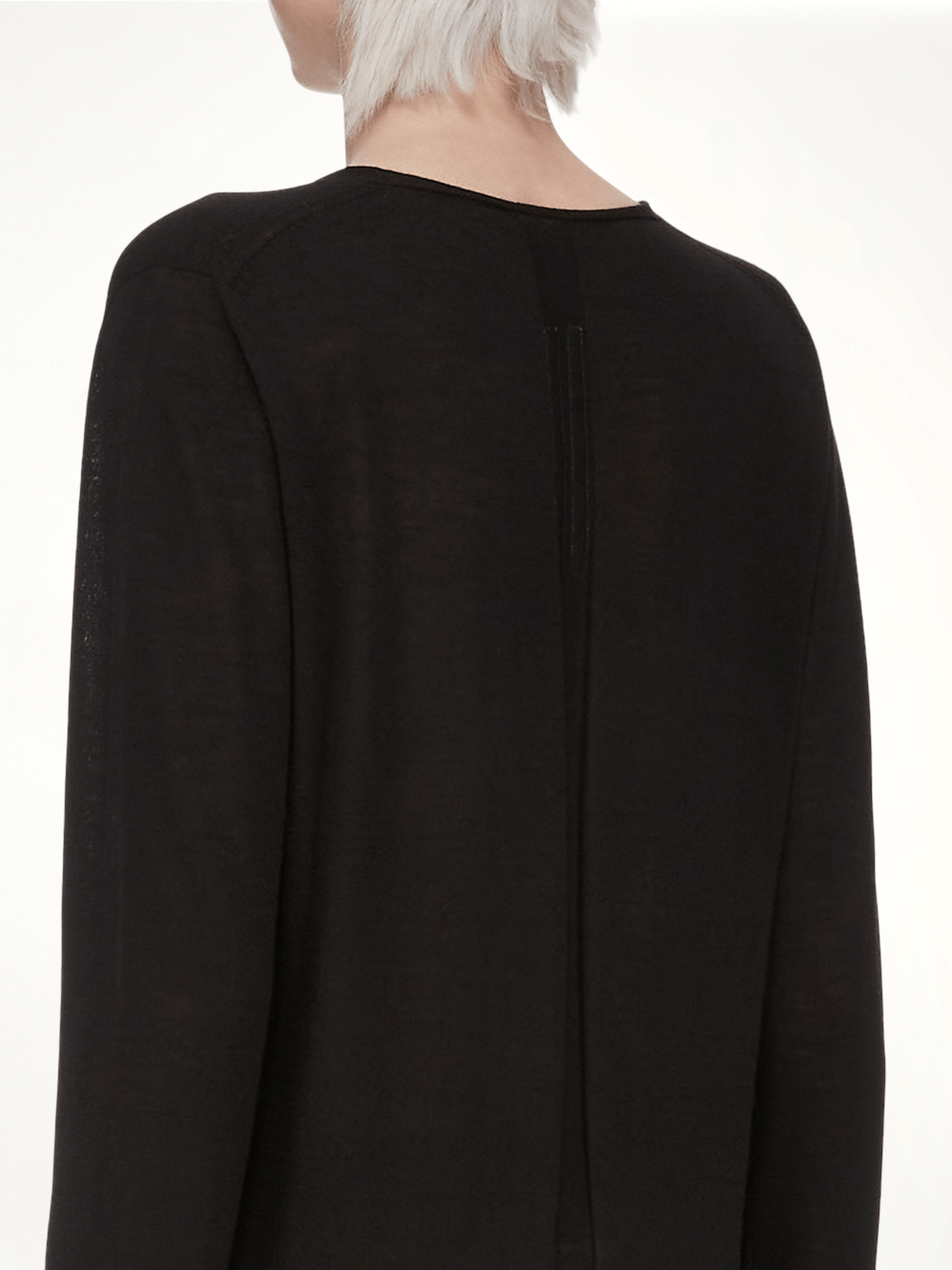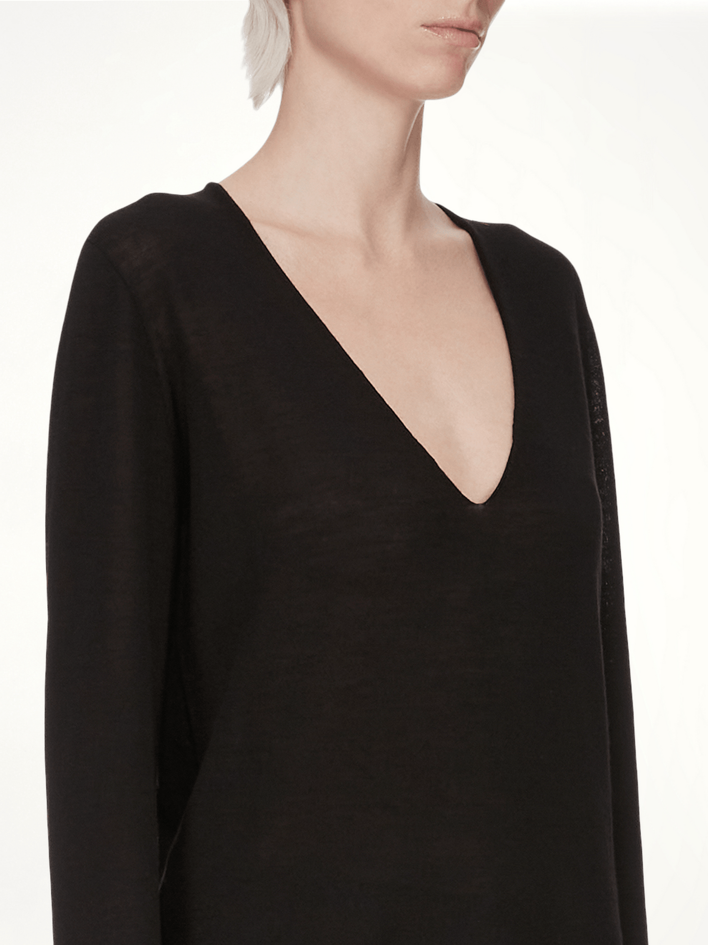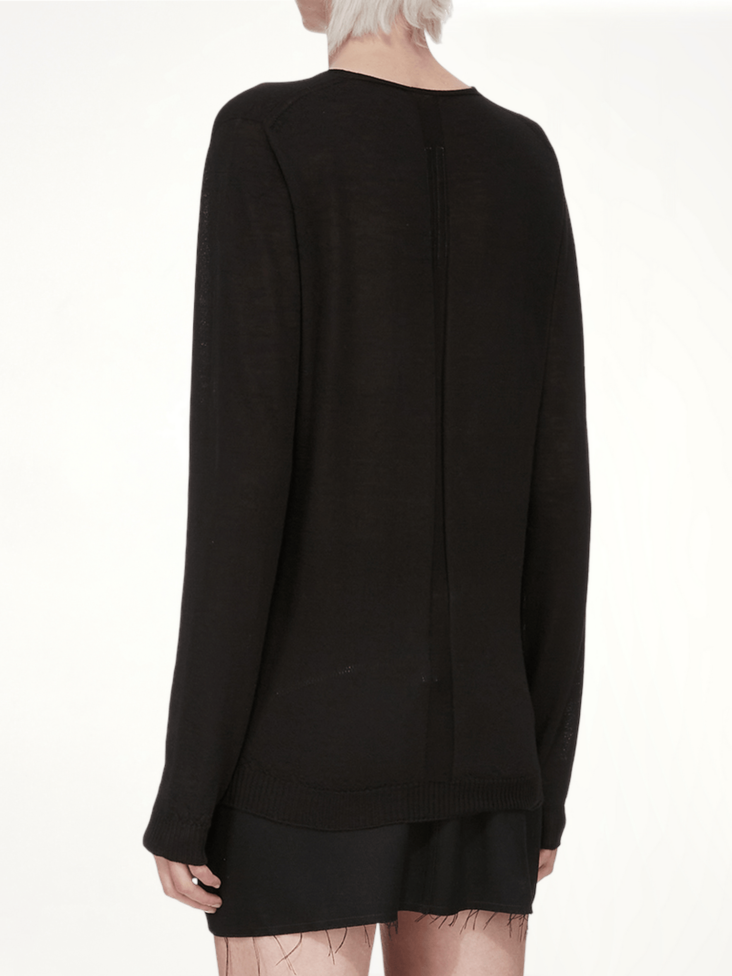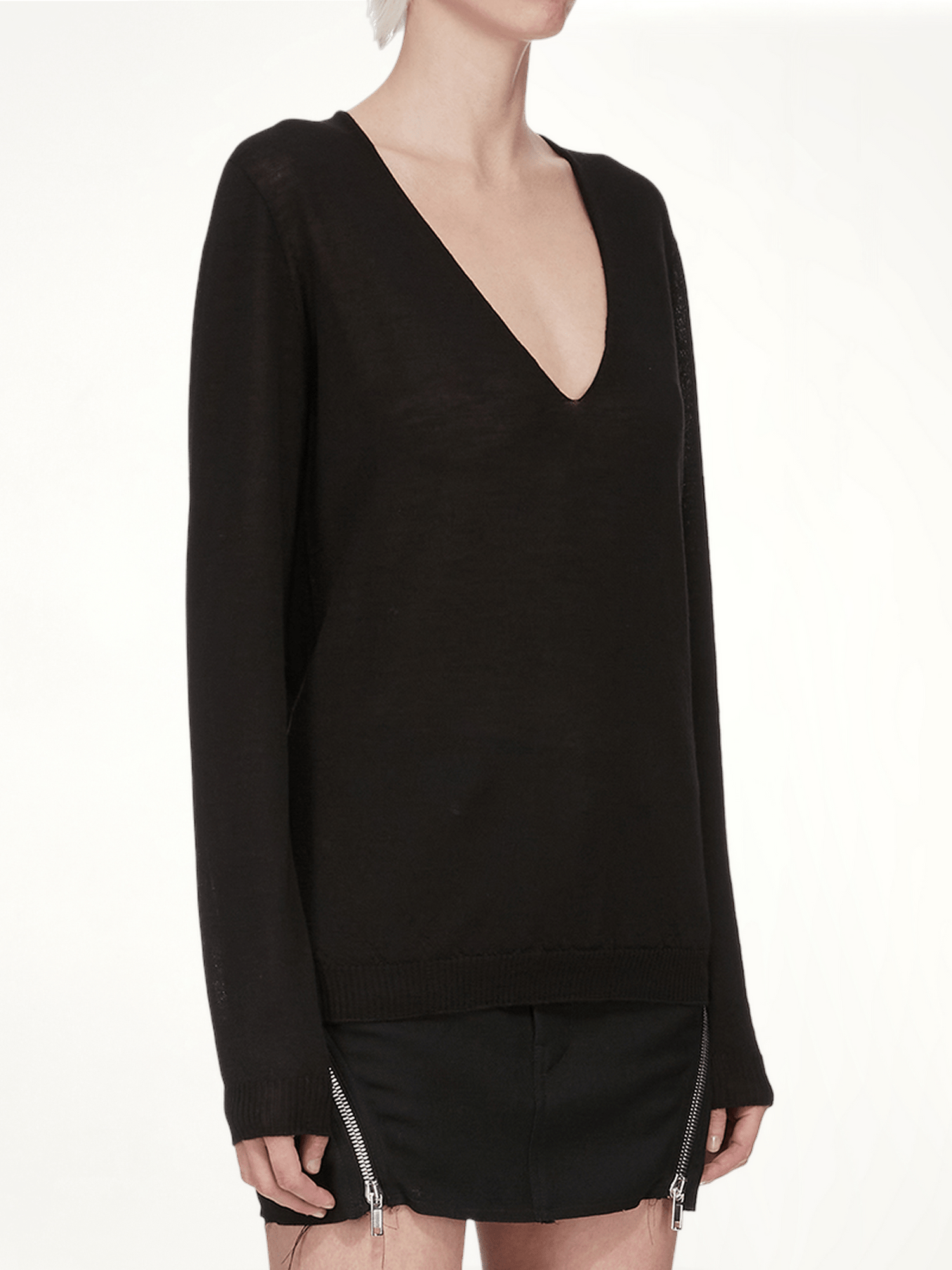 Rick Owens's Merino V-Neck Pull in Black is a sophisticated and versatile piece, perfect for any wardrobe. Its sleek design and luxurious feel make it an essential for both casual and formal settings.