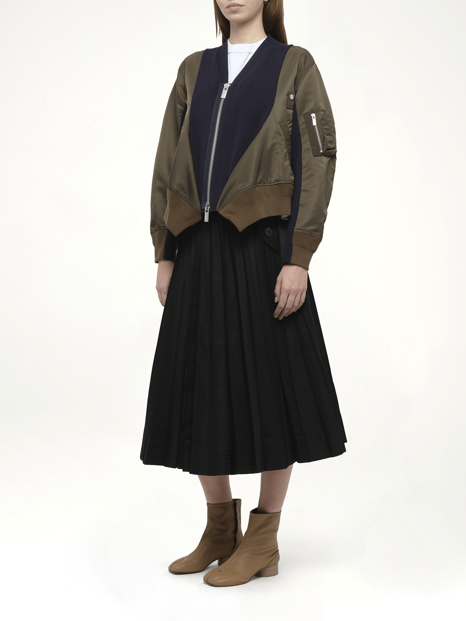 SACAI's Nylon Twill x Knit Cardigan in Dark Khaki/Navy is a sophisticated blend of textures and colors, offering a modern twist on a classic silhouette. This versatile piece effortlessly transitions from casual to chic, making it a must-have addition to any wardrobe.