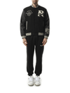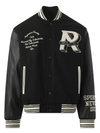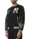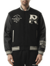 - Classic letterman silhouette with snap-button front closure, ribbed collar, cuffs, and hem
