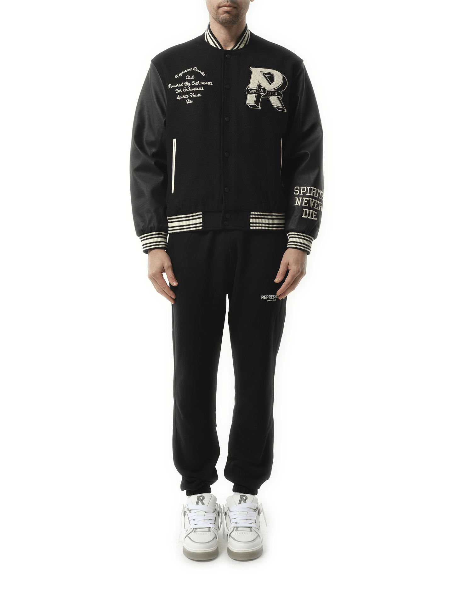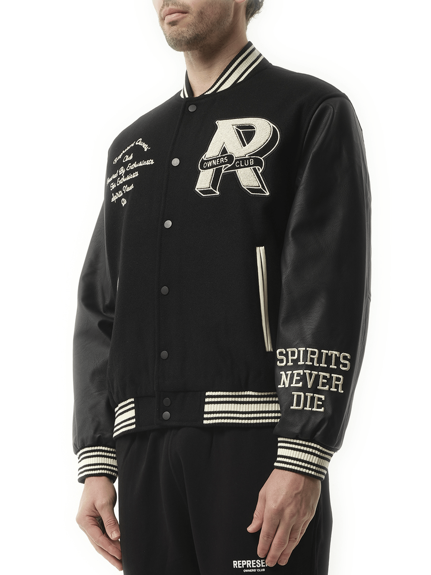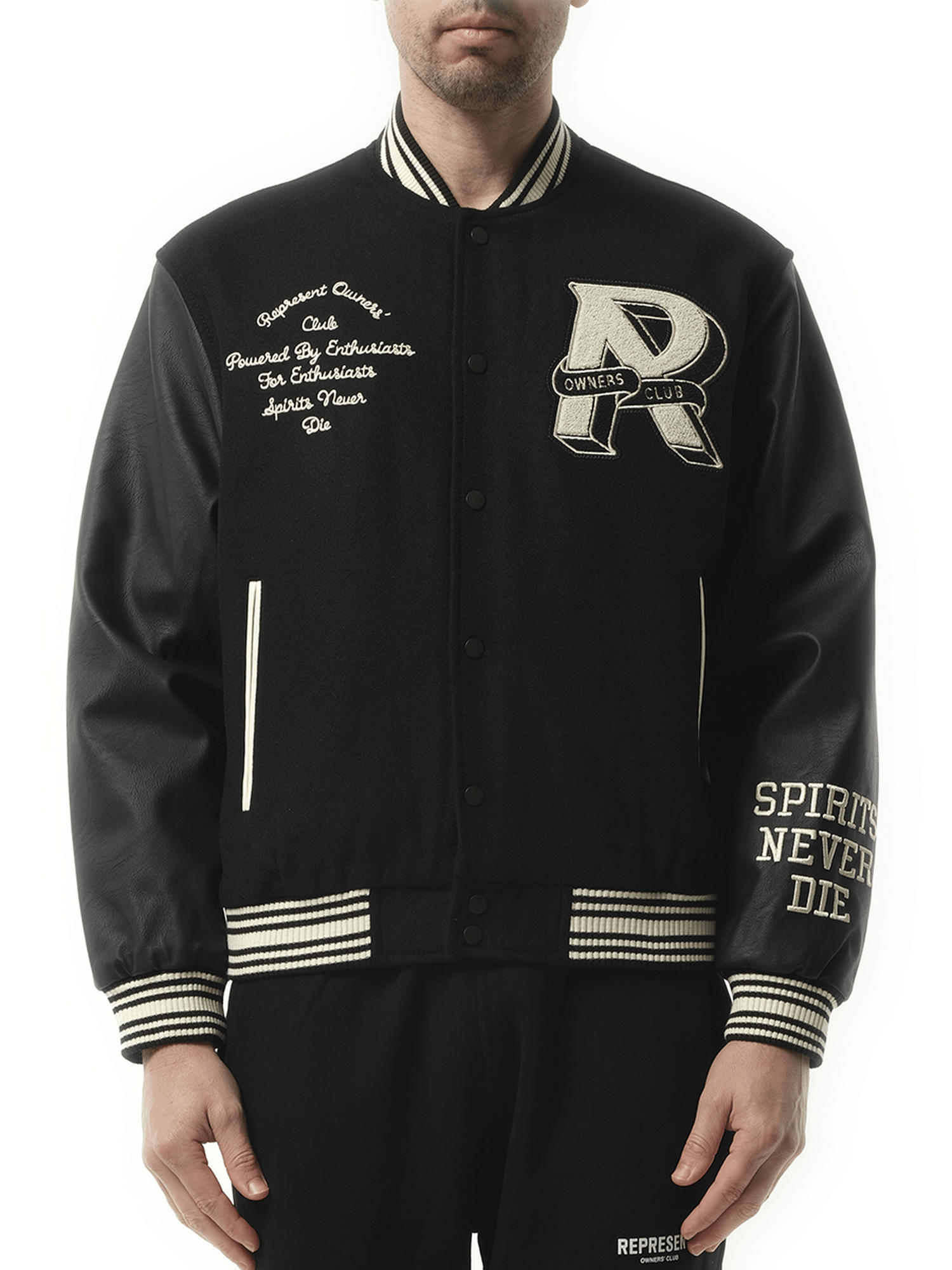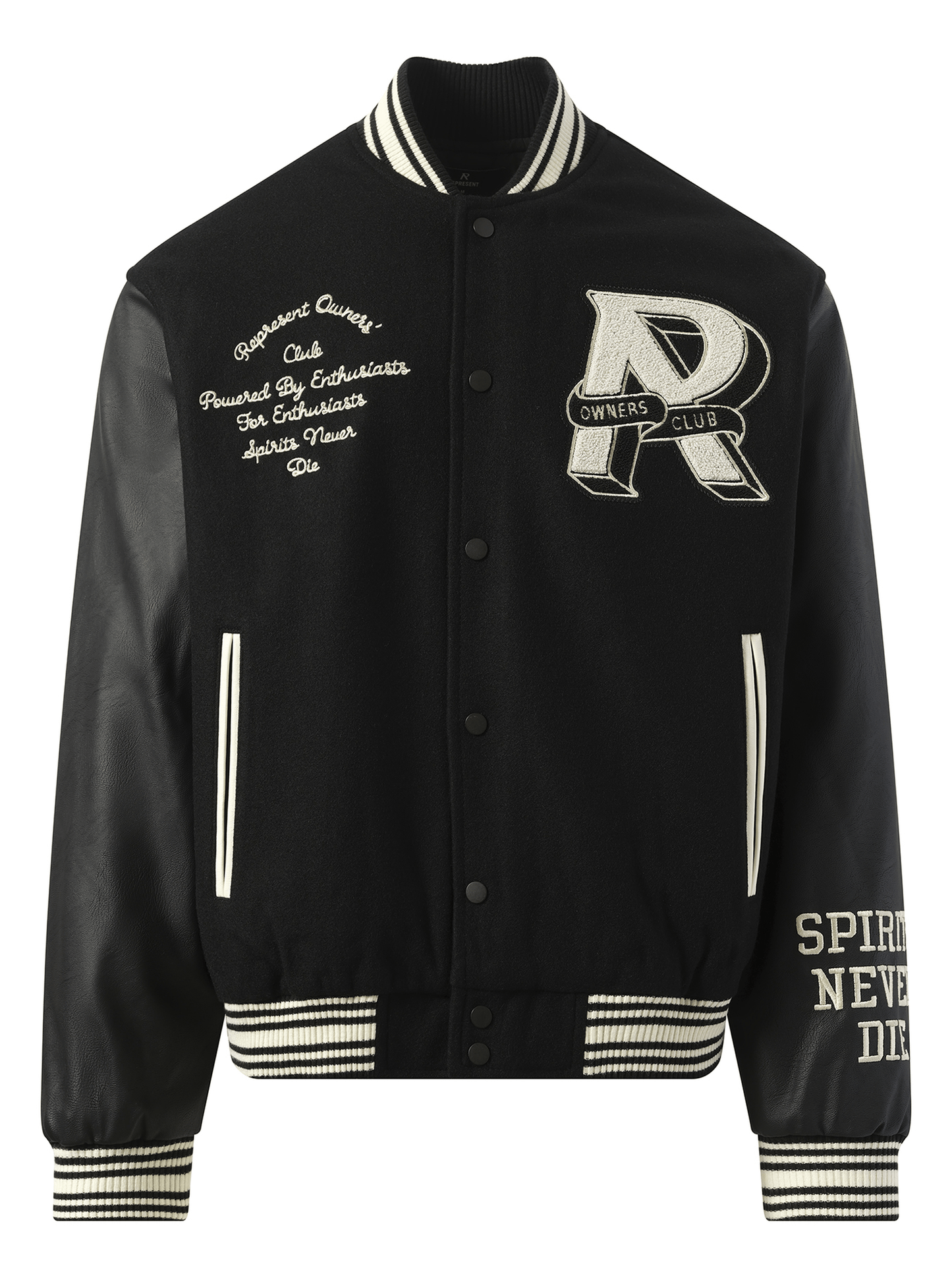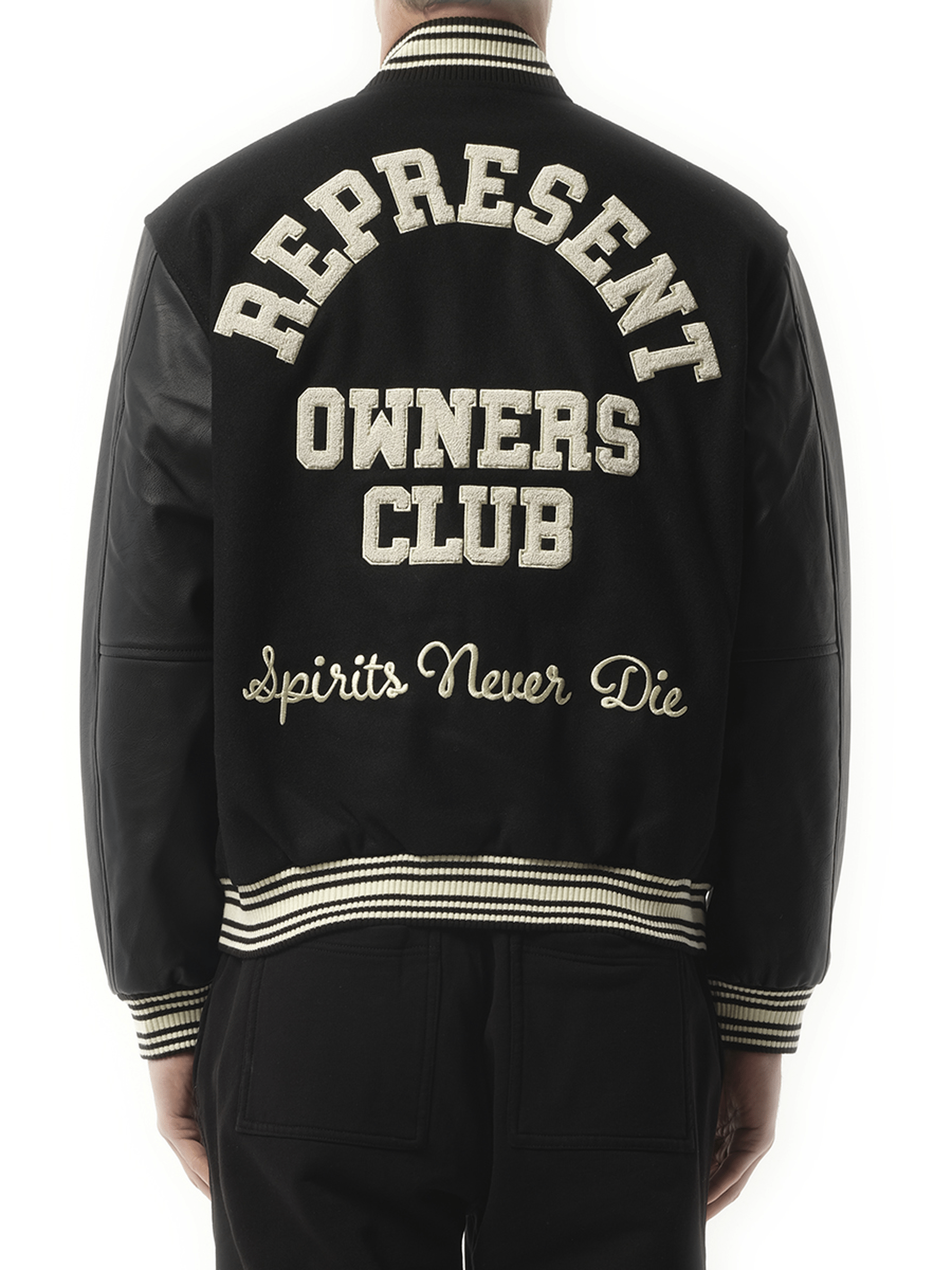 Represent's Owners Club Varsity Jacket in Black redefines the classic letterman jacket with a modern streetwear twist. Crafted from a premium wool blend with faux leather sleeves, this jacket combines warmth, style, and comfort with a slightly cropped, boxy fit.