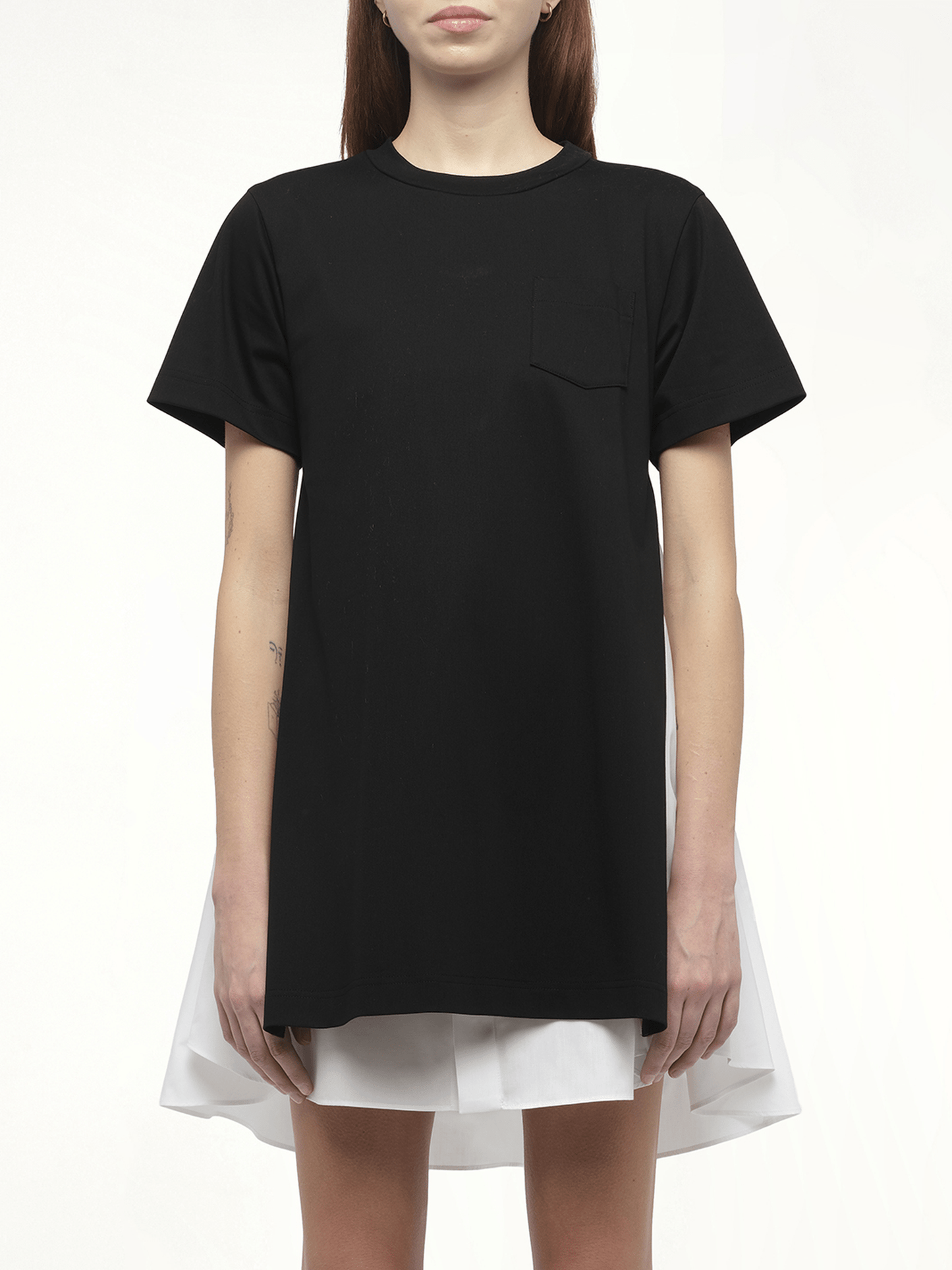 SACAI's Poplin x Cotton Jersey Dress in Black/Off White is a sophisticated blend of modern design and classic elegance. This versatile piece effortlessly transitions from day to night, offering a chic silhouette for any occasion.