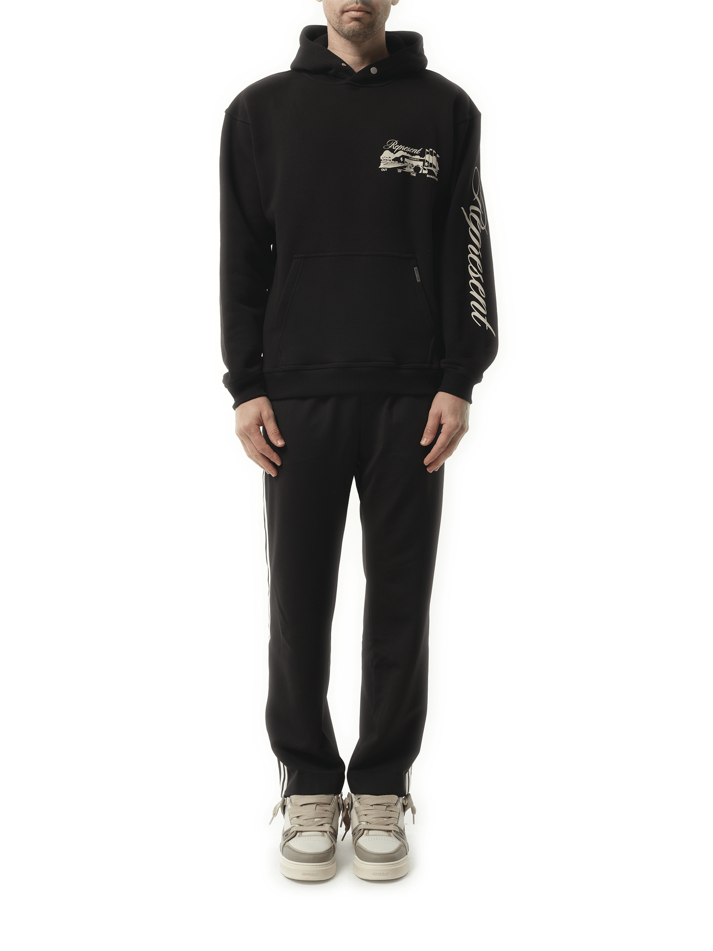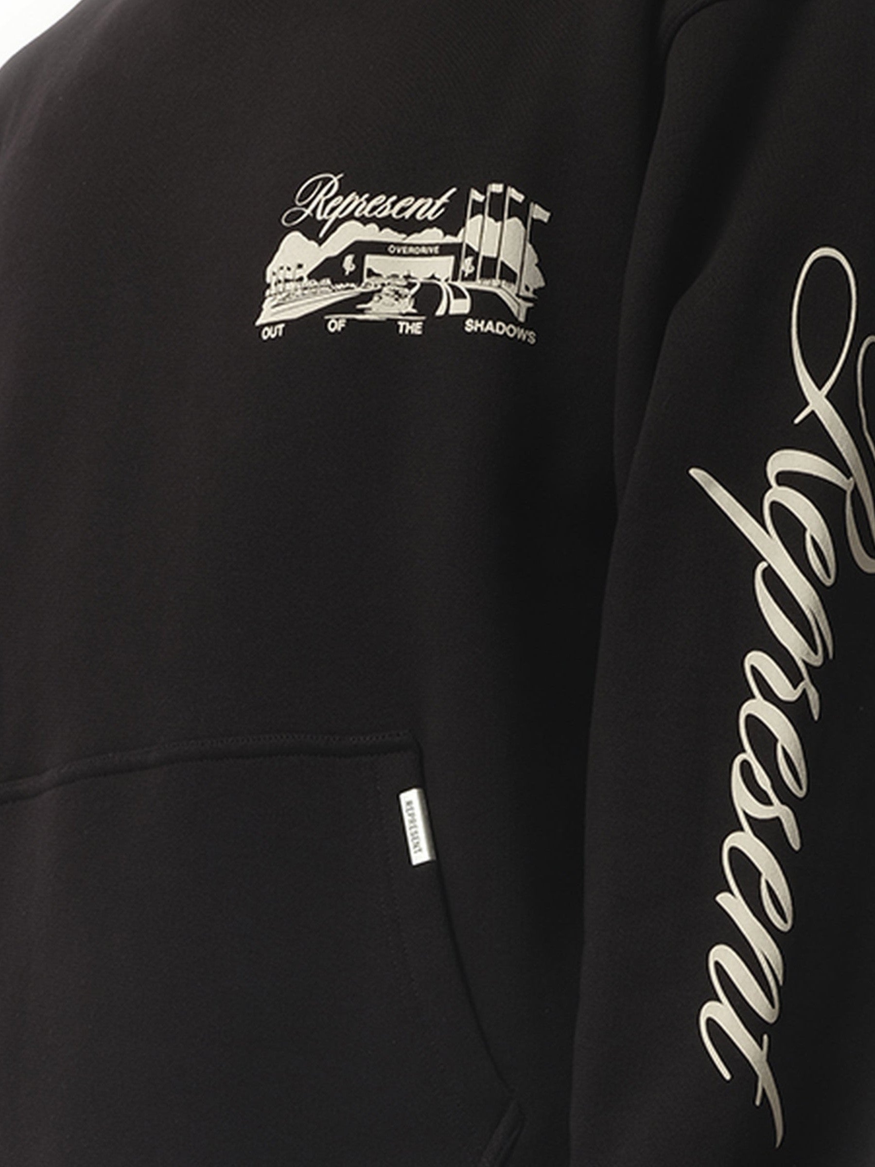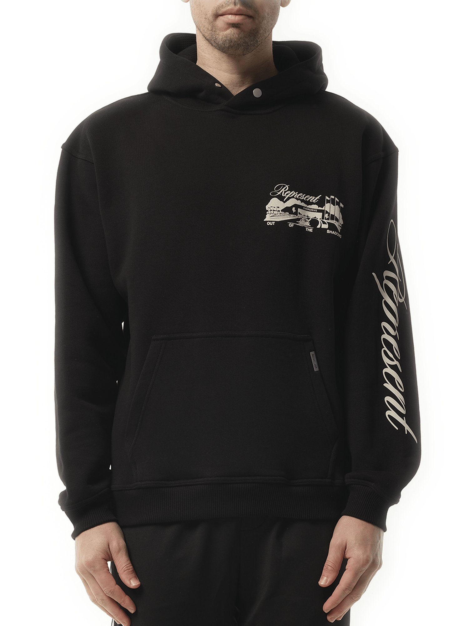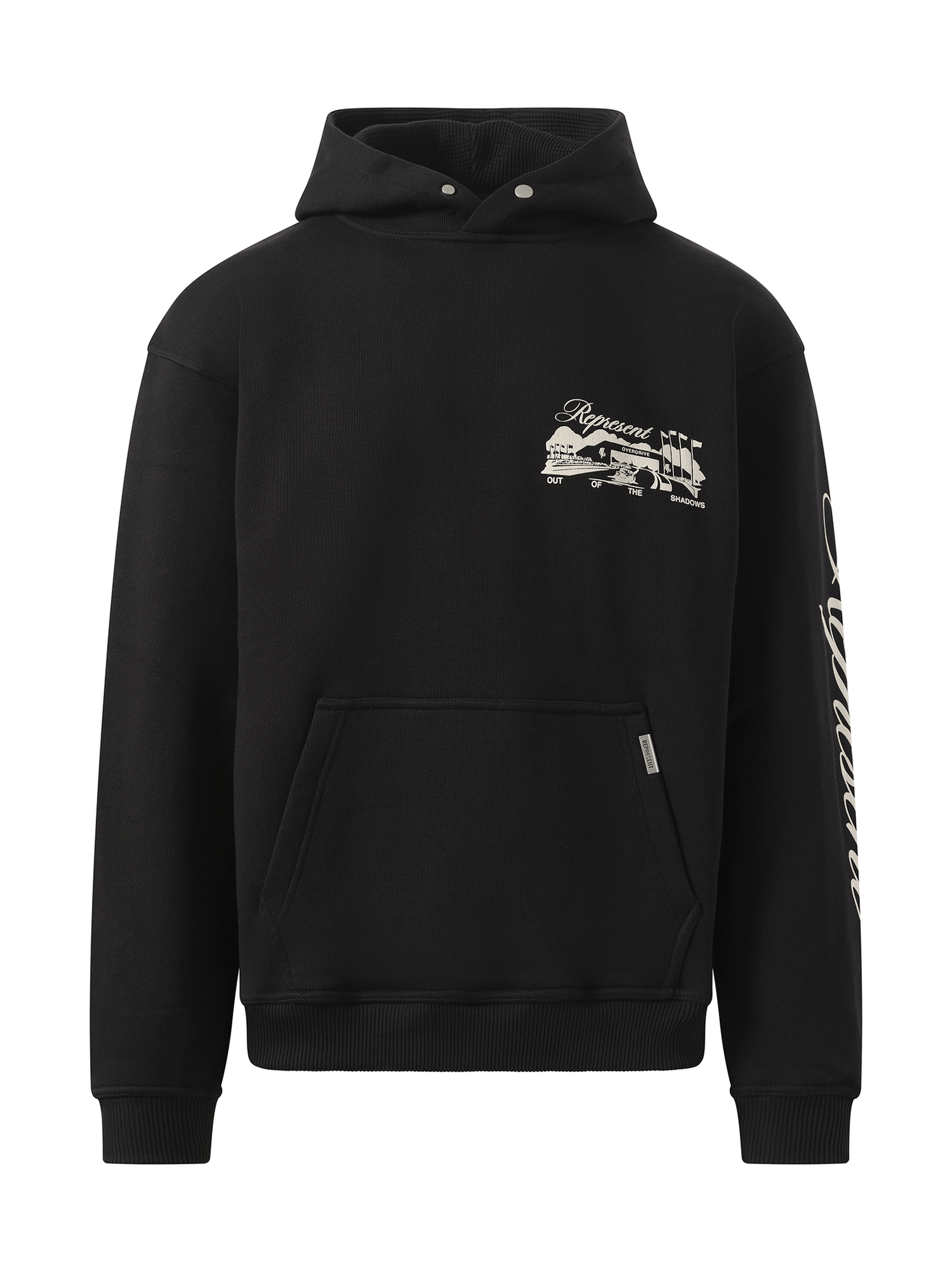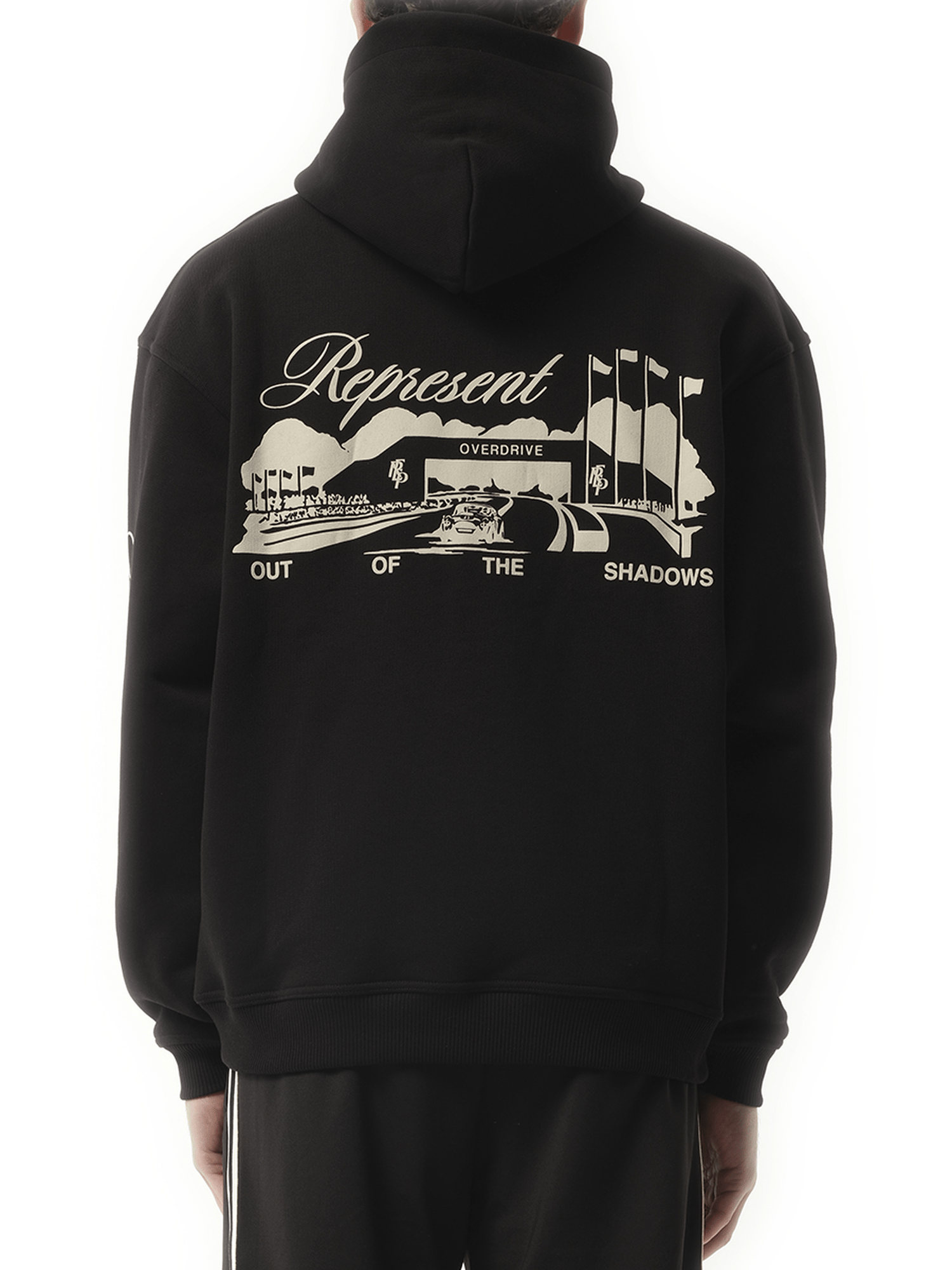 Represent's Raceway Hoodie in Jet Black combines comfort with distinctive street style. This oversized hoodie is crafted from heavyweight cotton, featuring a bold "Raceway" graphic on the front, with additional branding on the back and sleeve.