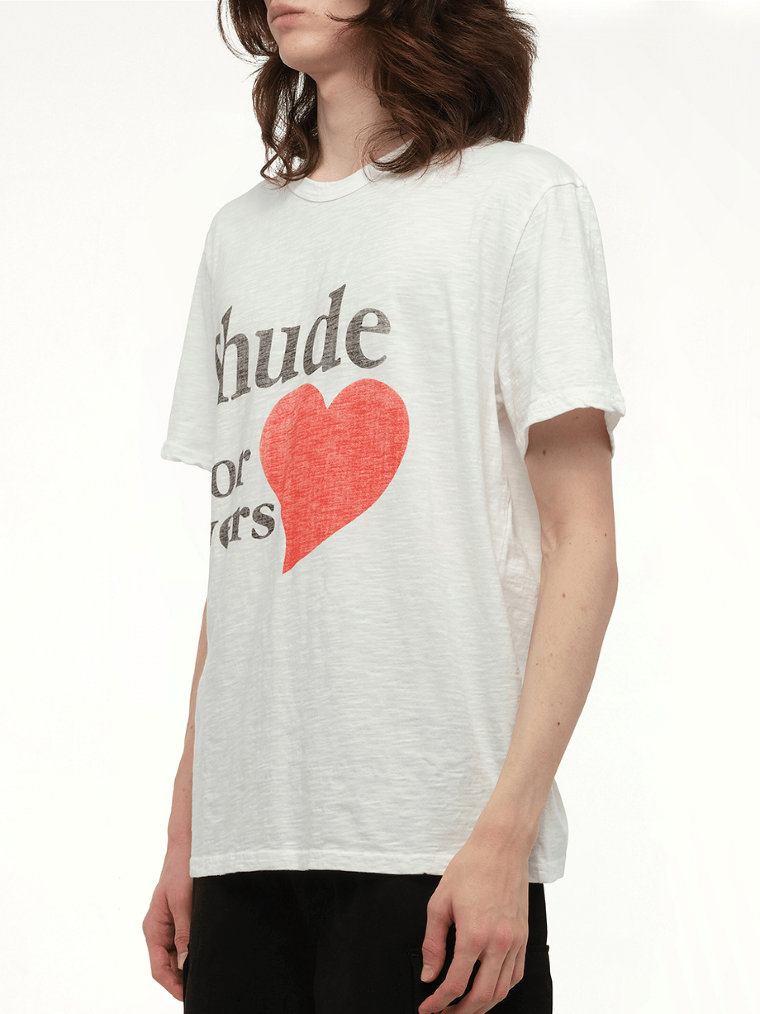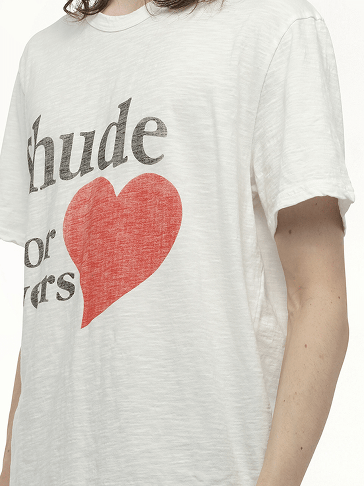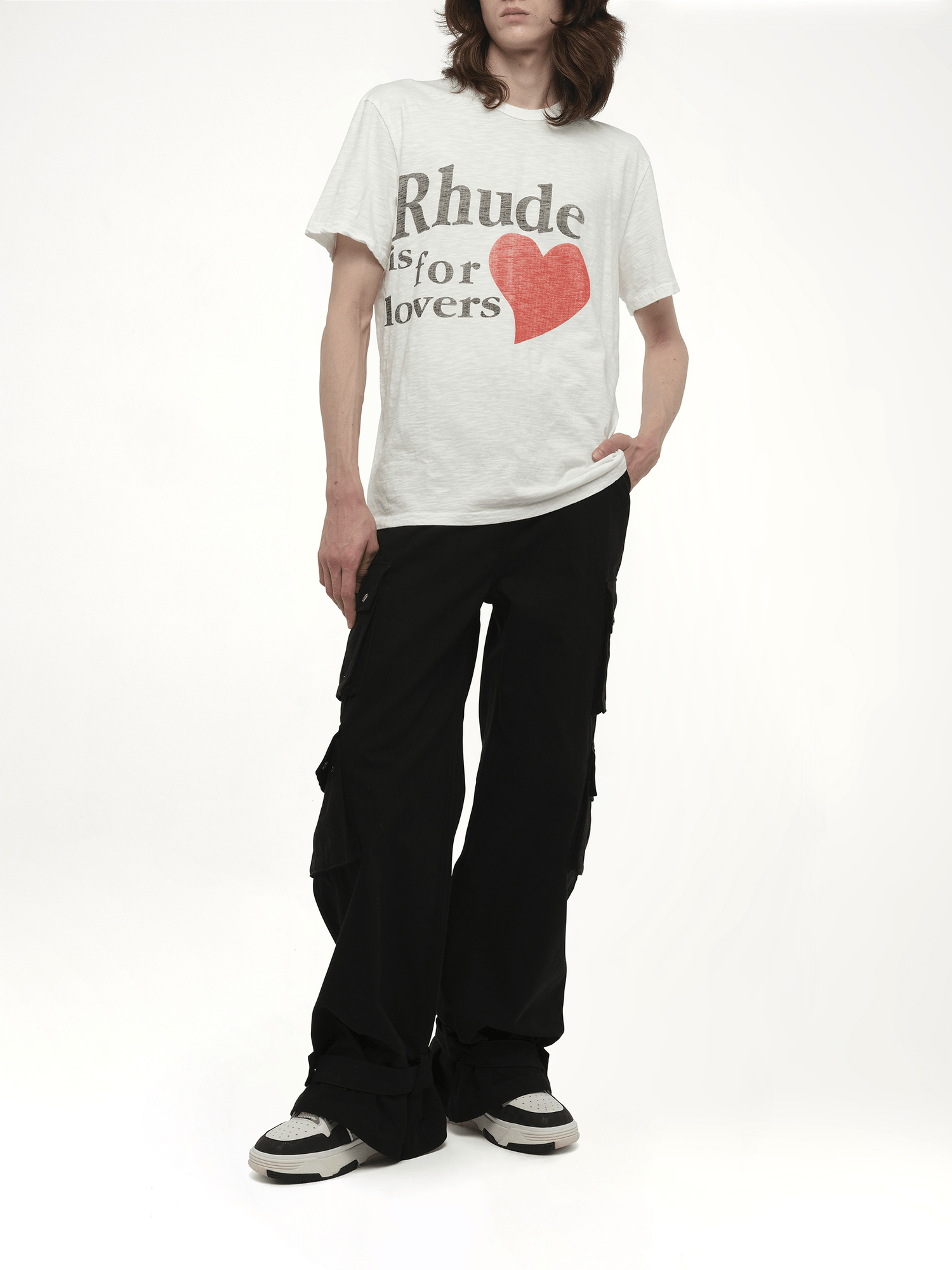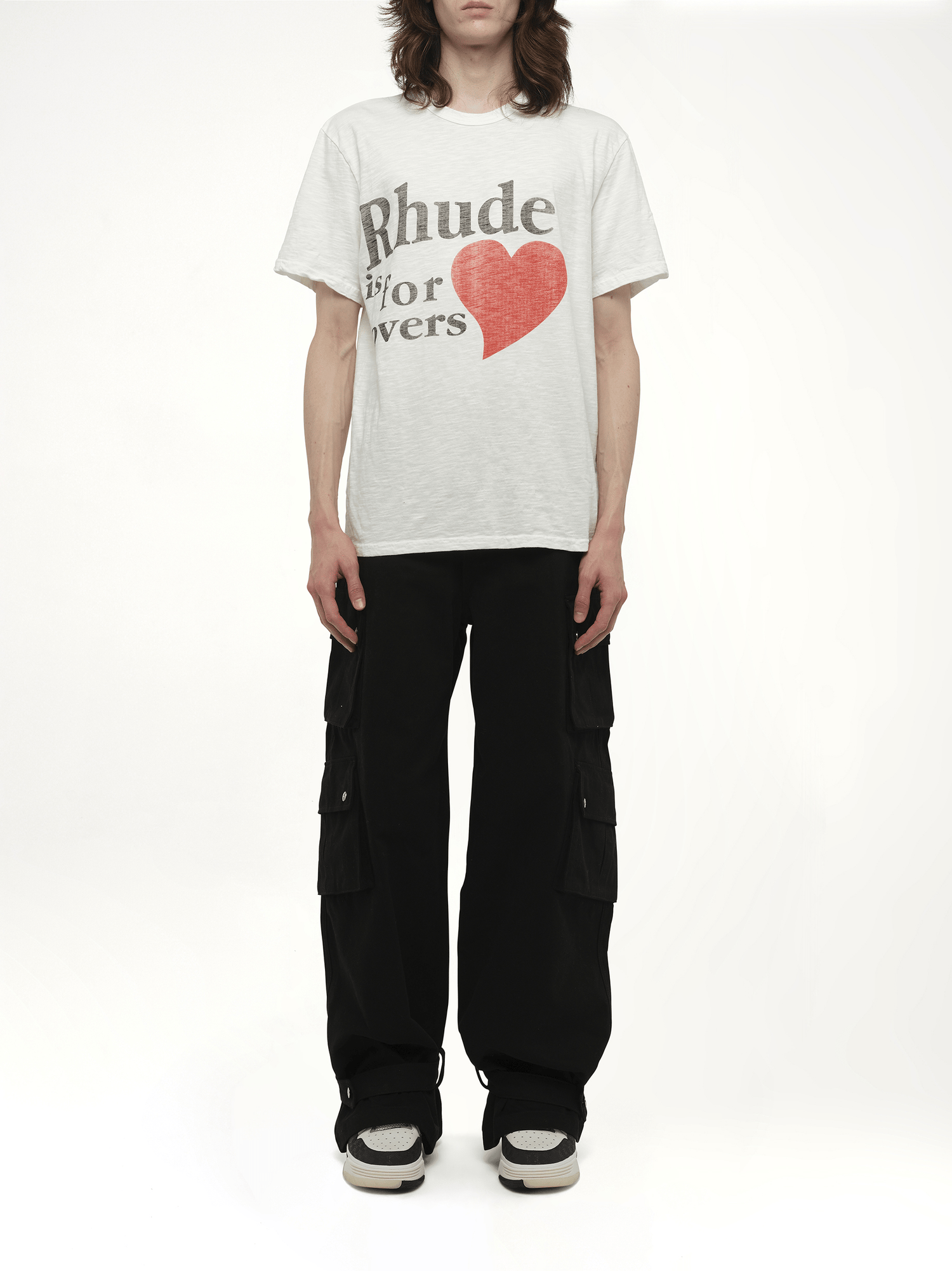 RHUDE's Rhude Lovers Slub Tee in White is a stylish and versatile addition to any wardrobe. Perfect for casual outings or layering, this tee offers a modern fit and timeless appeal.