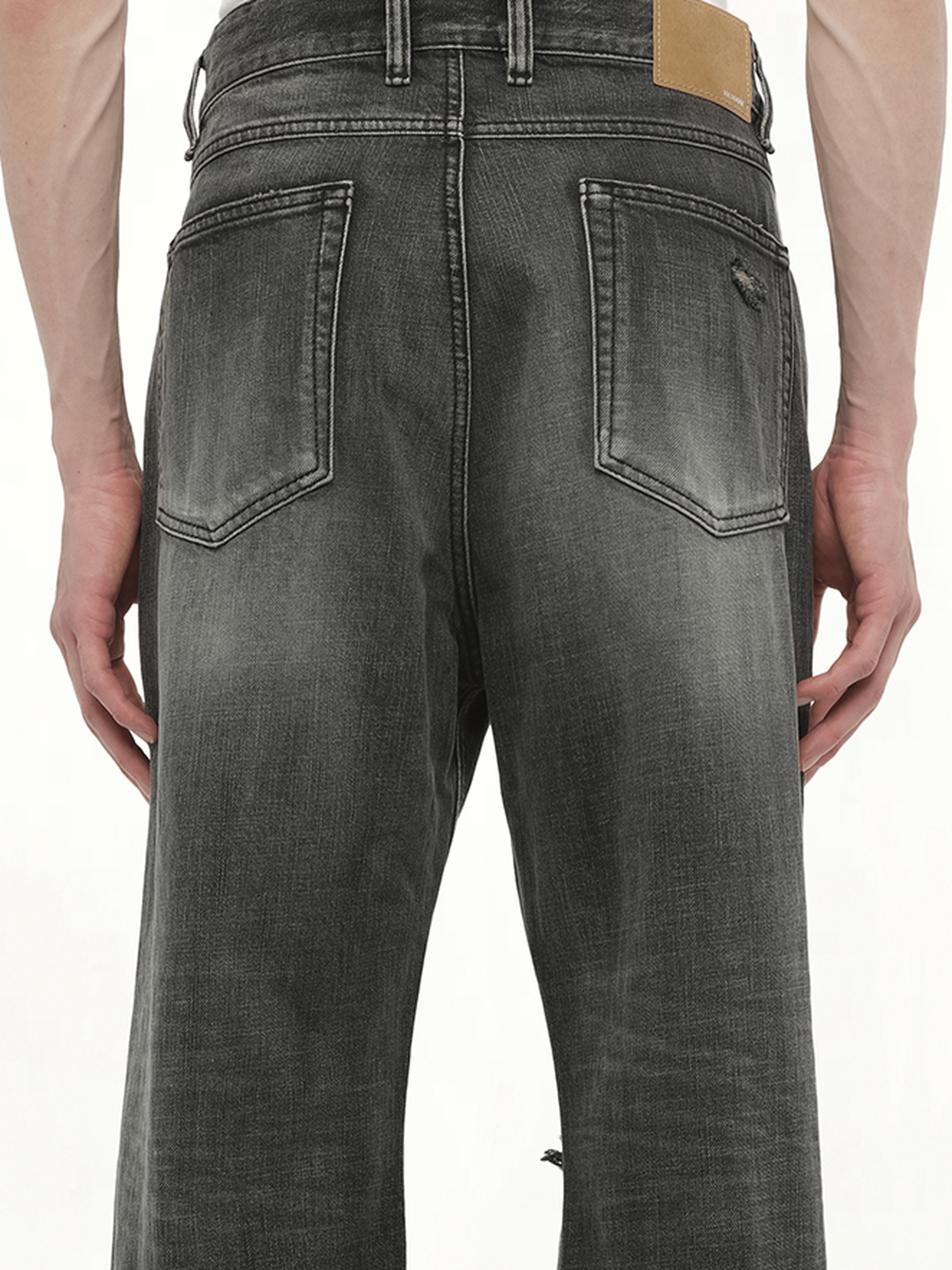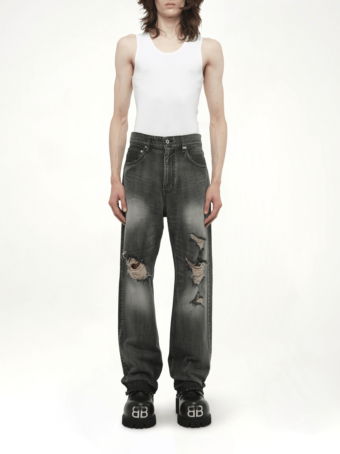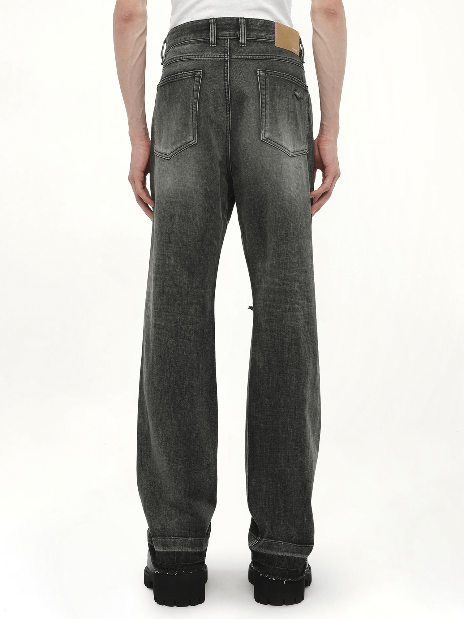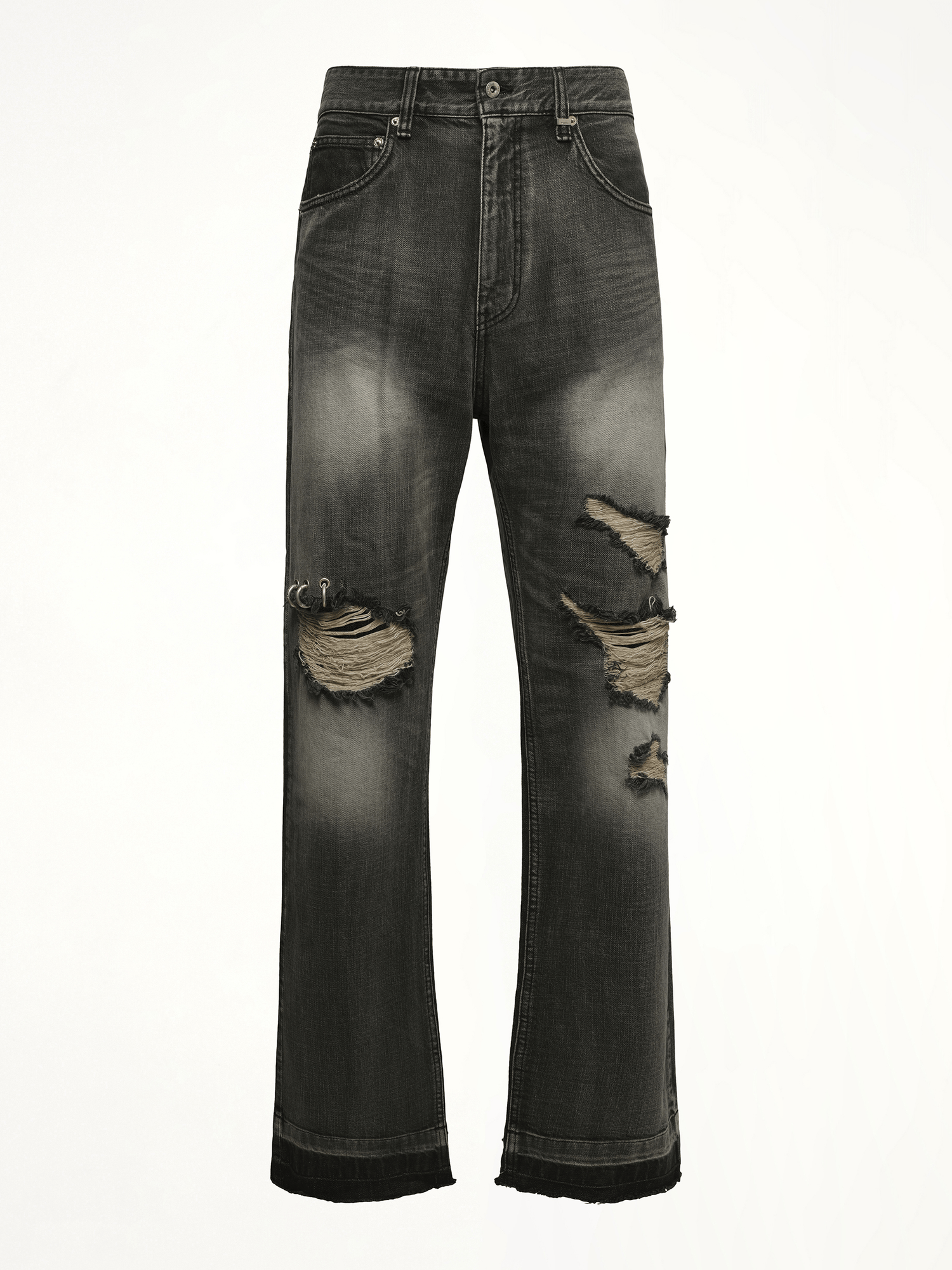 WE11DONE's Ripped Denim Trouser in Black offers a bold and edgy style statement with its distressed detailing and sleek silhouette. Perfect for elevating any casual outfit, these trousers are a must-have for fashion-forward individuals.