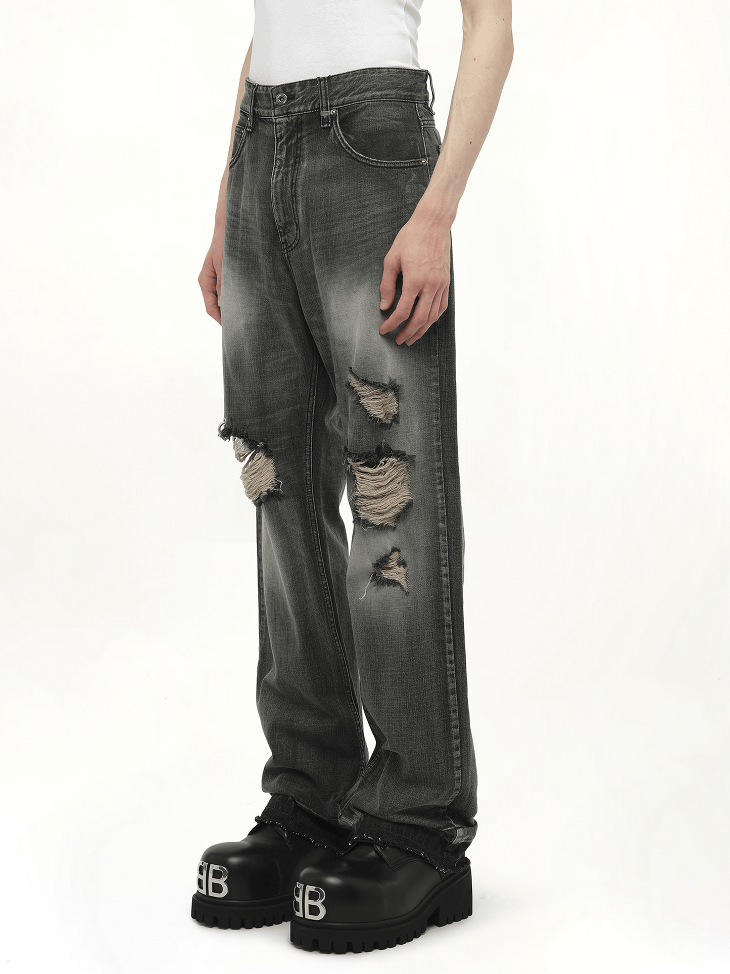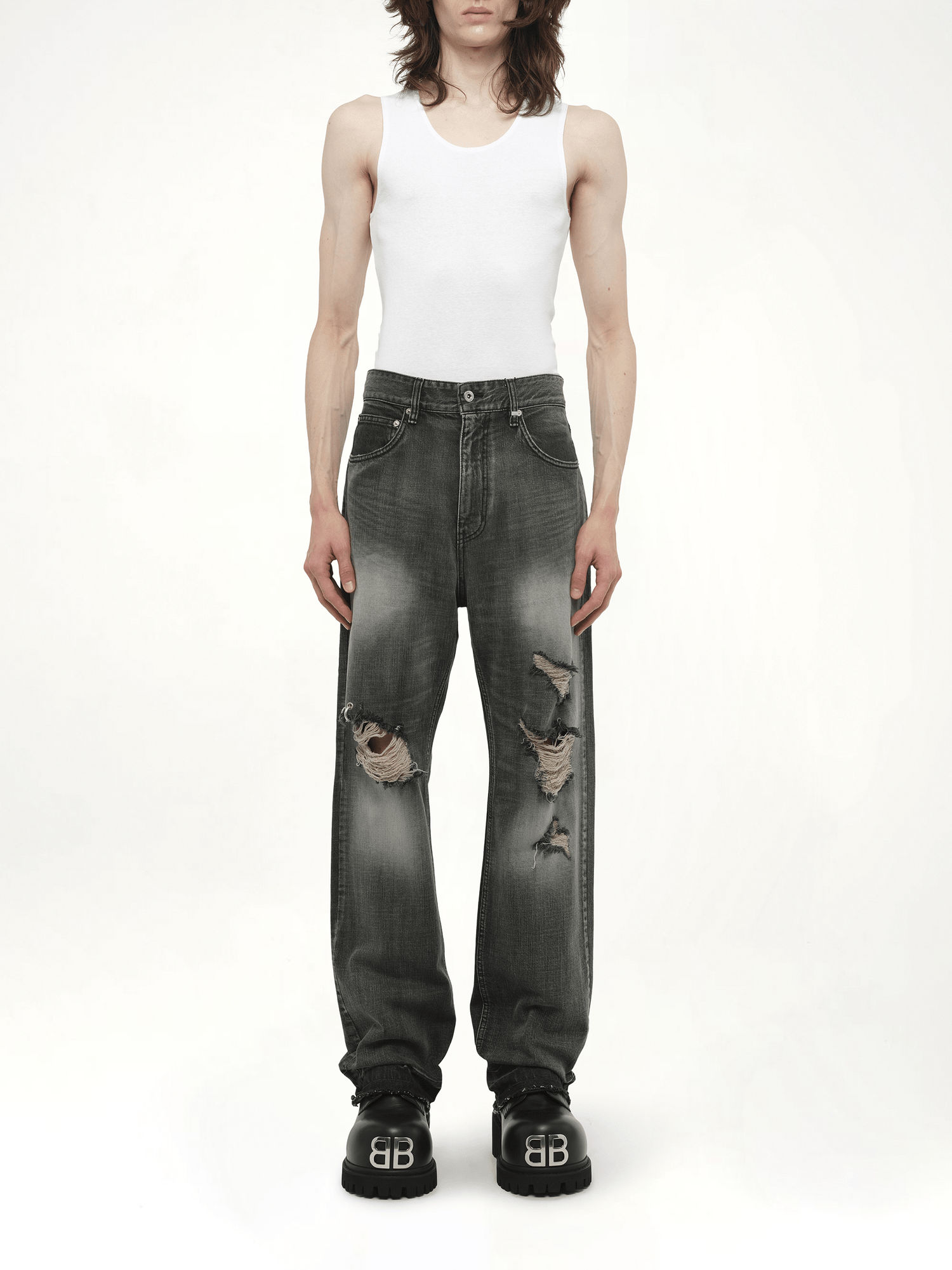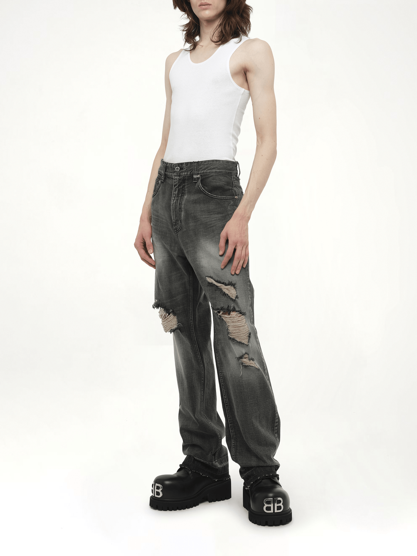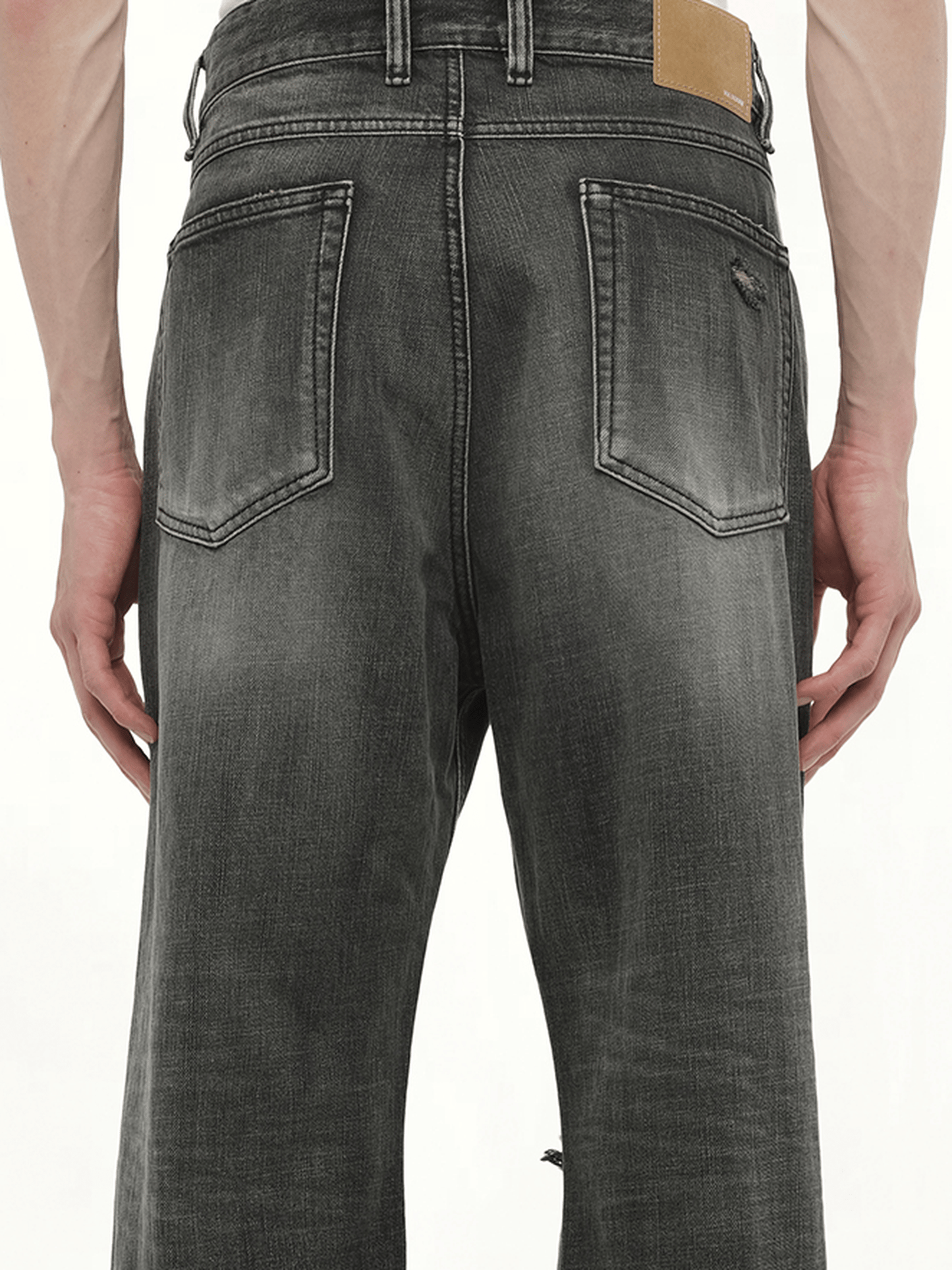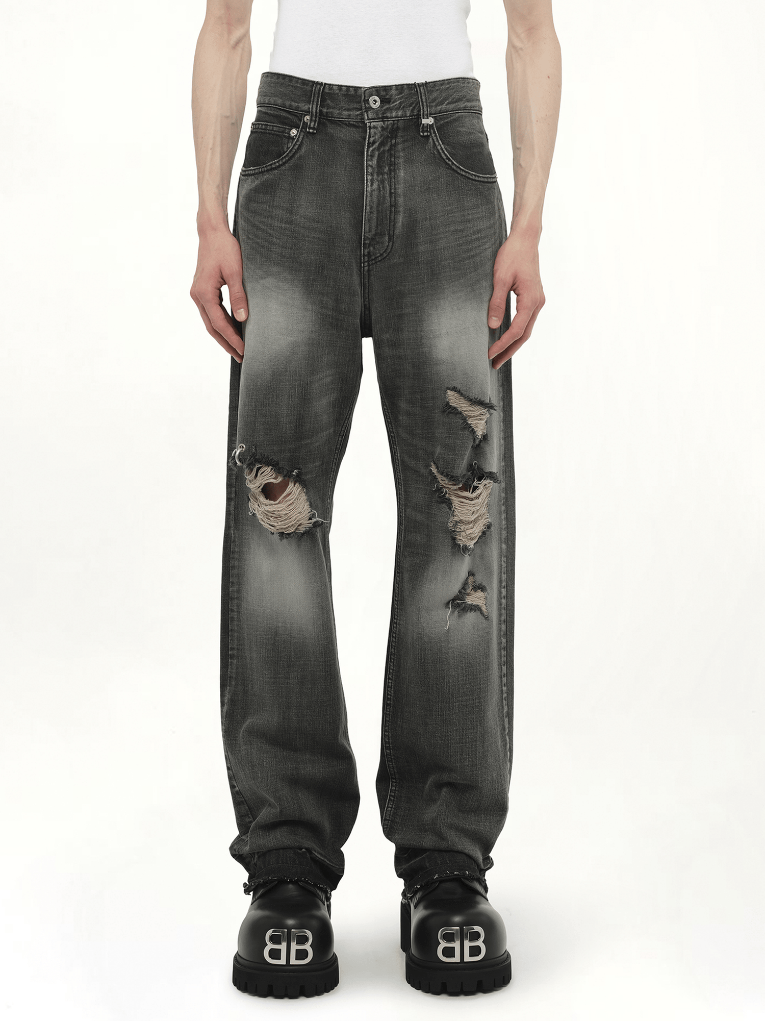 WE11DONE's Ripped Denim Trouser in Black offers a bold and edgy style statement with its distressed detailing and sleek silhouette. Perfect for elevating any casual outfit, these trousers are a must-have for fashion-forward individuals.