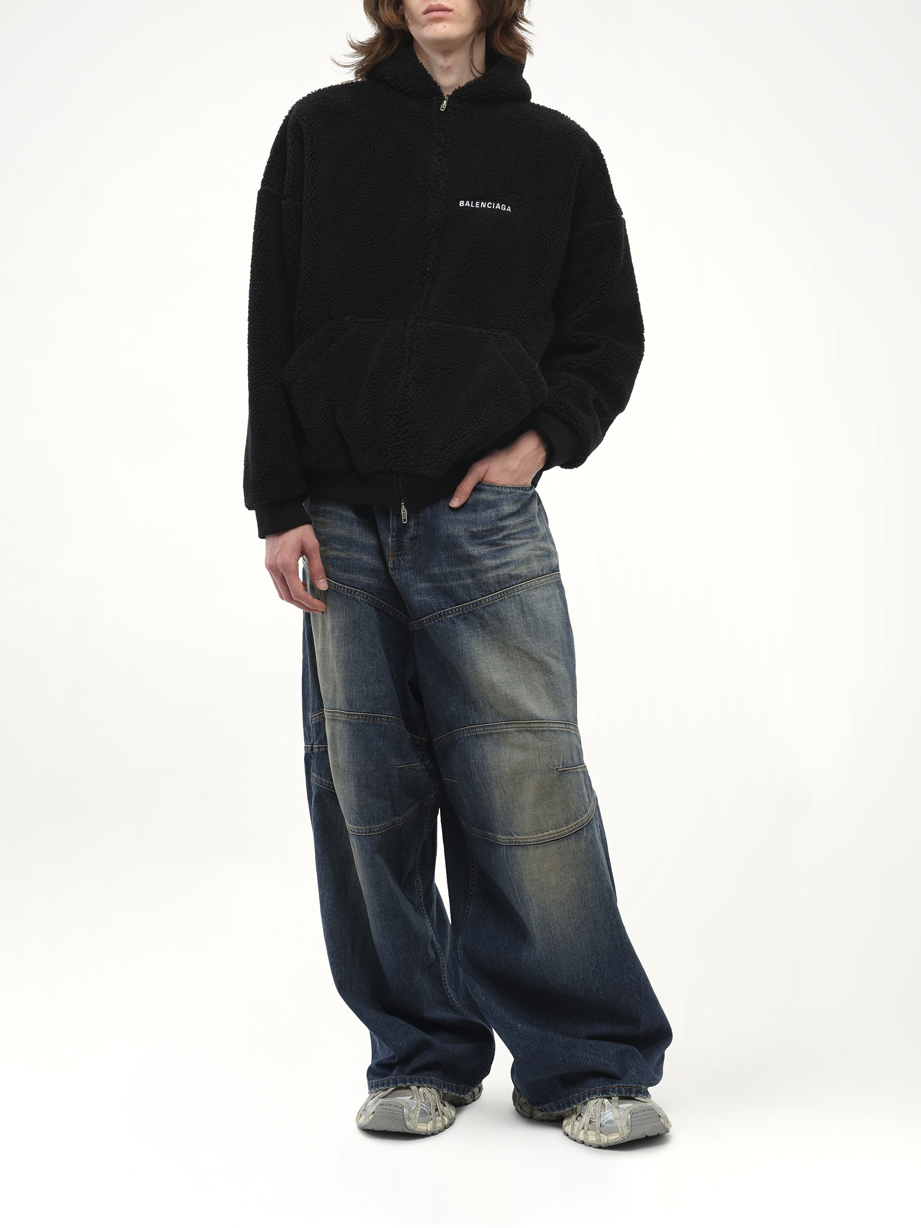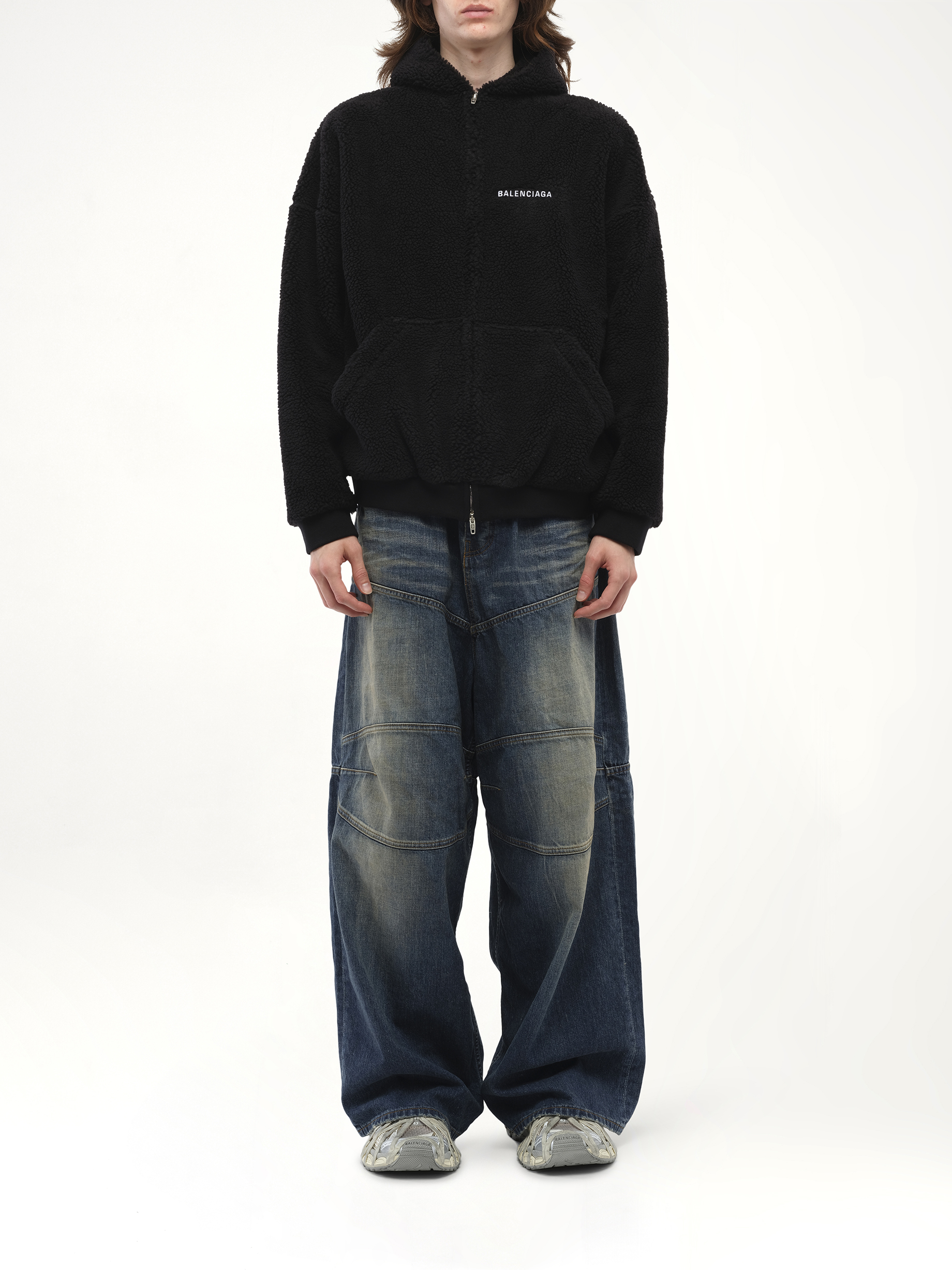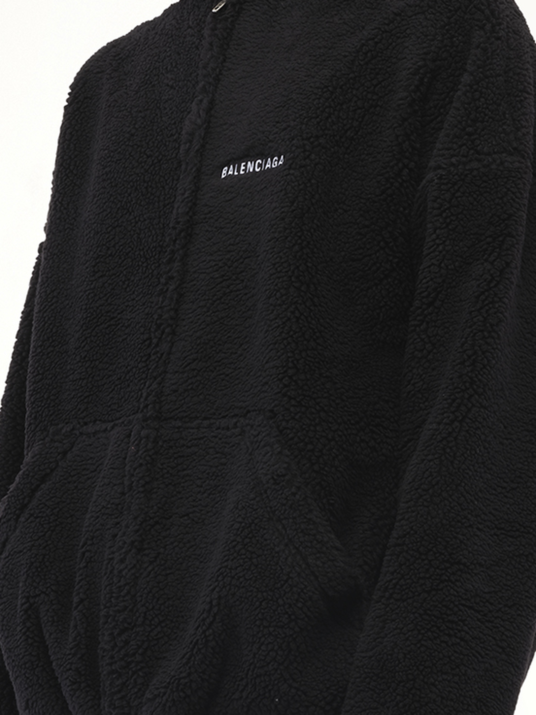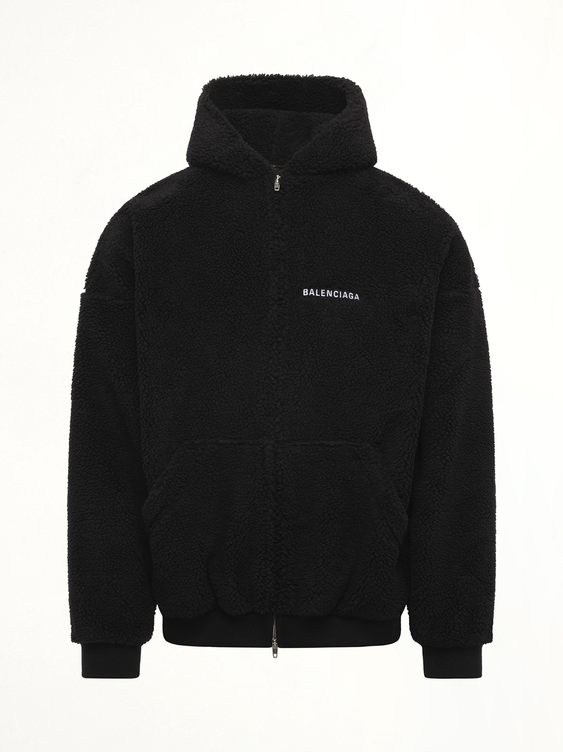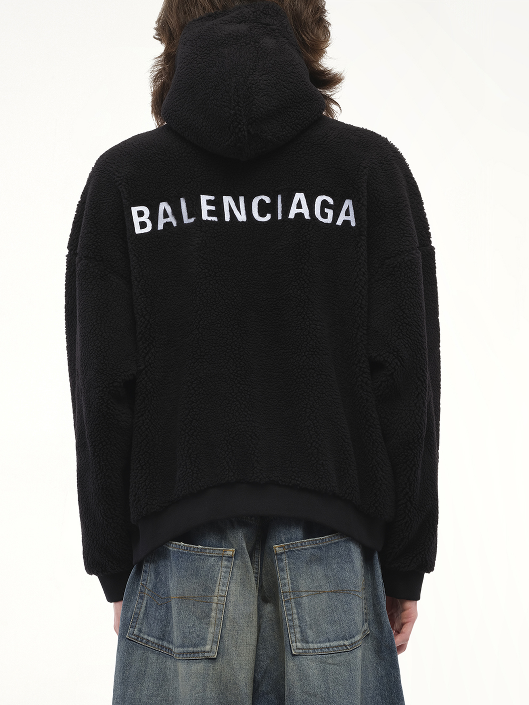 Balenciaga's Shearling Hoodie in Black/White, this oversized hoodie combines luxe faux shearling with streetwear styling. Perfect for staying cozy while making a bold fashion statement.