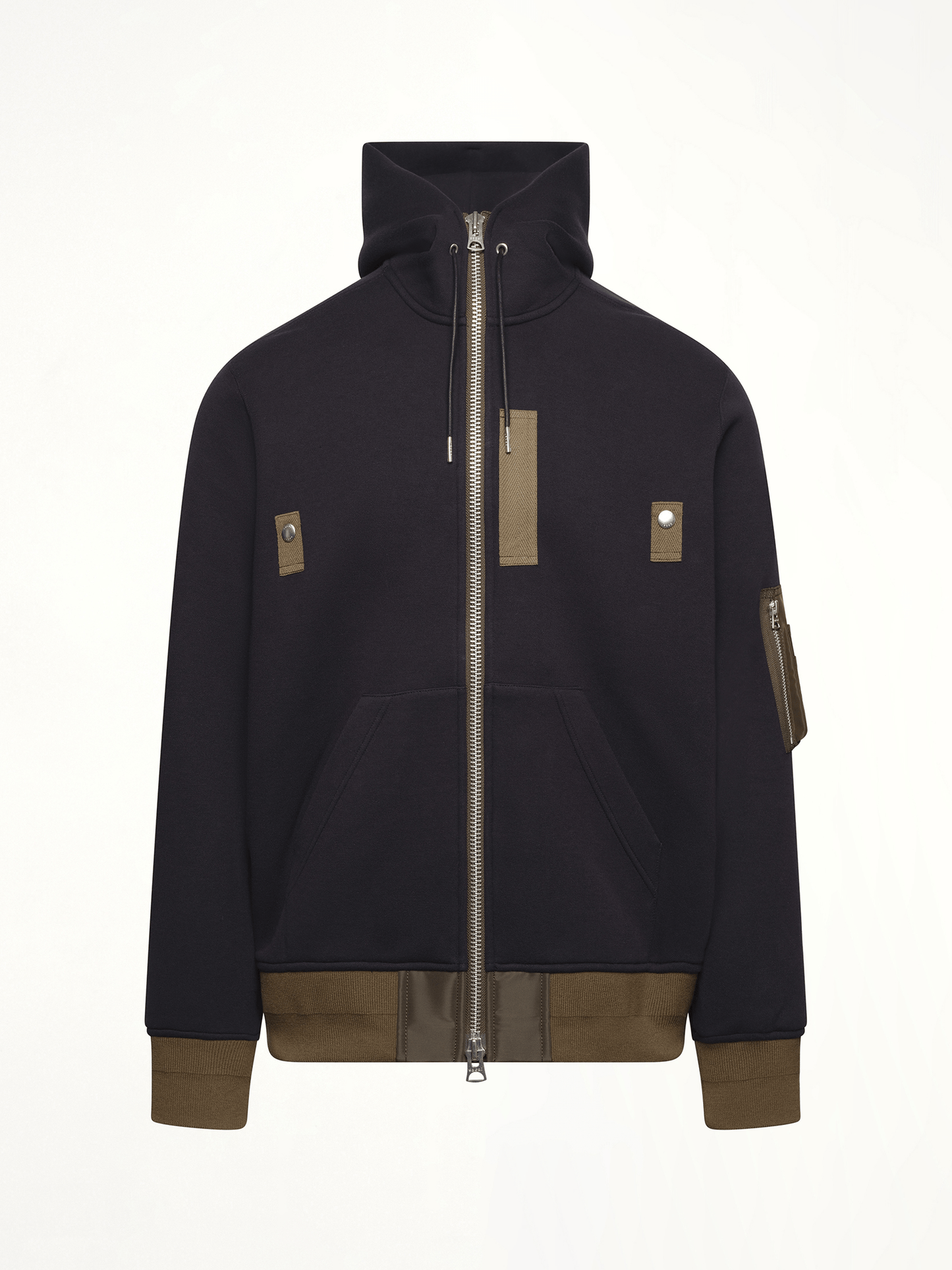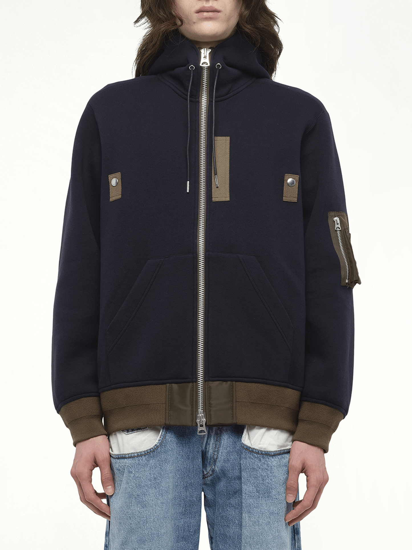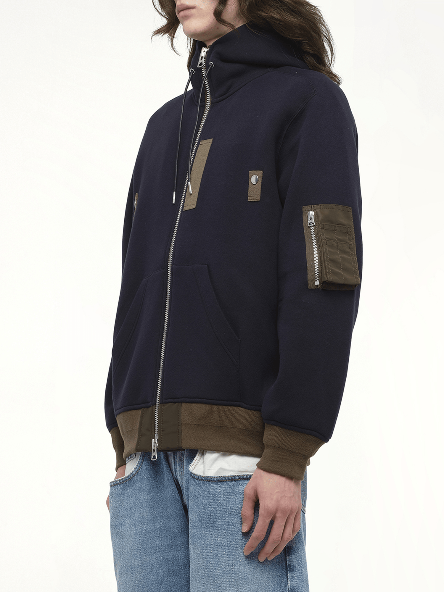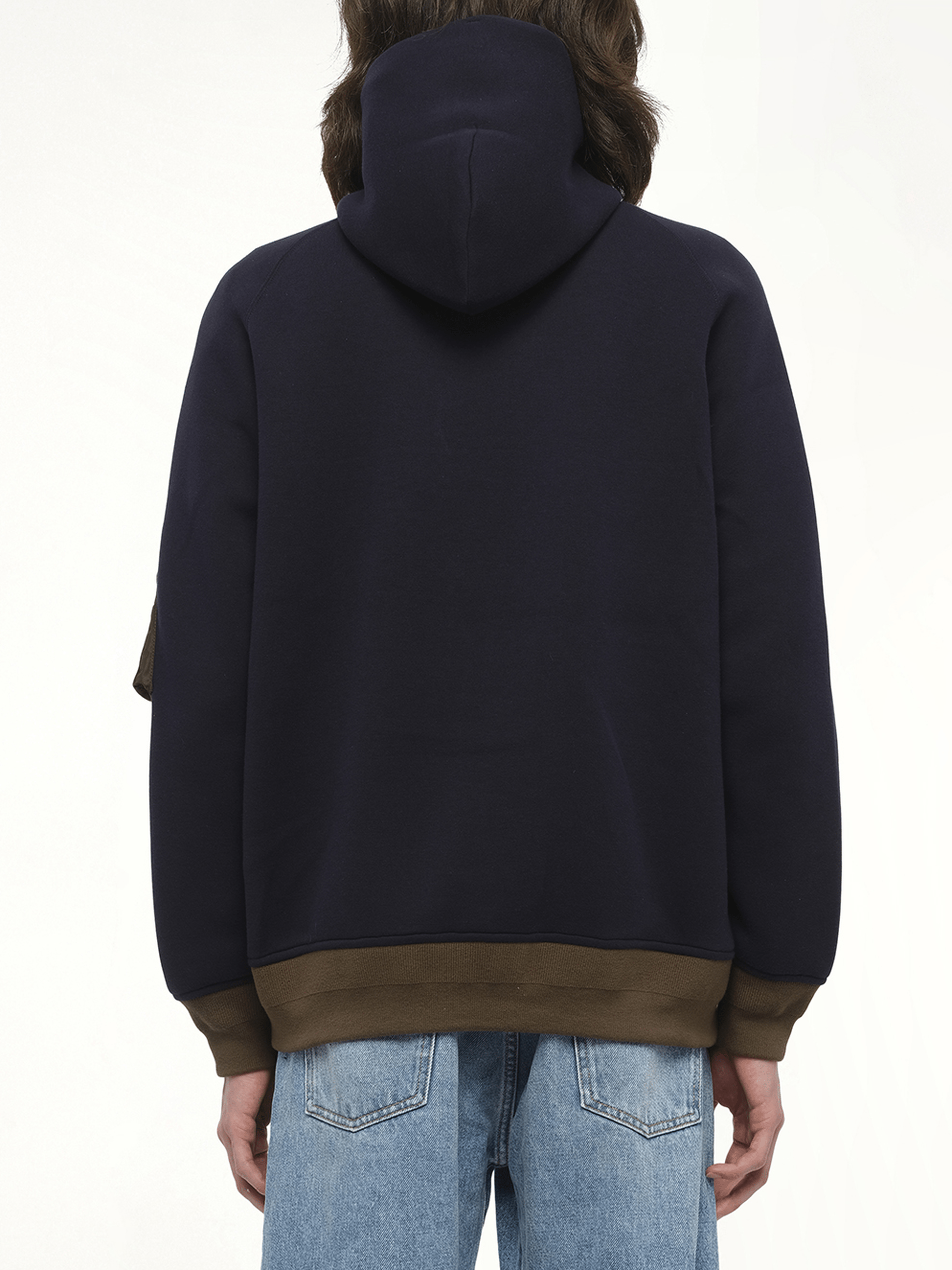 SACAI's Sponge Sweat Hoodie in Navy/Dark Khaki is a versatile and stylish addition to your wardrobe. This hoodie combines comfort with a modern aesthetic, perfect for any casual occasion.