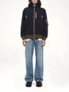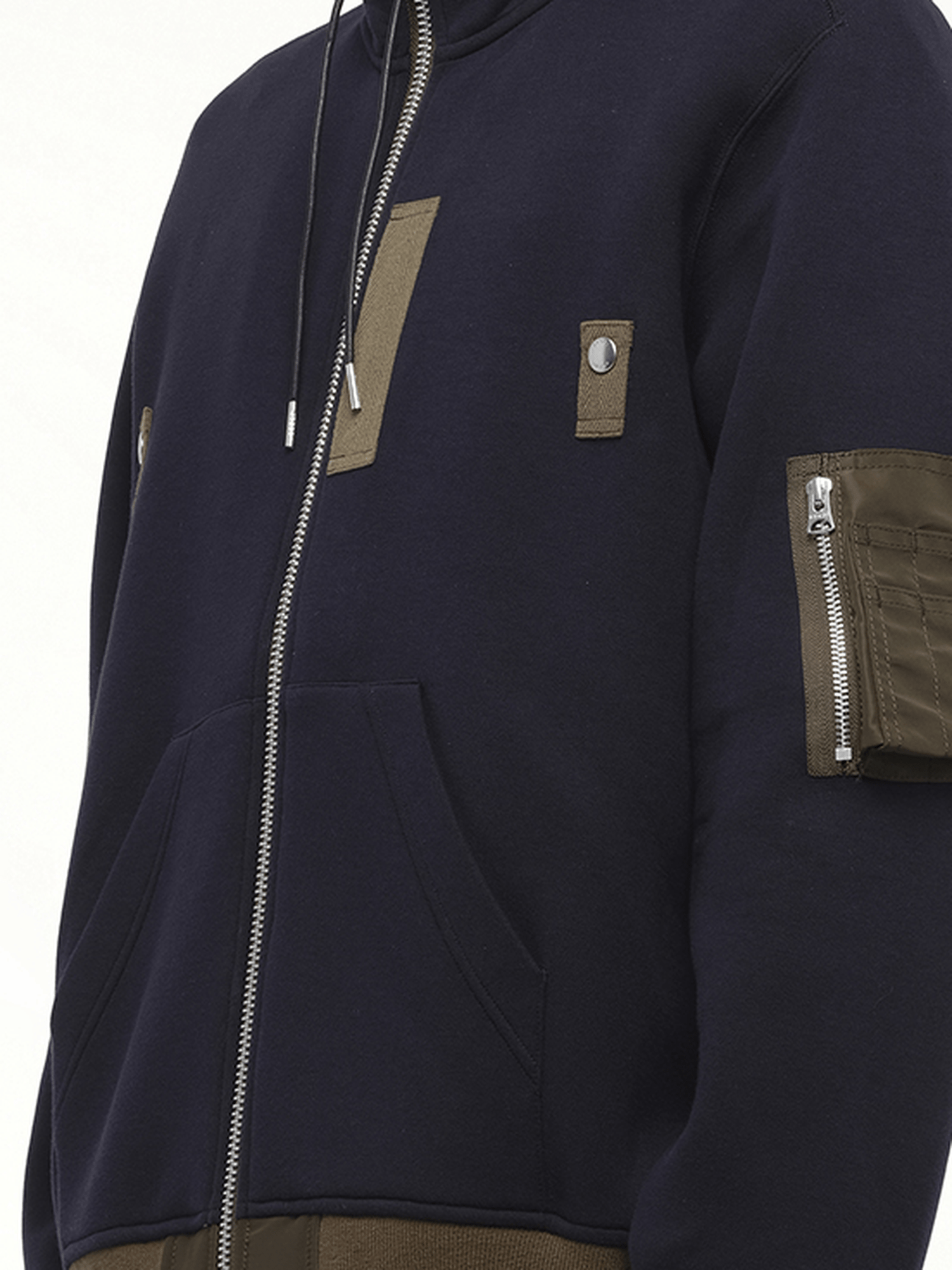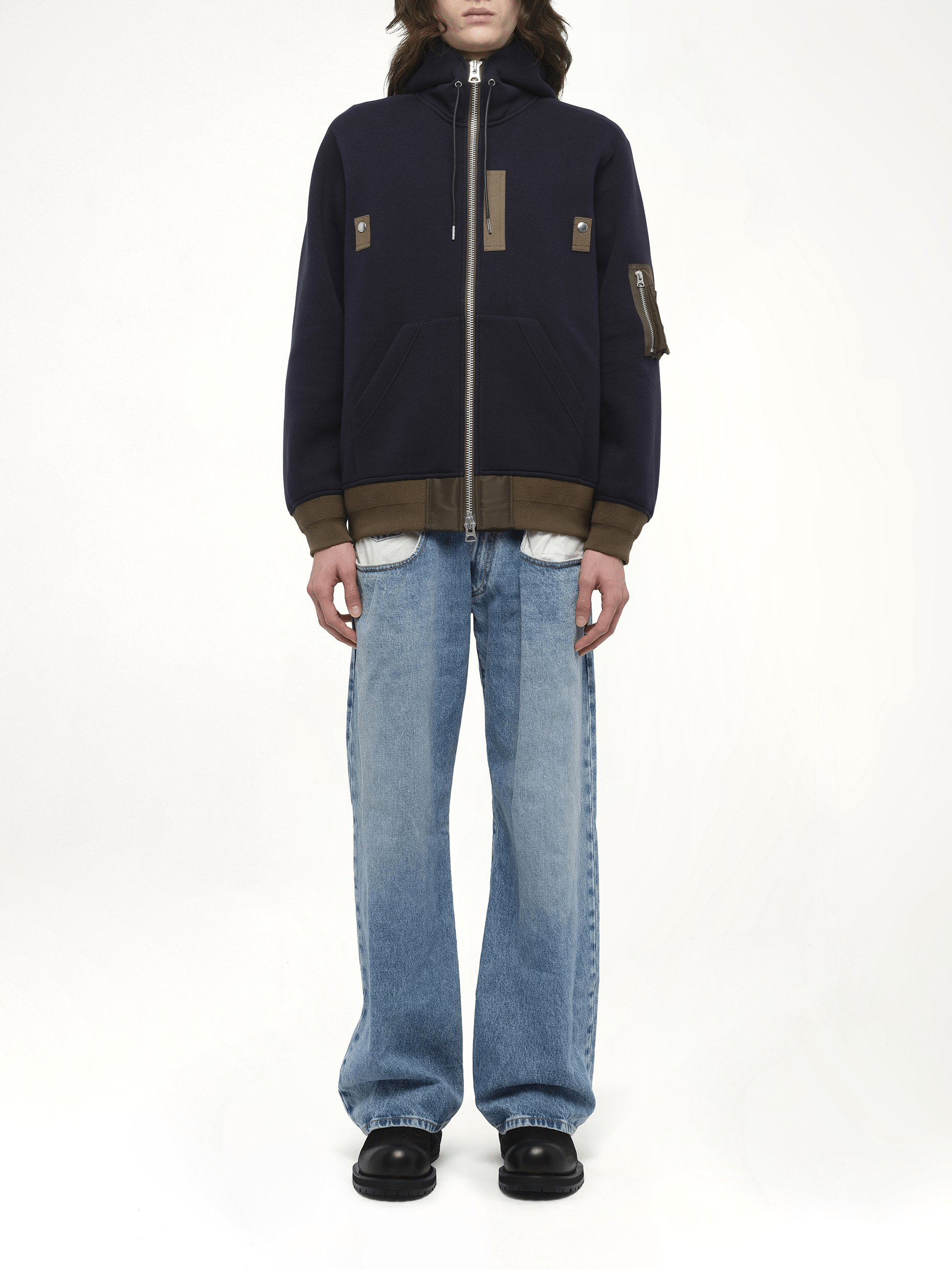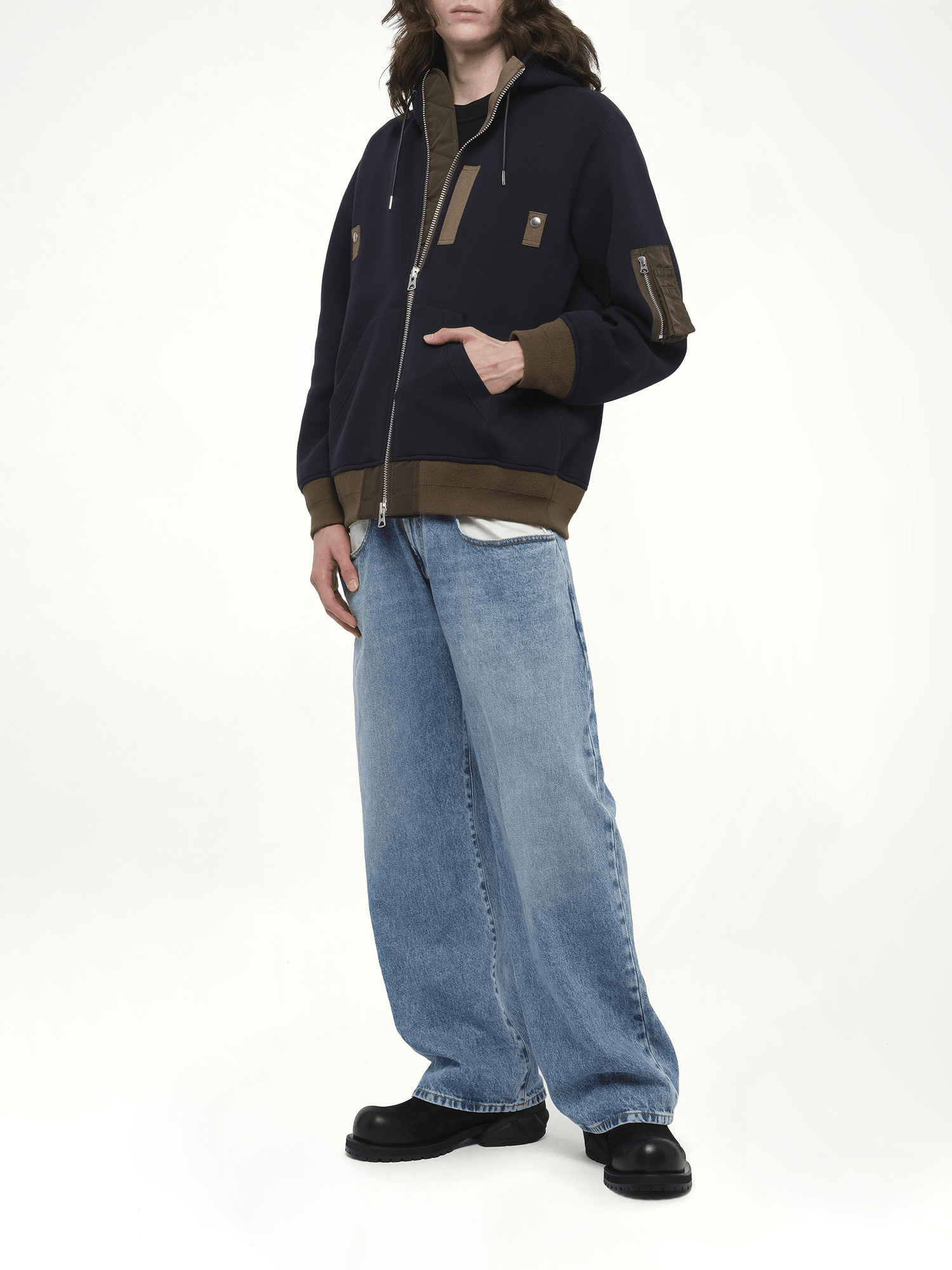SACAI's Sponge Sweat Hoodie in Navy/Dark Khaki is a versatile and stylish addition to your wardrobe. This hoodie combines comfort with a modern aesthetic, perfect for any casual occasion.