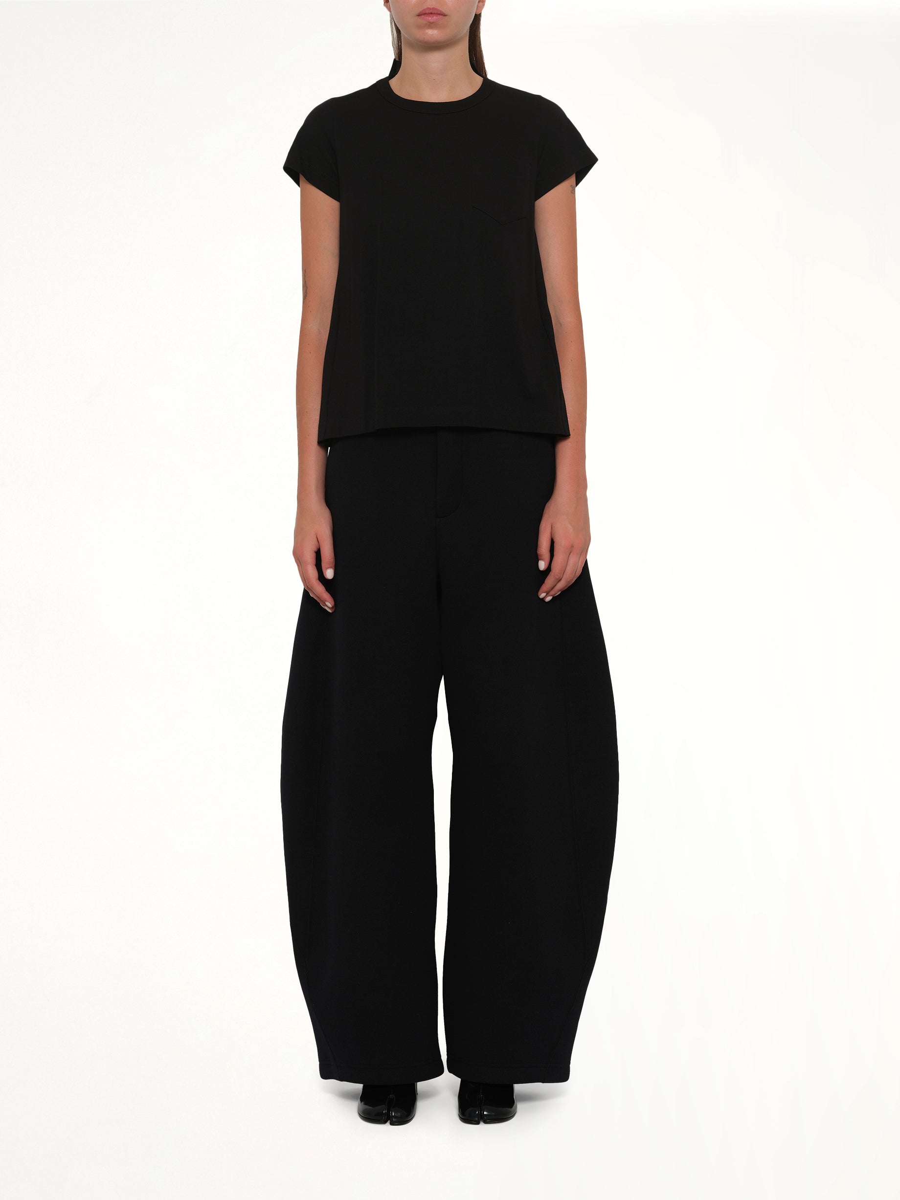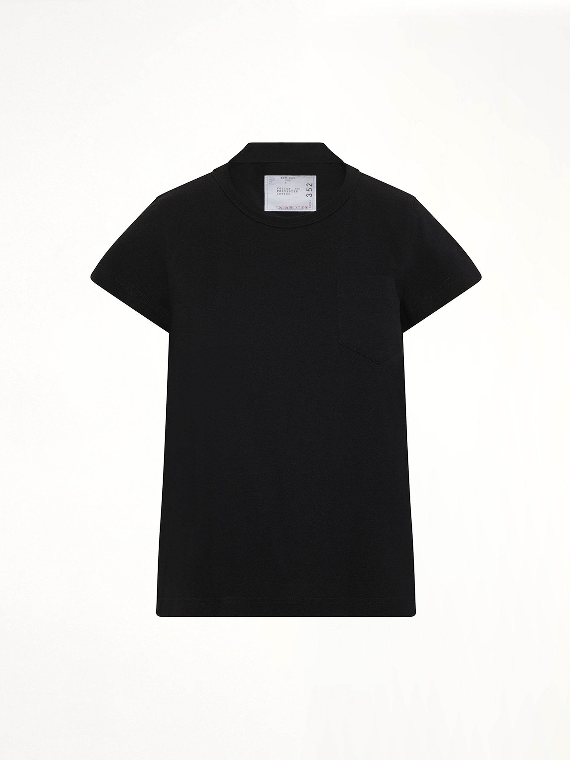 Sacai's Cotton Poplin x Cotton Jersey T-Shirt in Black is a unique blend of textures, offering a modern twist on a classic silhouette. This versatile piece is perfect for elevating everyday looks with its innovative design.