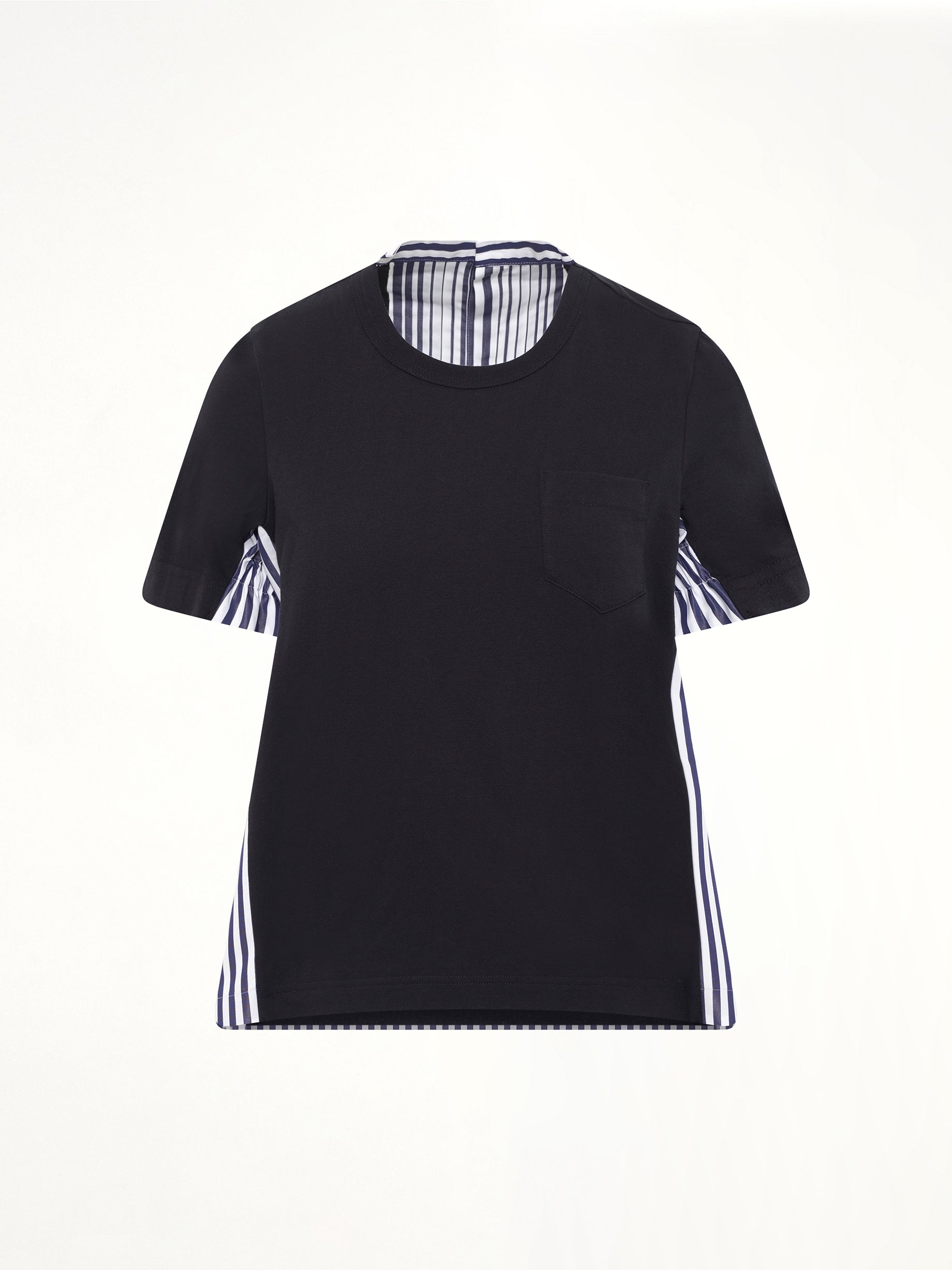 Sacai's Cotton Poplin x Cotton Jersey T-Shirt in Navy/Stripe is a stylish fusion of classic and contemporary design. This versatile piece effortlessly combines comfort with a modern aesthetic.