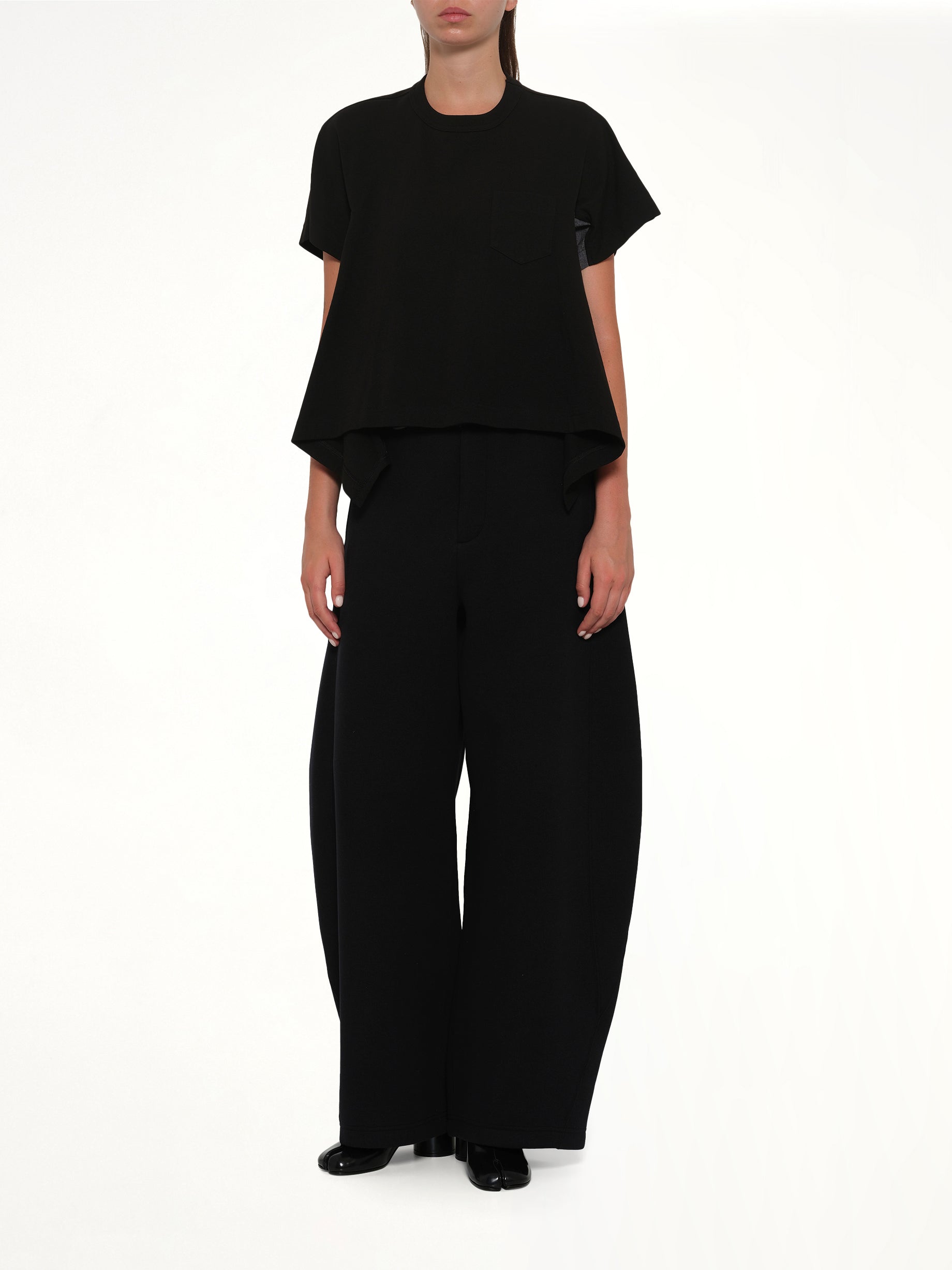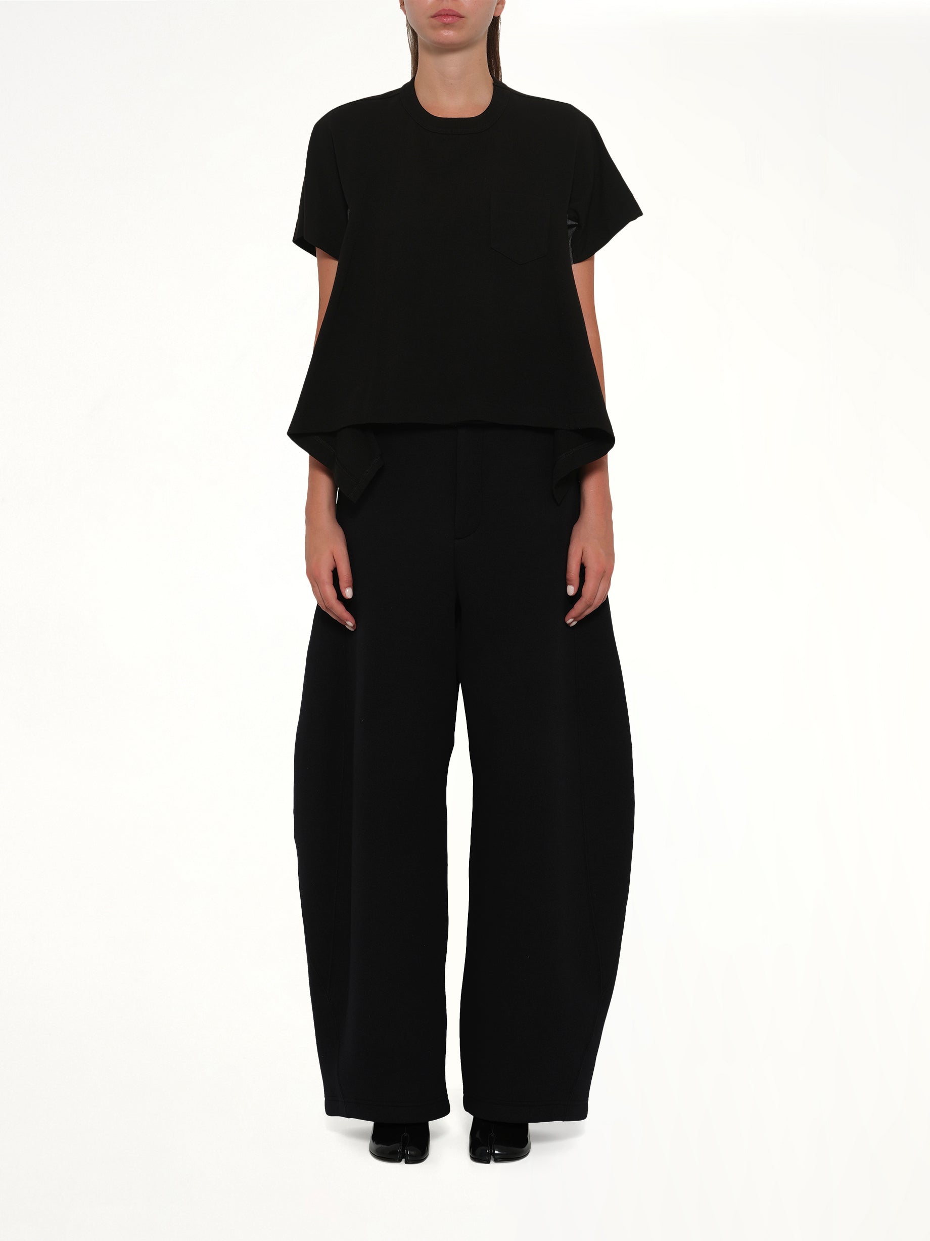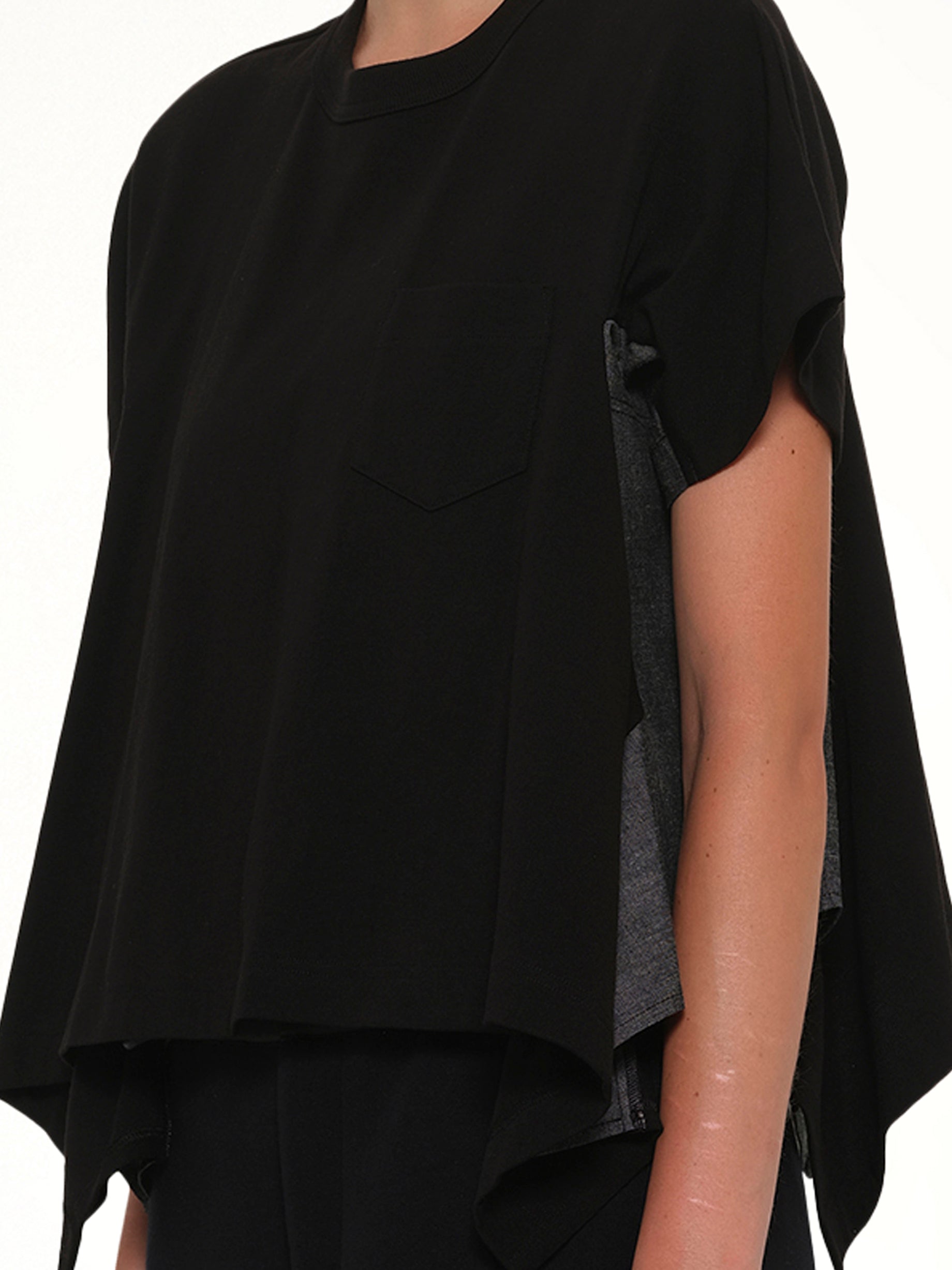Sacai's Light Weight Denim x Cotton Jersey T-Shirt in Black is a unique blend of casual style and innovative design. This piece combines the rugged appeal of denim with the comfort of cotton jersey, making it a versatile addition to any wardrobe.
