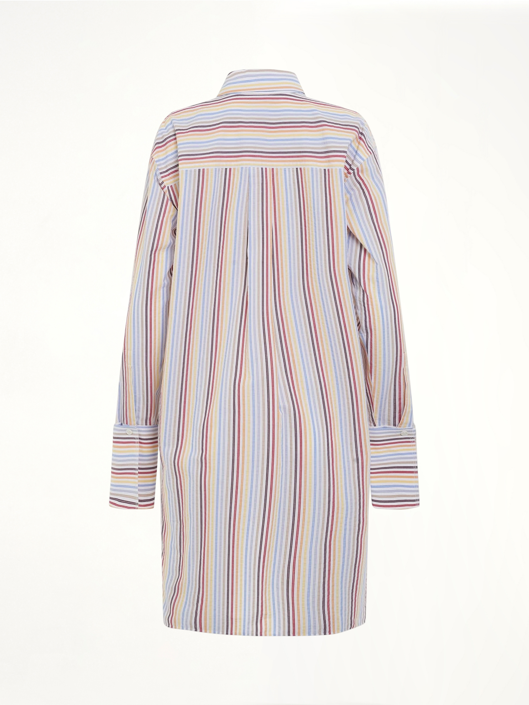 Button front shirt dress in multi colour stripes with detachable collar and cuffs. An asymmetric hem and buttoned placket Designed for versatility and style, this dress features a button front, detachable collar and cuffs, and an asymmetric hem. The buttoned placket allows for easy adjustments, making it perfect for any occasion.