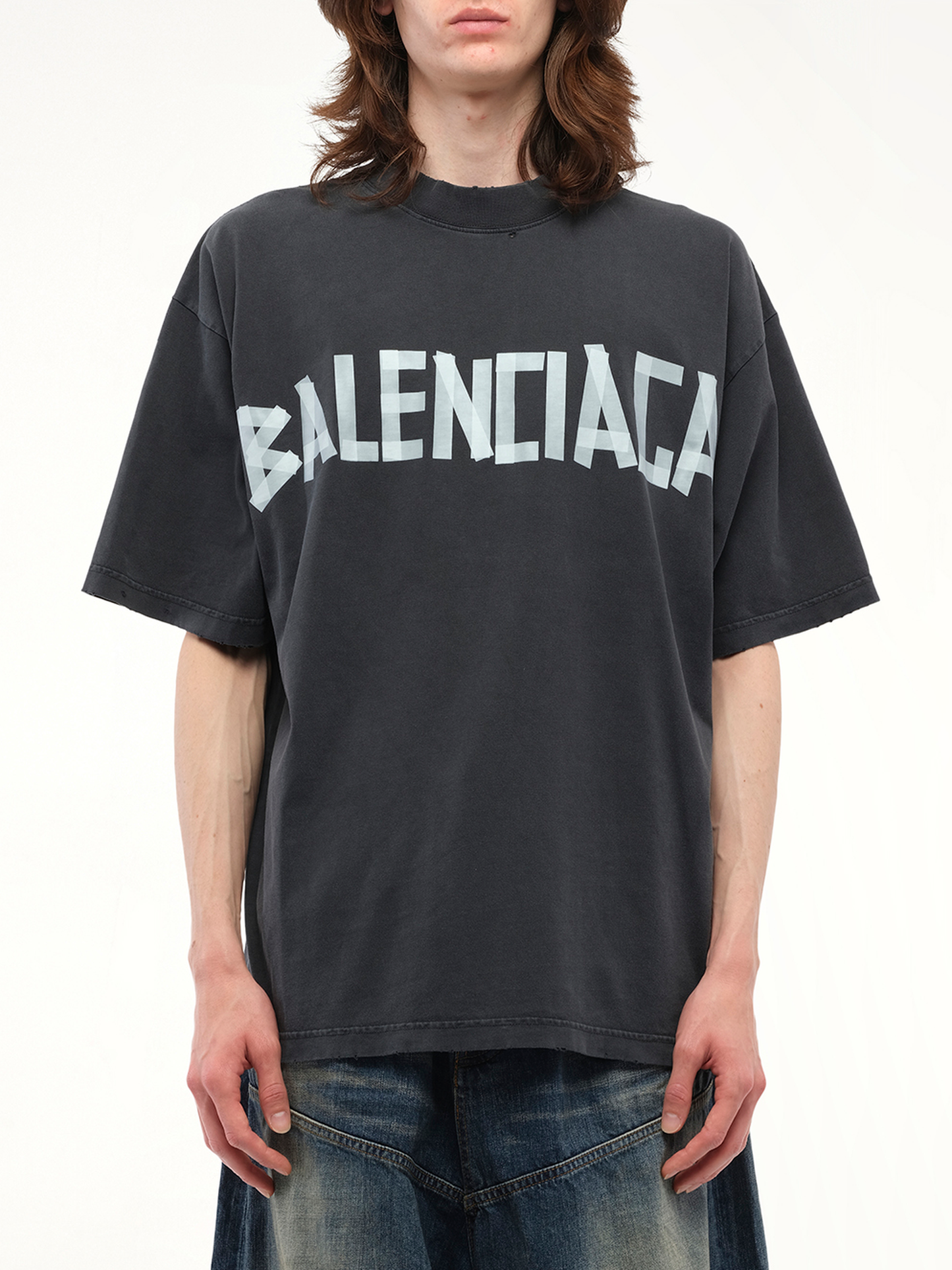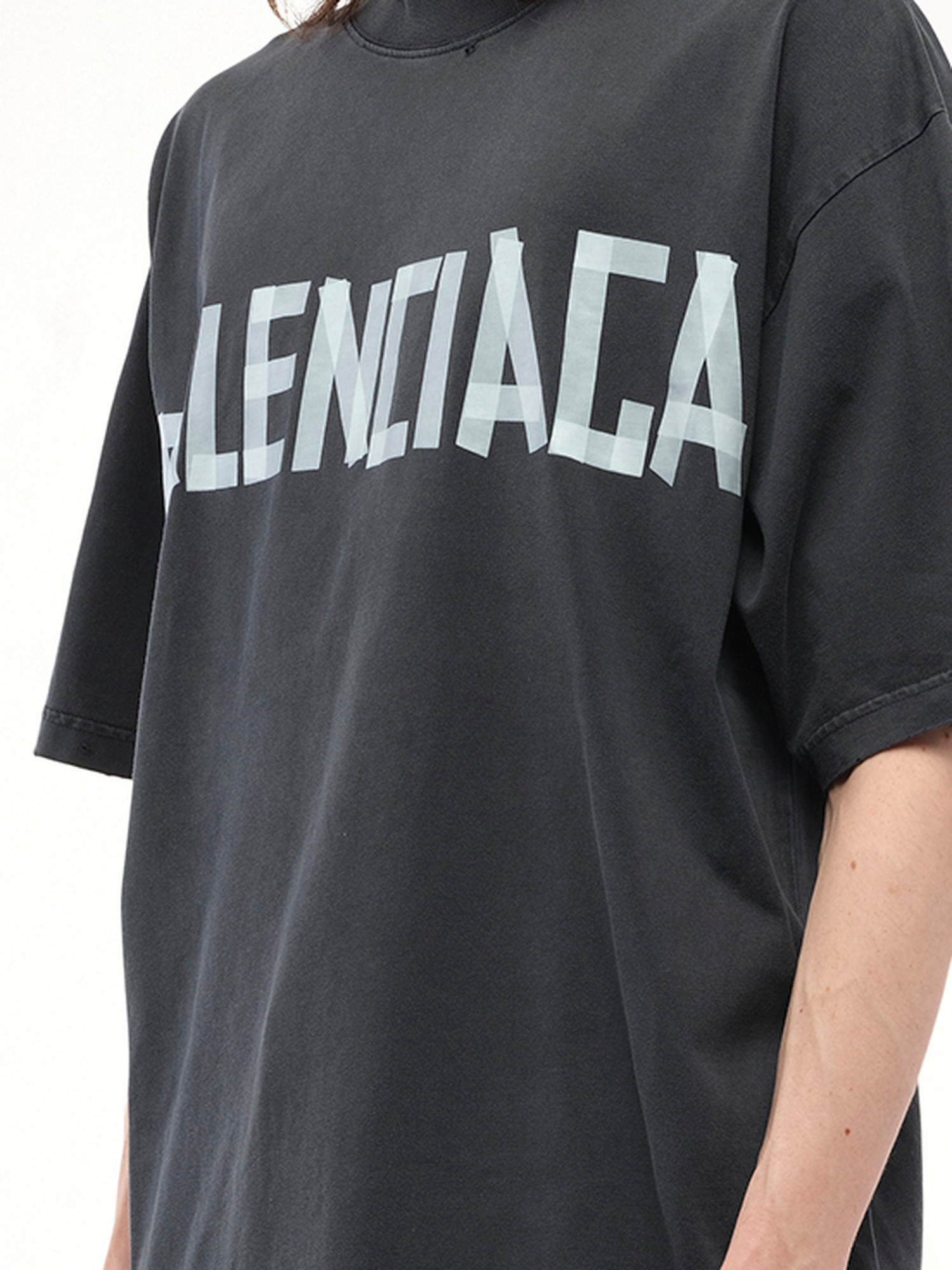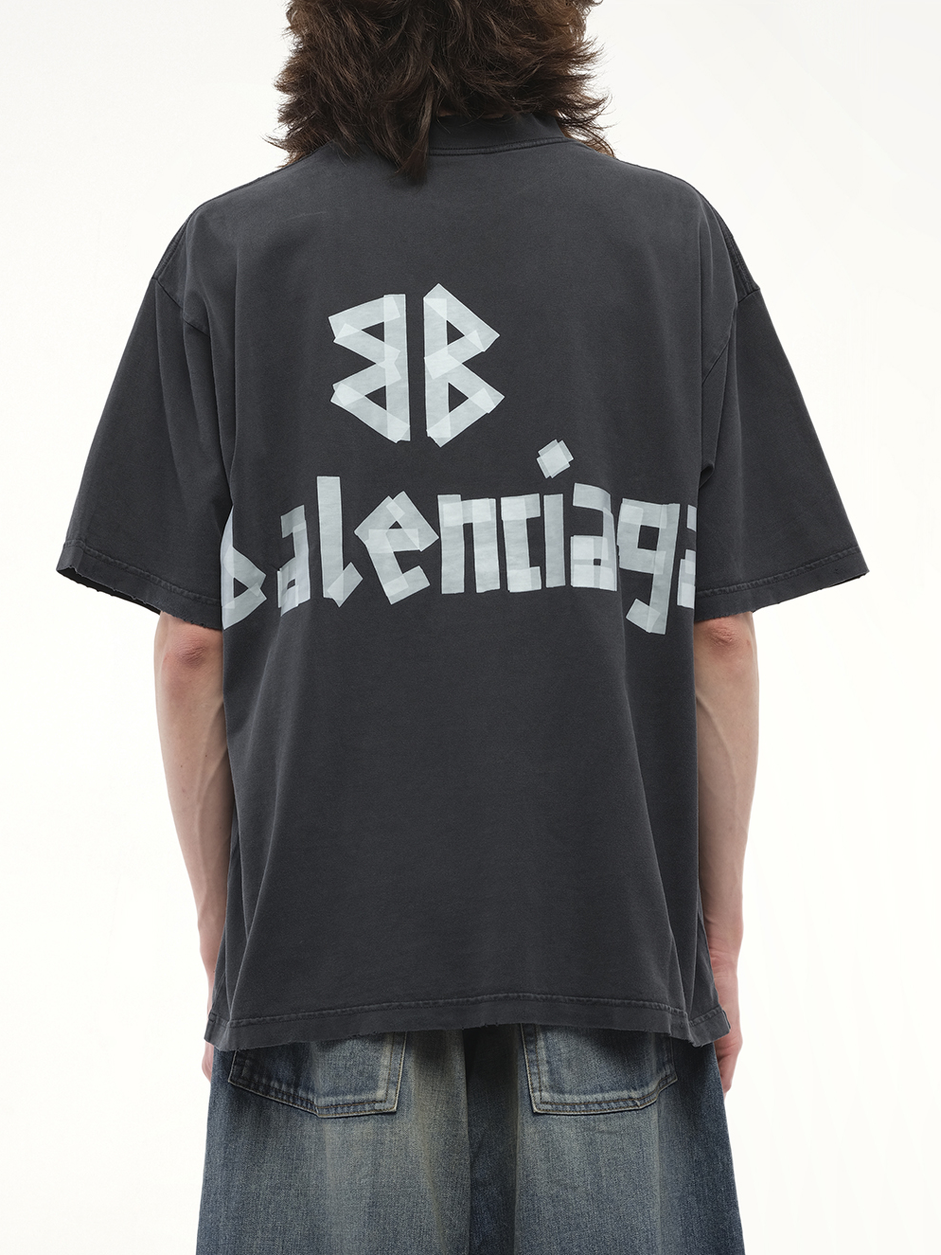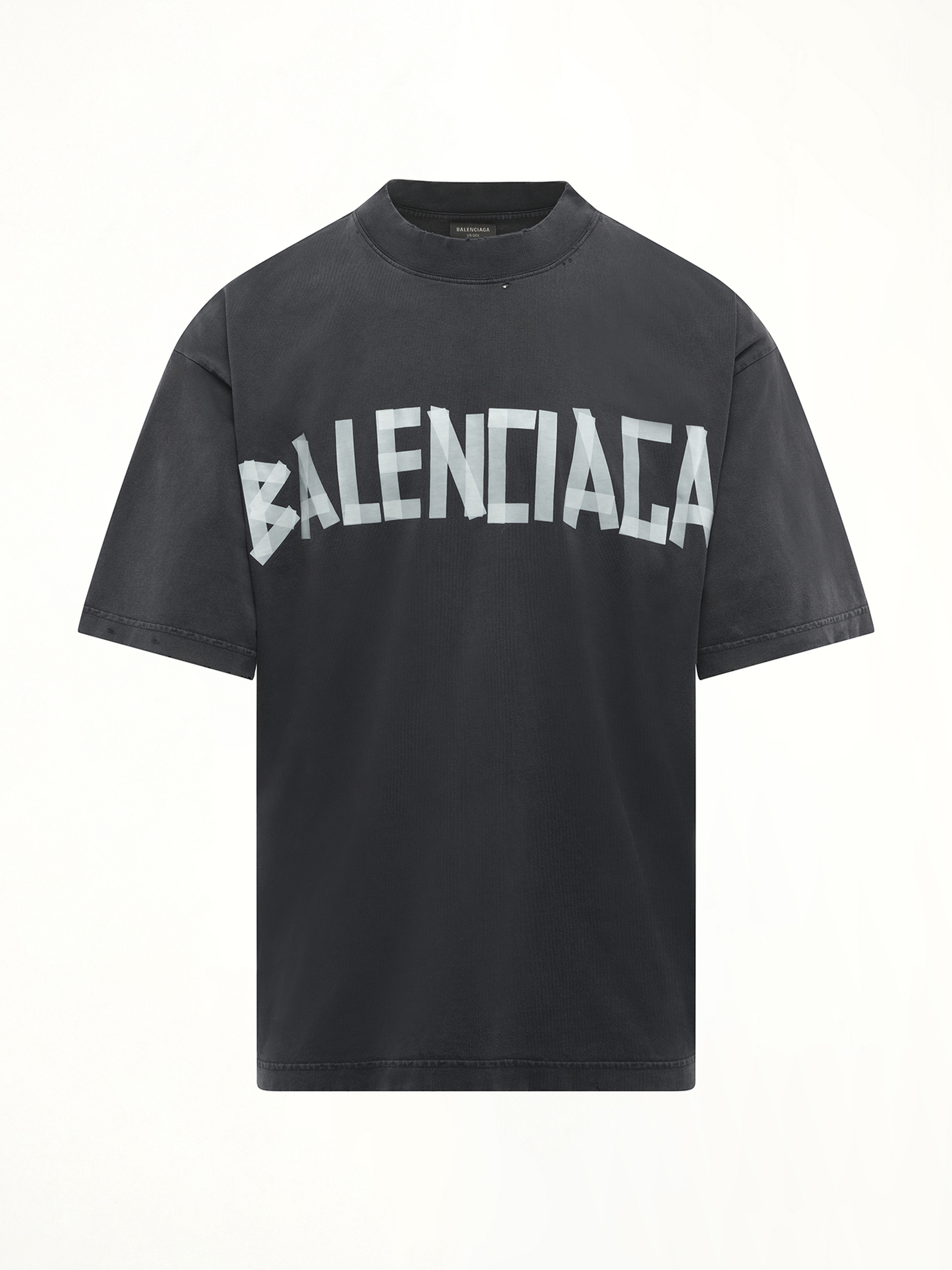 Balenciaga's Tape Type Medium Fit T-Shirt in Faded Washed Black, crafted from vintage jersey, this unisex tee features the bold Tape Type logo on both the front and back. The worn-out, washed-out effect adds a distinctive edge to its medium fit, crewneck design, and short sleeves.