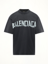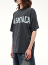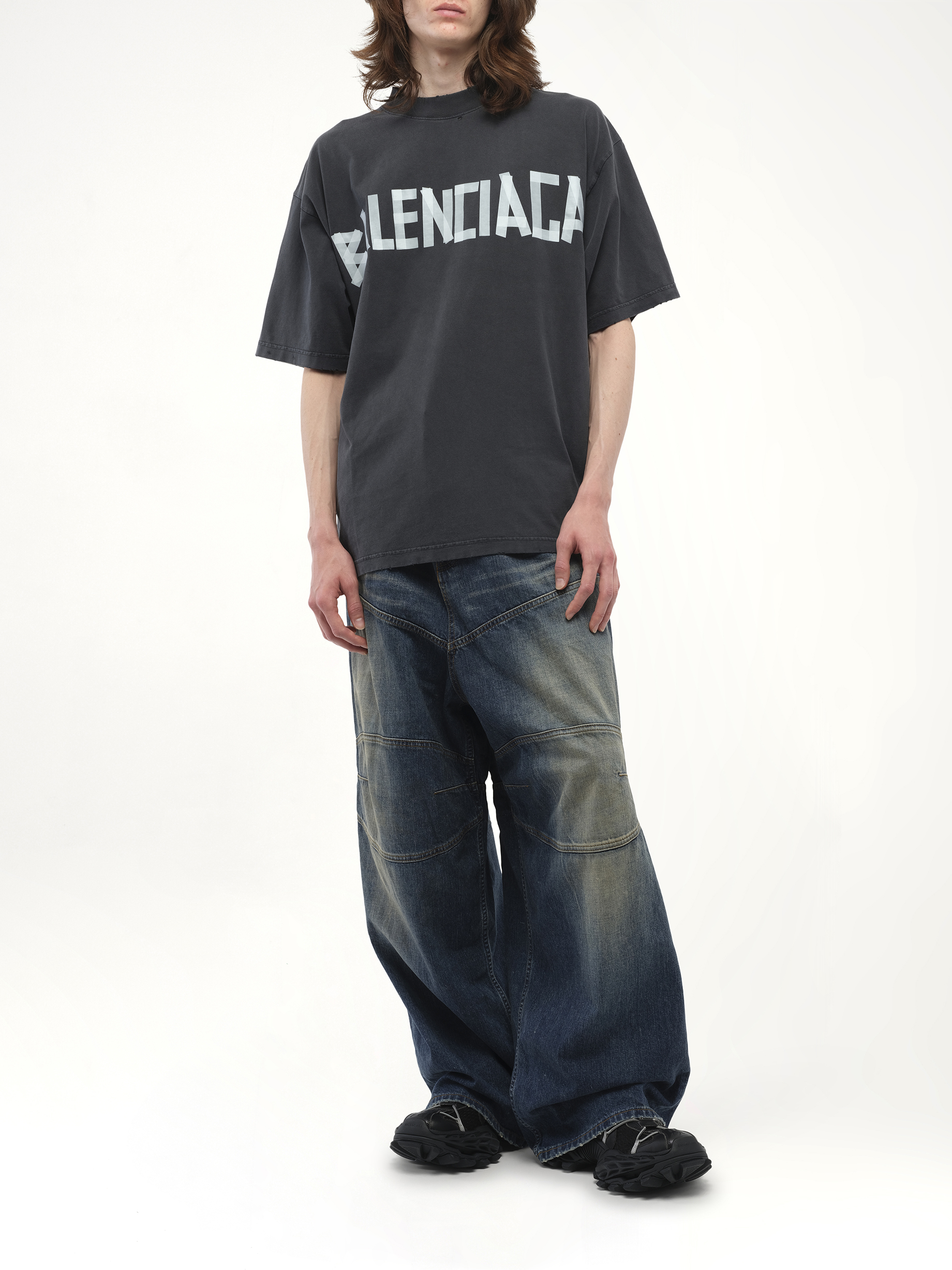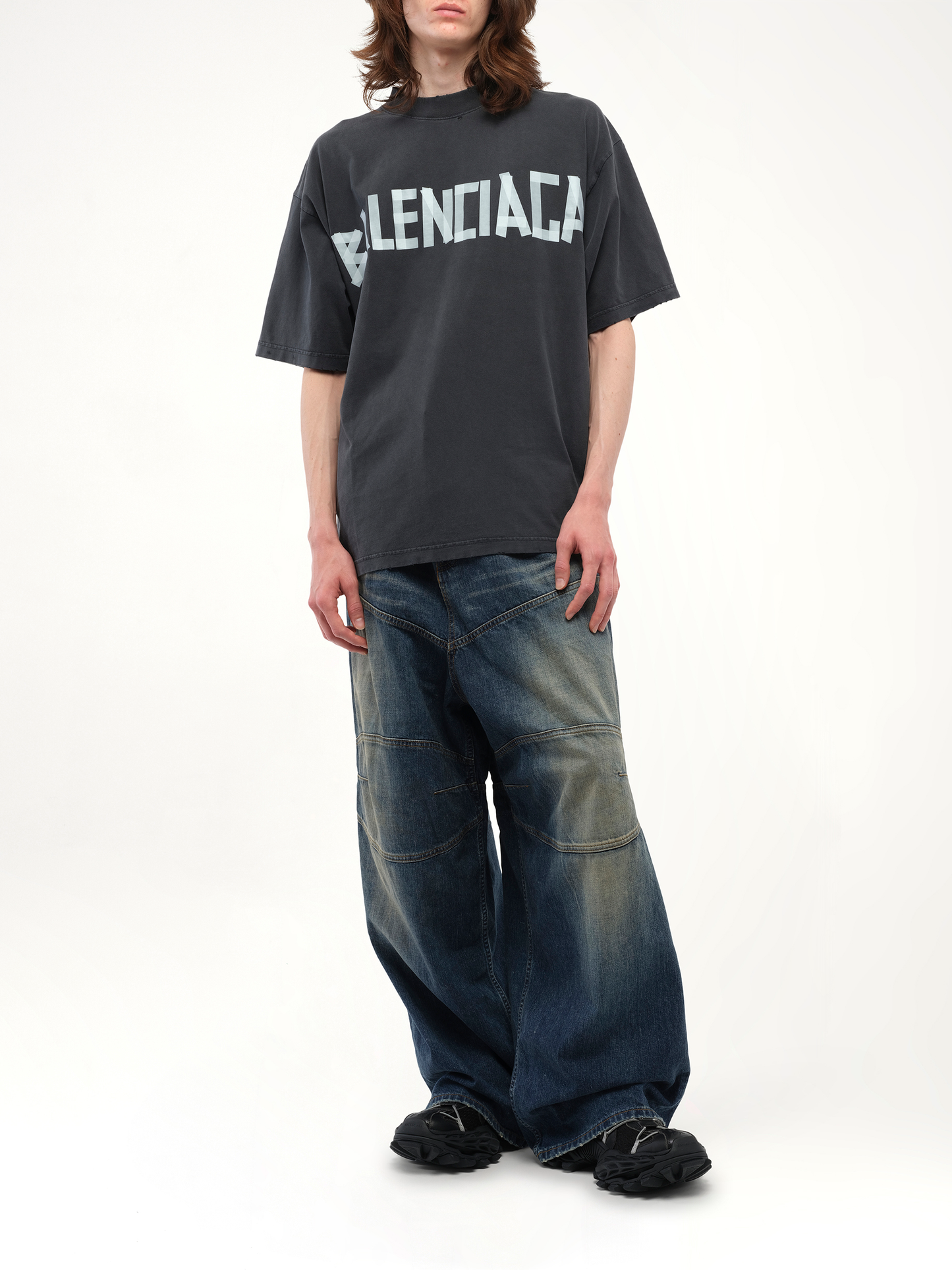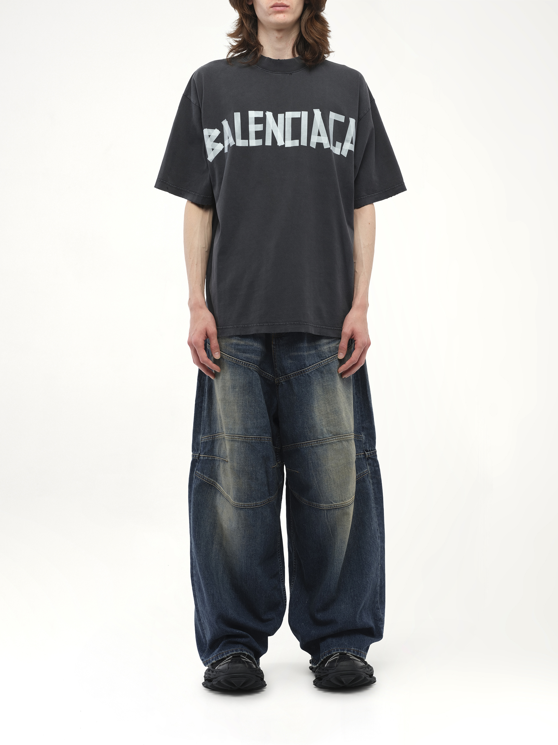 Balenciaga's Tape Type Medium Fit T-Shirt in Faded Washed Black, crafted from vintage jersey, this unisex tee features the bold Tape Type logo on both the front and back. The worn-out, washed-out effect adds a distinctive edge to its medium fit, crewneck design, and short sleeves.
