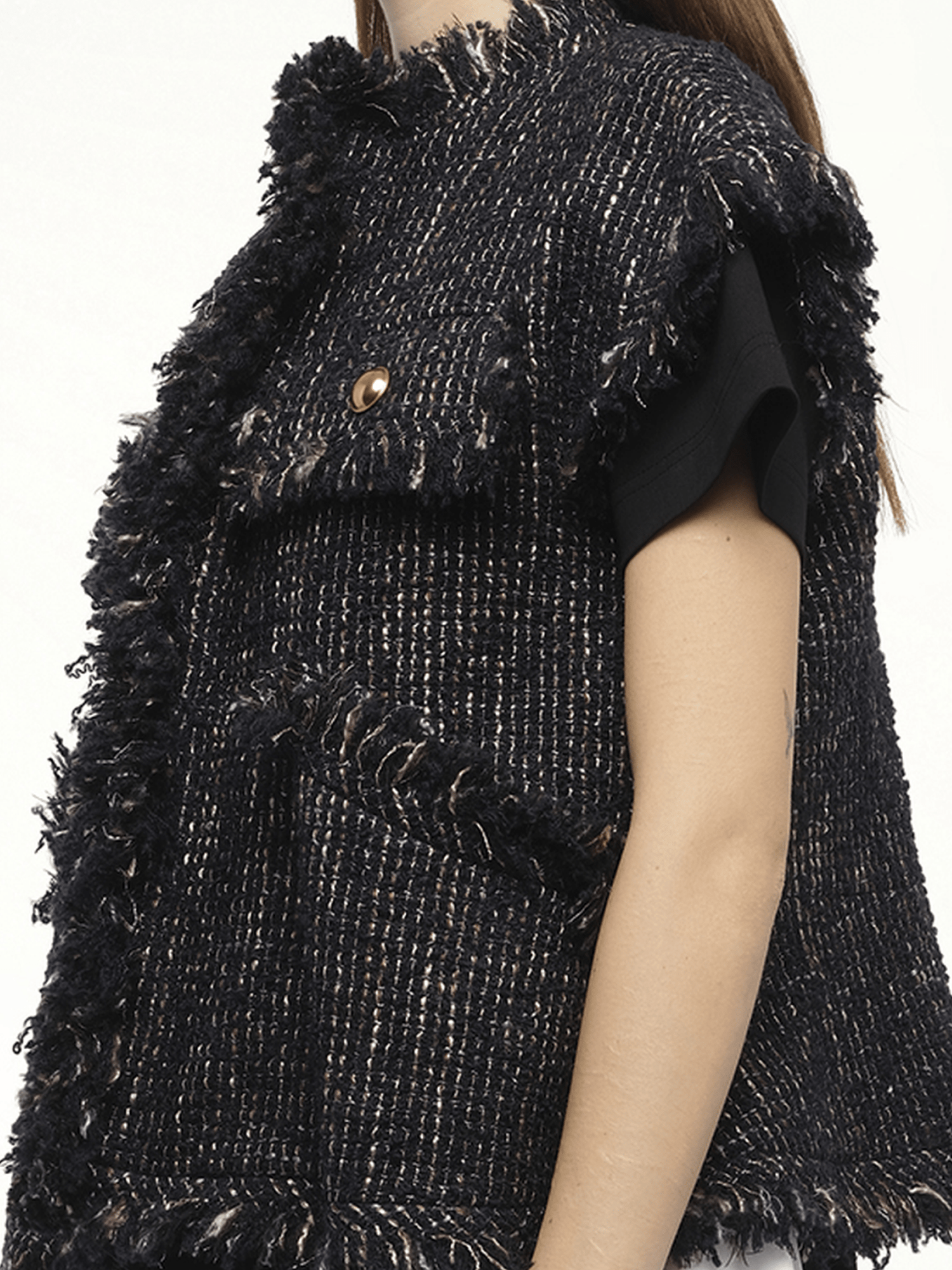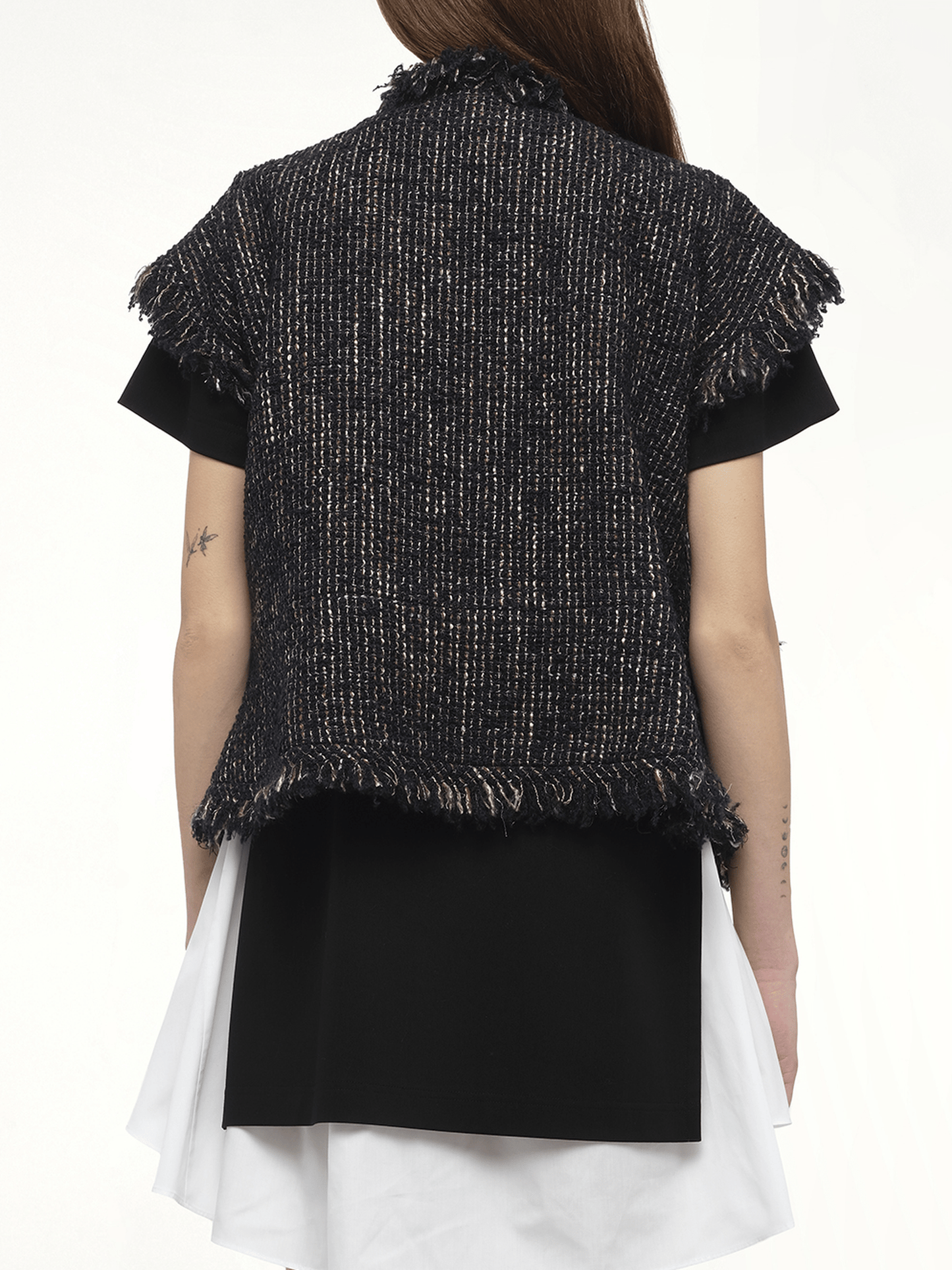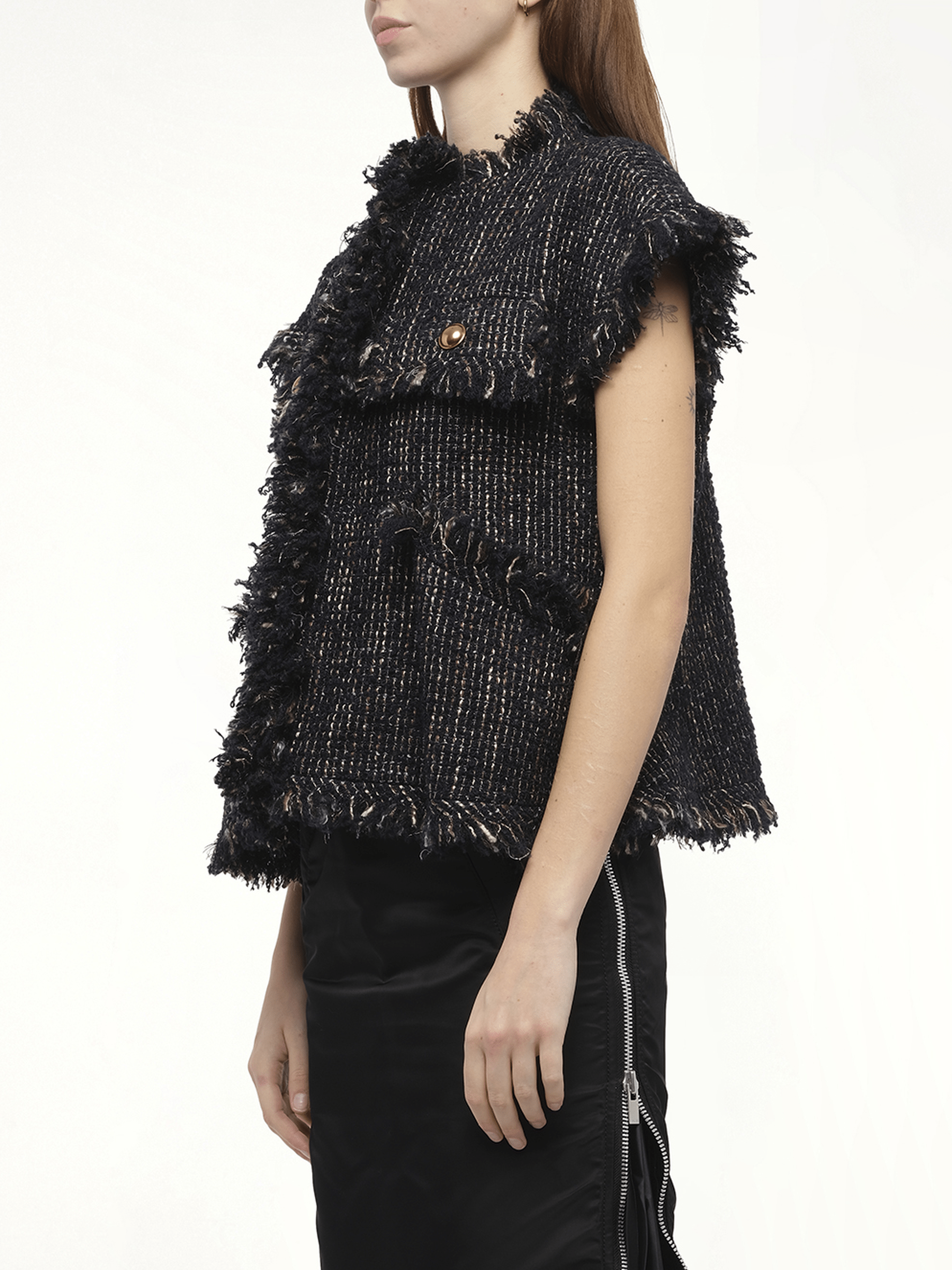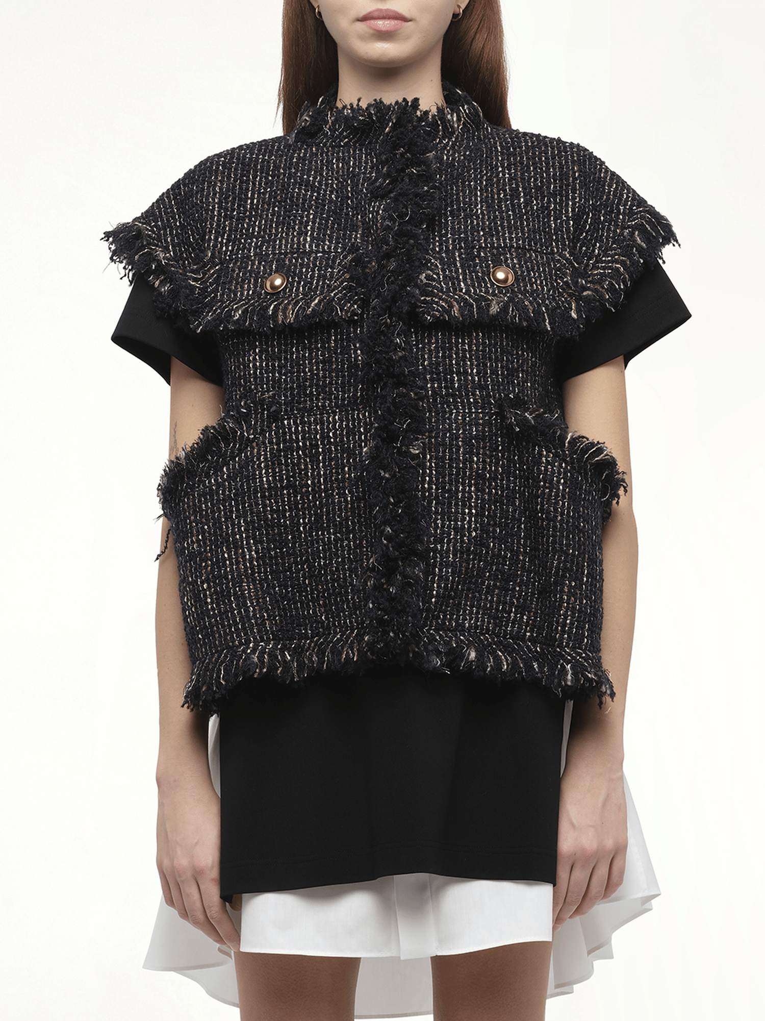 SACAI's Tweed Jacket in Navy is a sophisticated blend of classic style and modern design. This versatile piece is perfect for elevating any wardrobe with its timeless appeal.