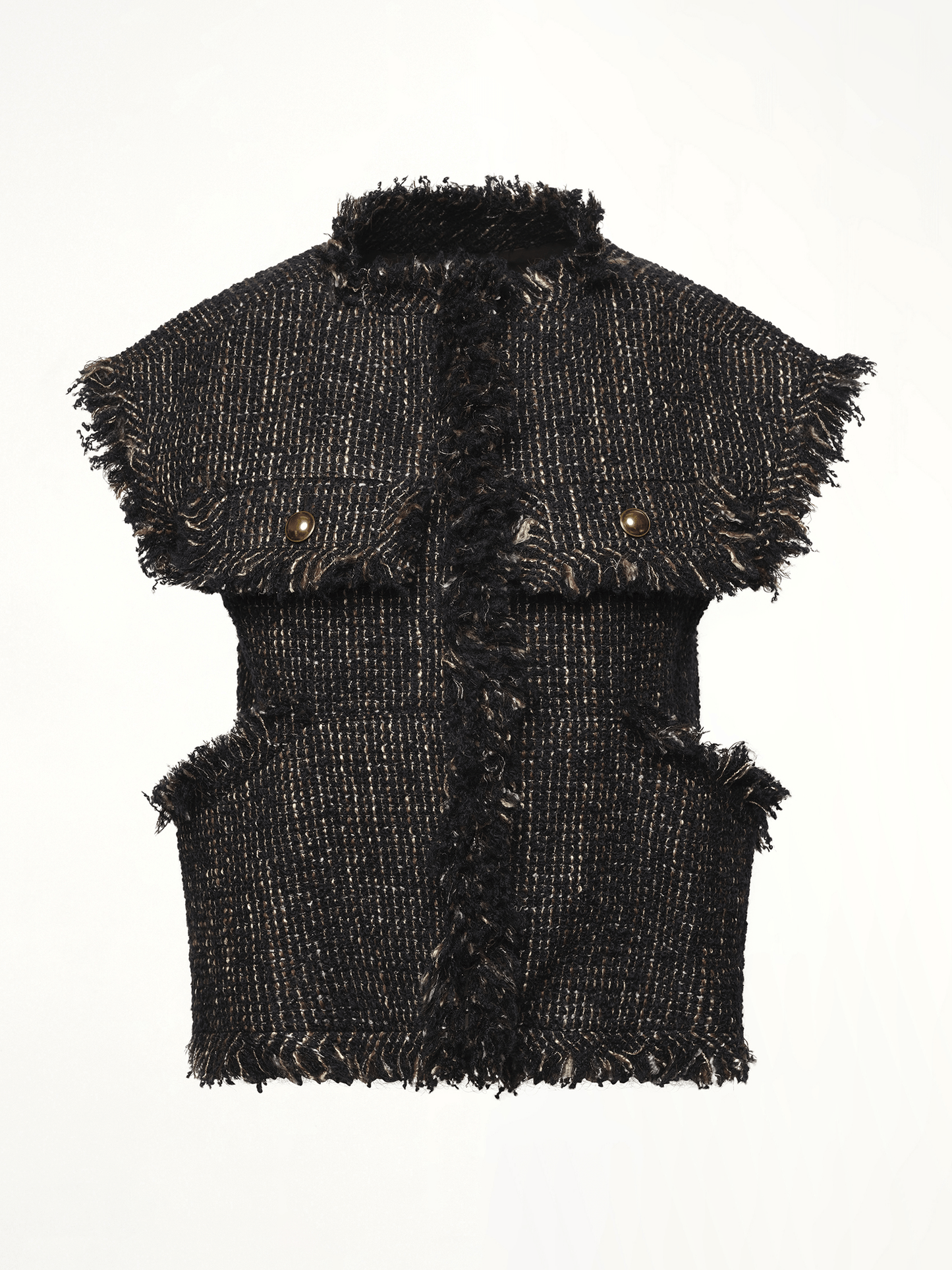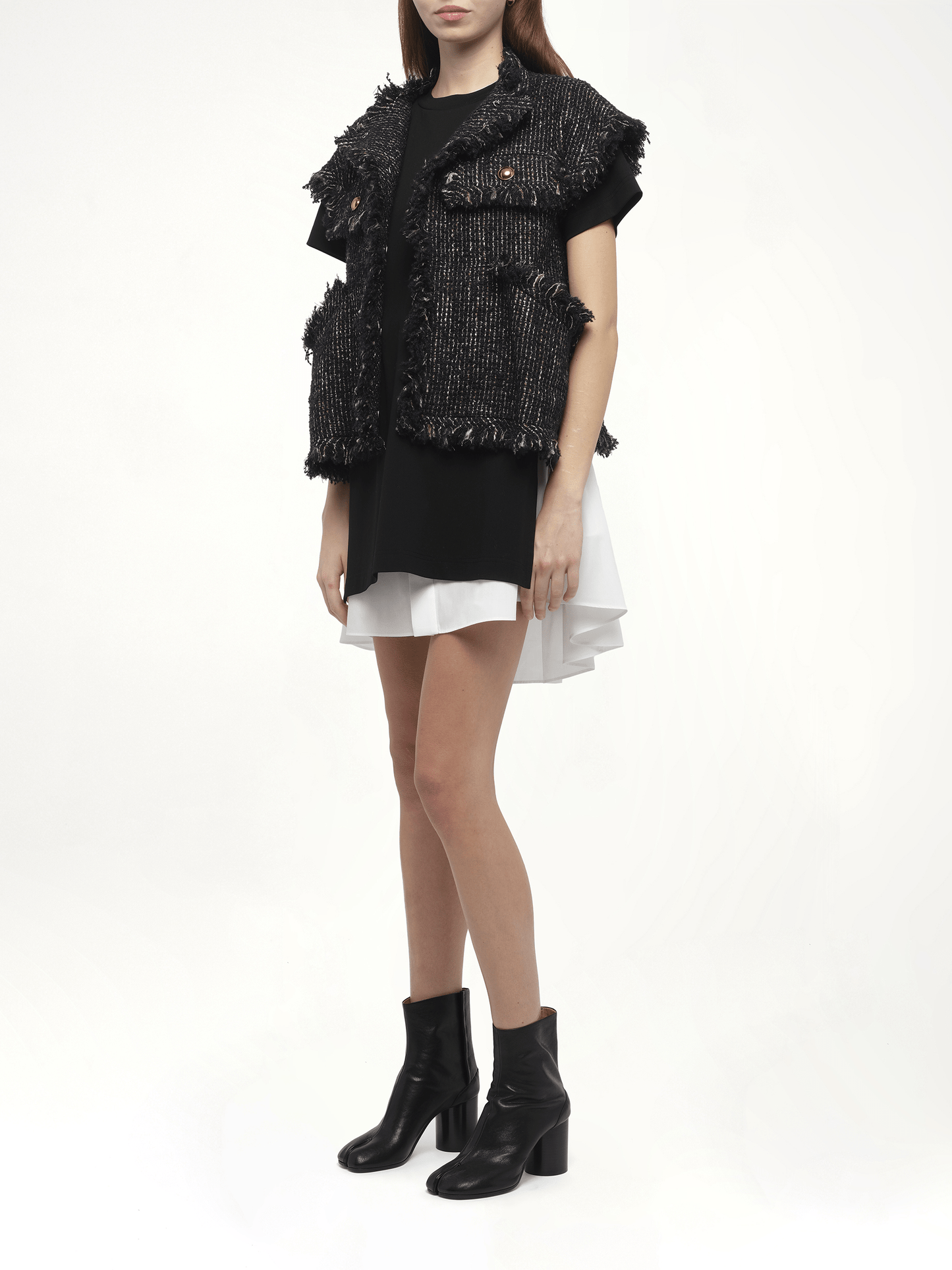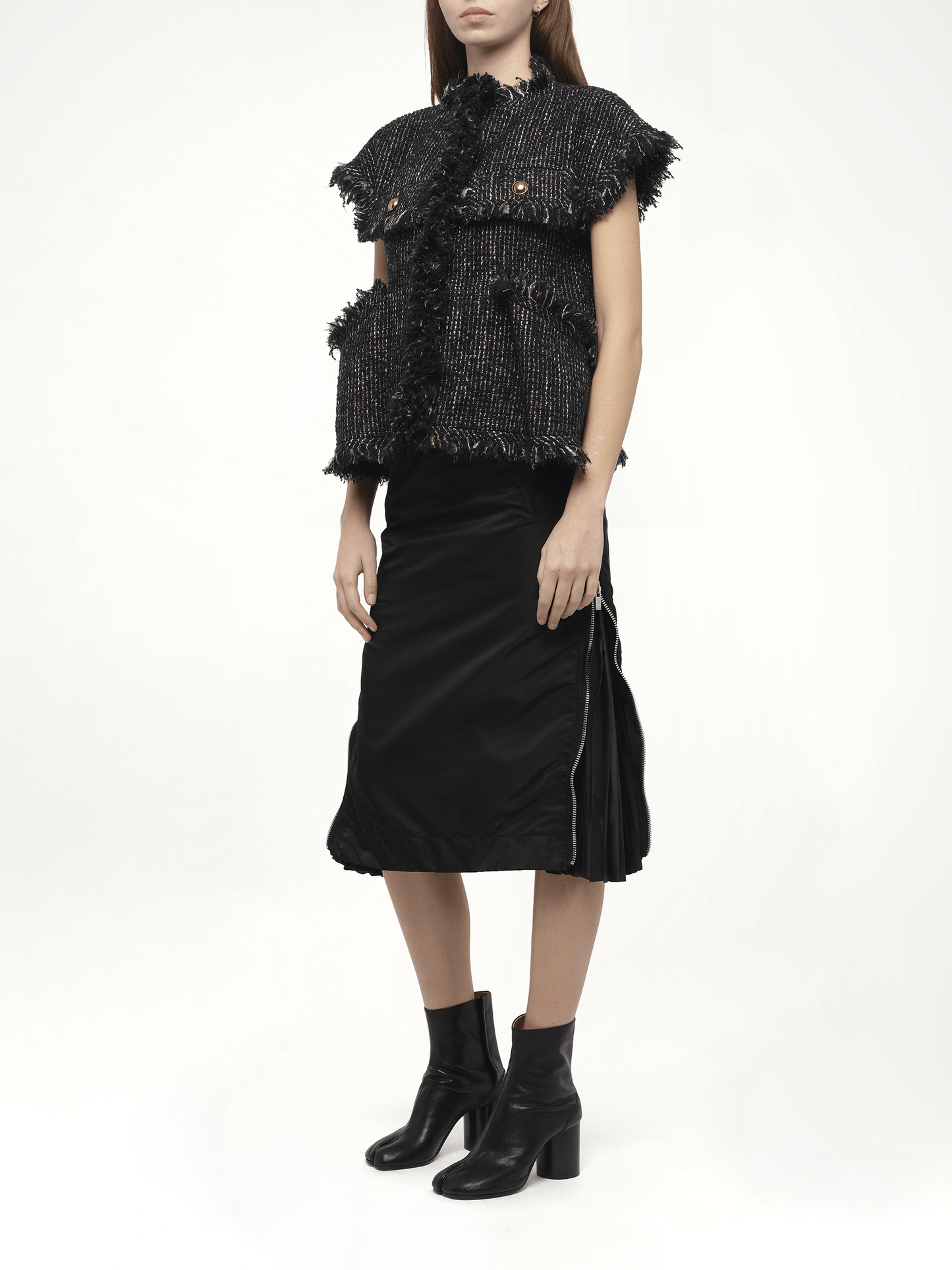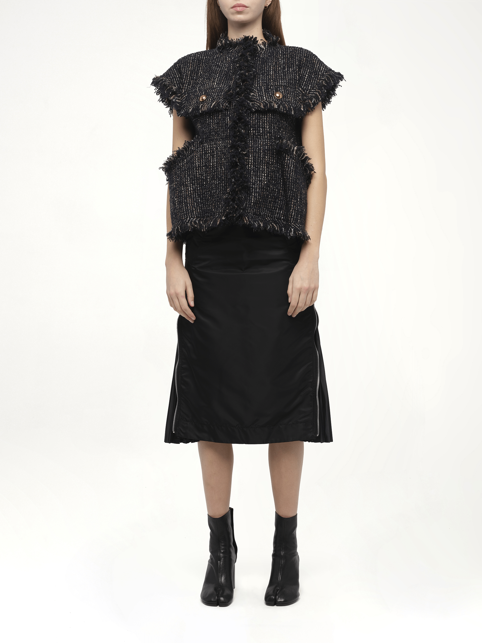 SACAI's Tweed Jacket in Navy is a sophisticated blend of classic style and modern design. This versatile piece is perfect for elevating any wardrobe with its timeless appeal.