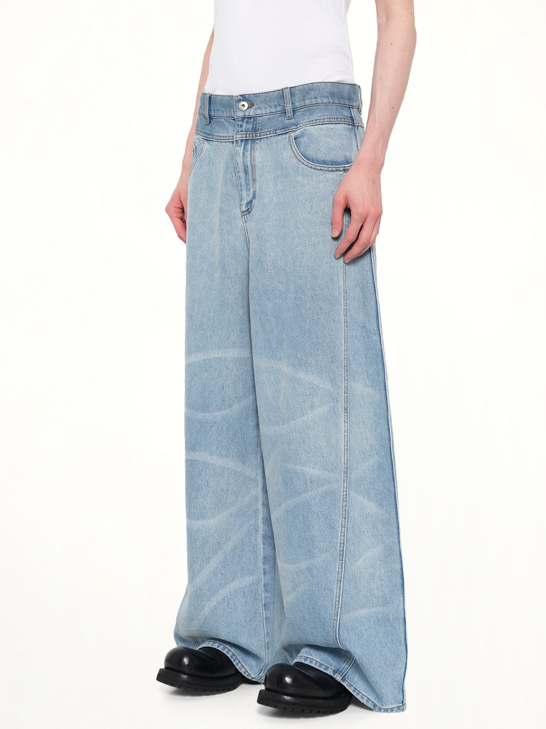 Feng Chen Wang's Wide Leg Denim Trousers in Blue is a contemporary take on classic denim, offering a relaxed fit with a modern edge. These trousers are designed to make a statement while ensuring comfort and style.