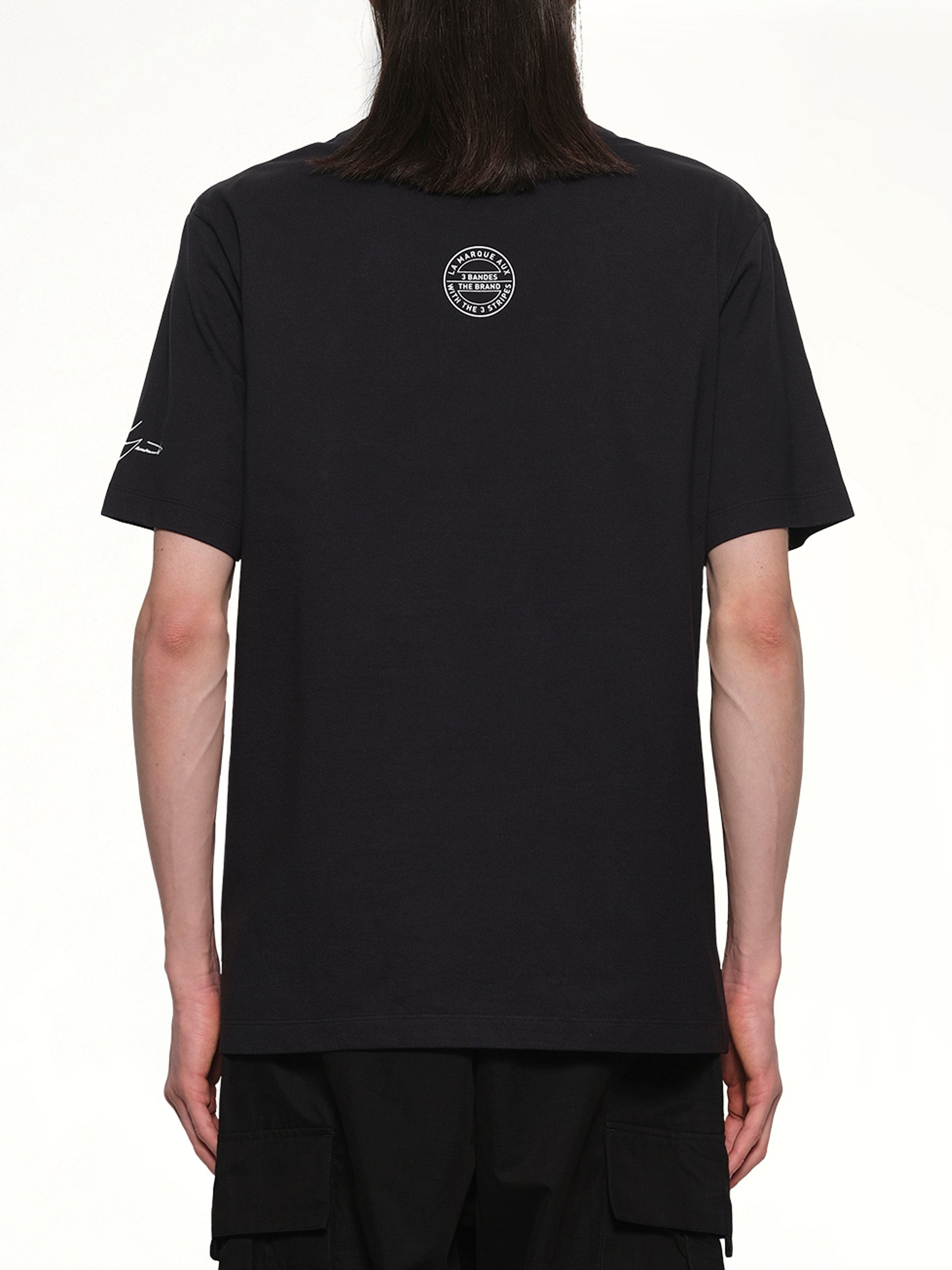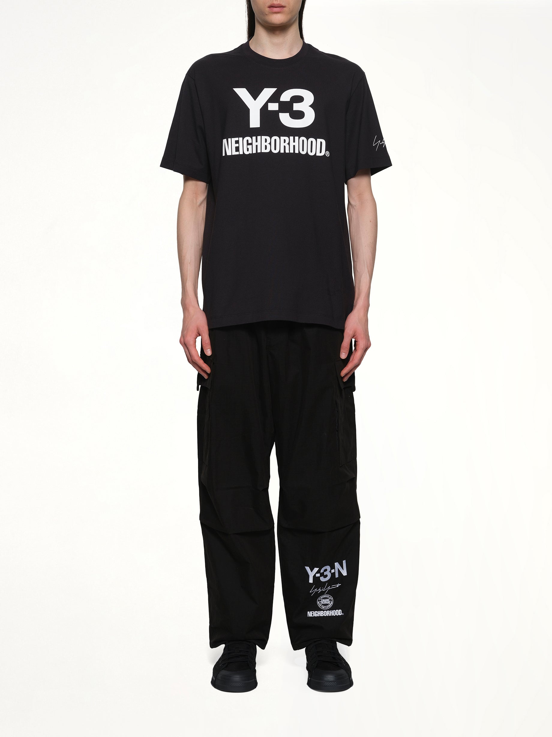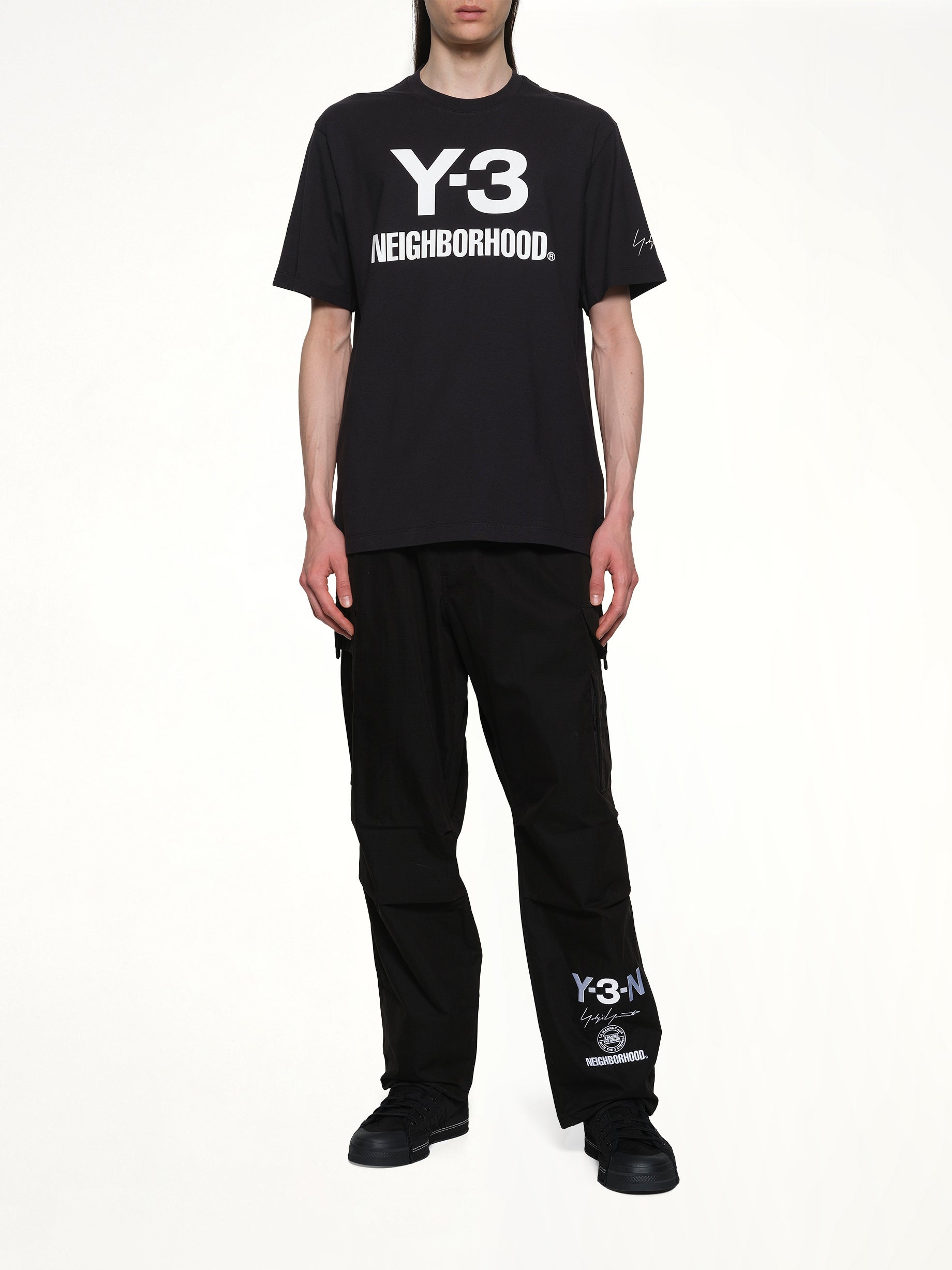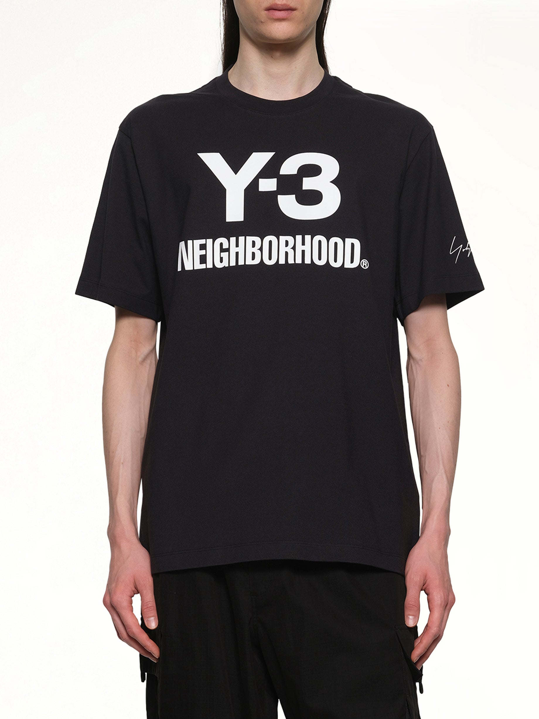 Y-3 X NBHD's Logo T-Shirt in Black is a stylish collaboration piece that combines the avant-garde aesthetic of Y-3 with the streetwear influence of NBHD. This t-shirt features a bold logo design that makes a statement while offering a comfortable fit for everyday wear.