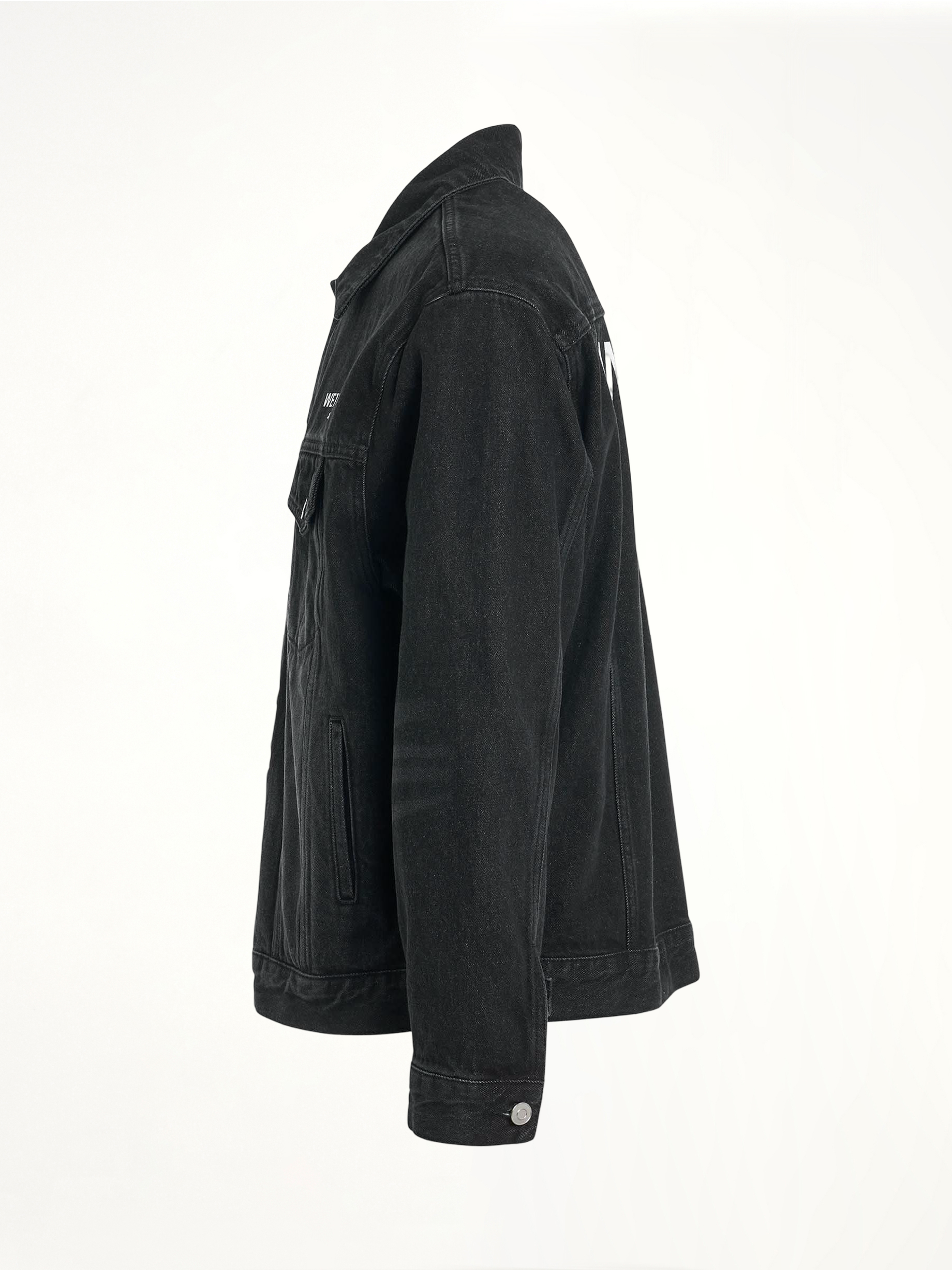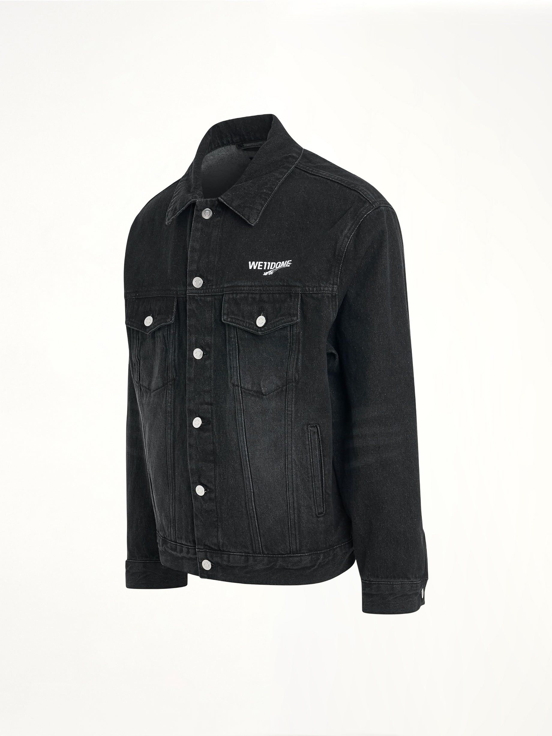 We11done's 1506 Logo Loose-Fit Denim Trucker Jacket in Black is a stylish and versatile outerwear piece. It combines a classic trucker silhouette with modern design elements for a contemporary look.