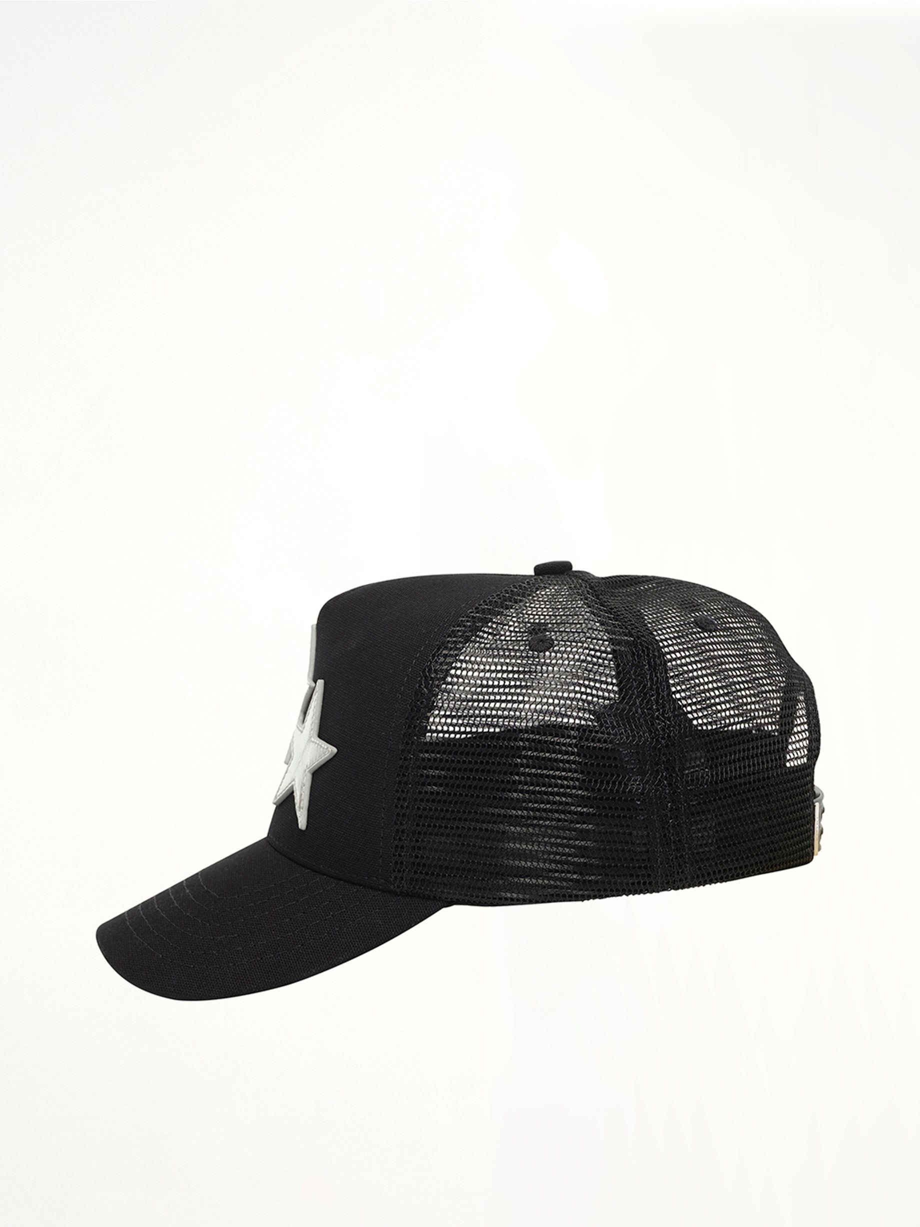 Amiri's 3 Star Metallic Trucker Hat in Black/Silver is a stylish accessory that combines modern design with classic trucker hat elements. Perfect for adding a touch of flair to any casual outfit.