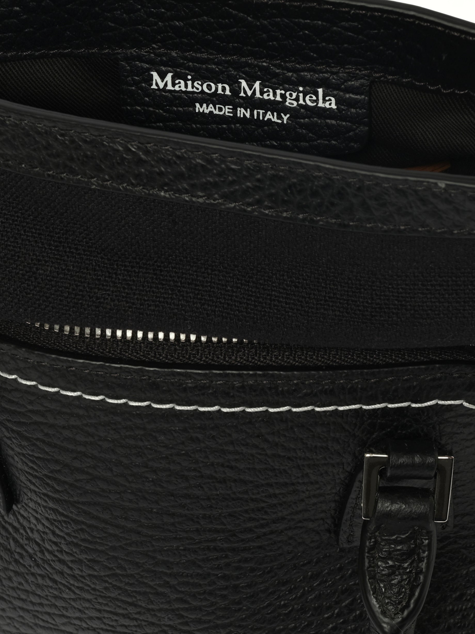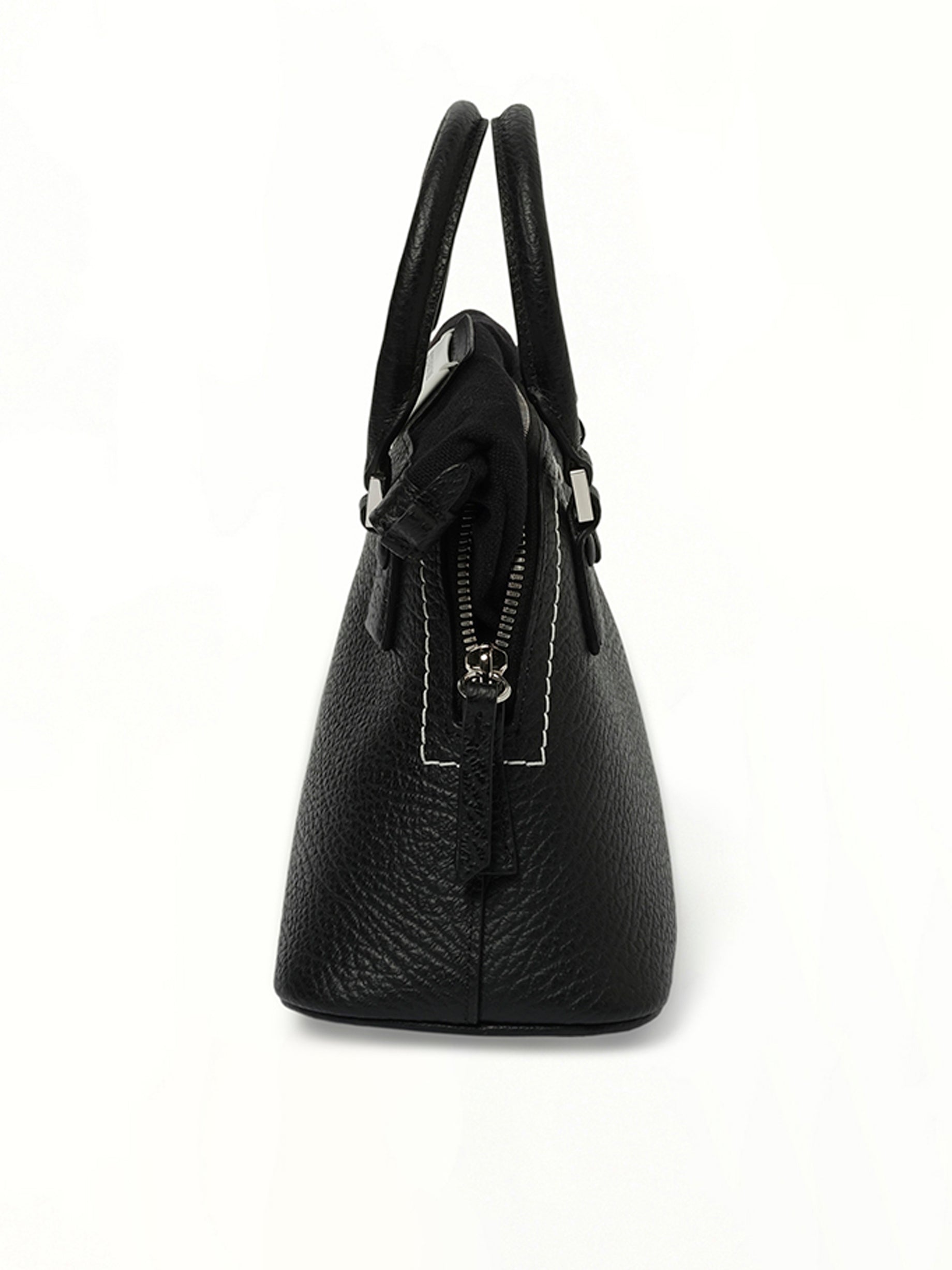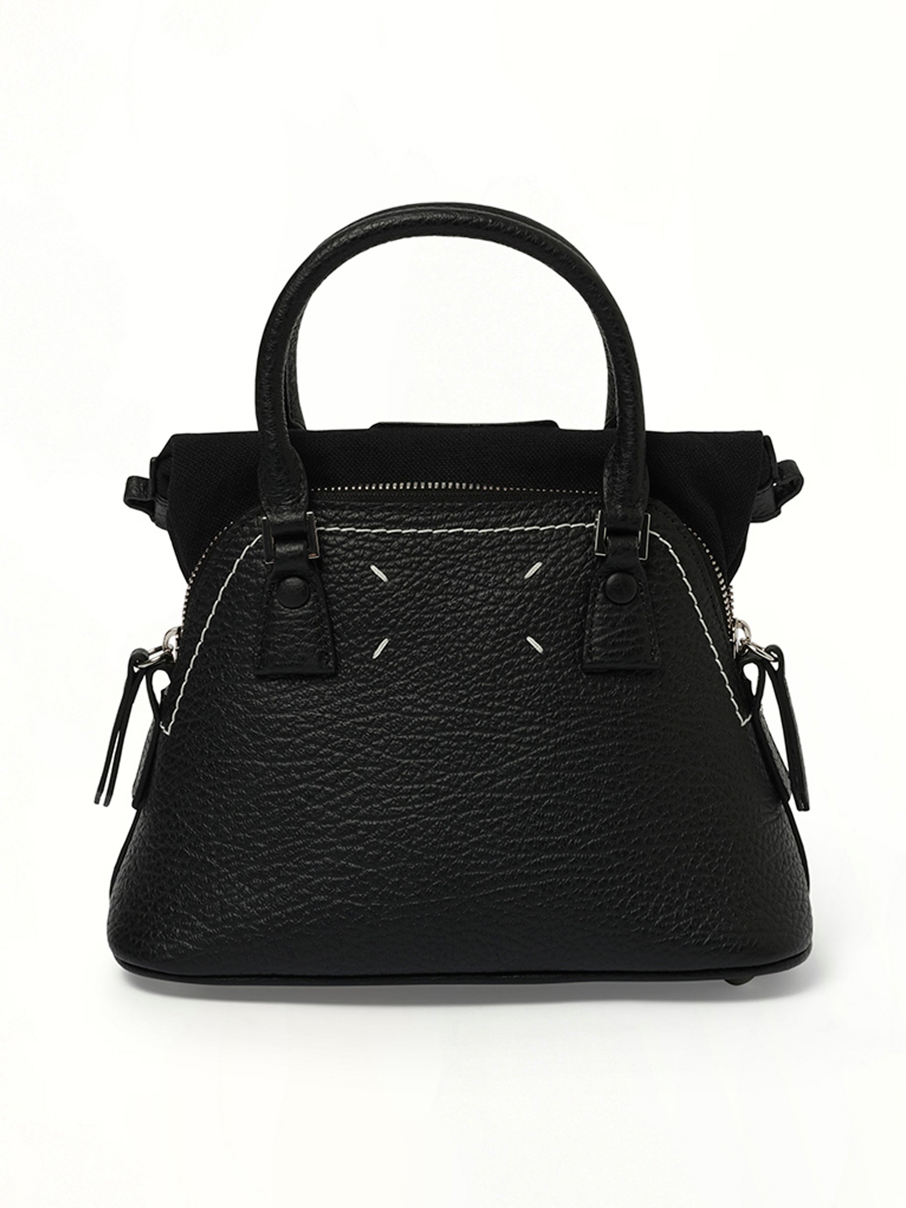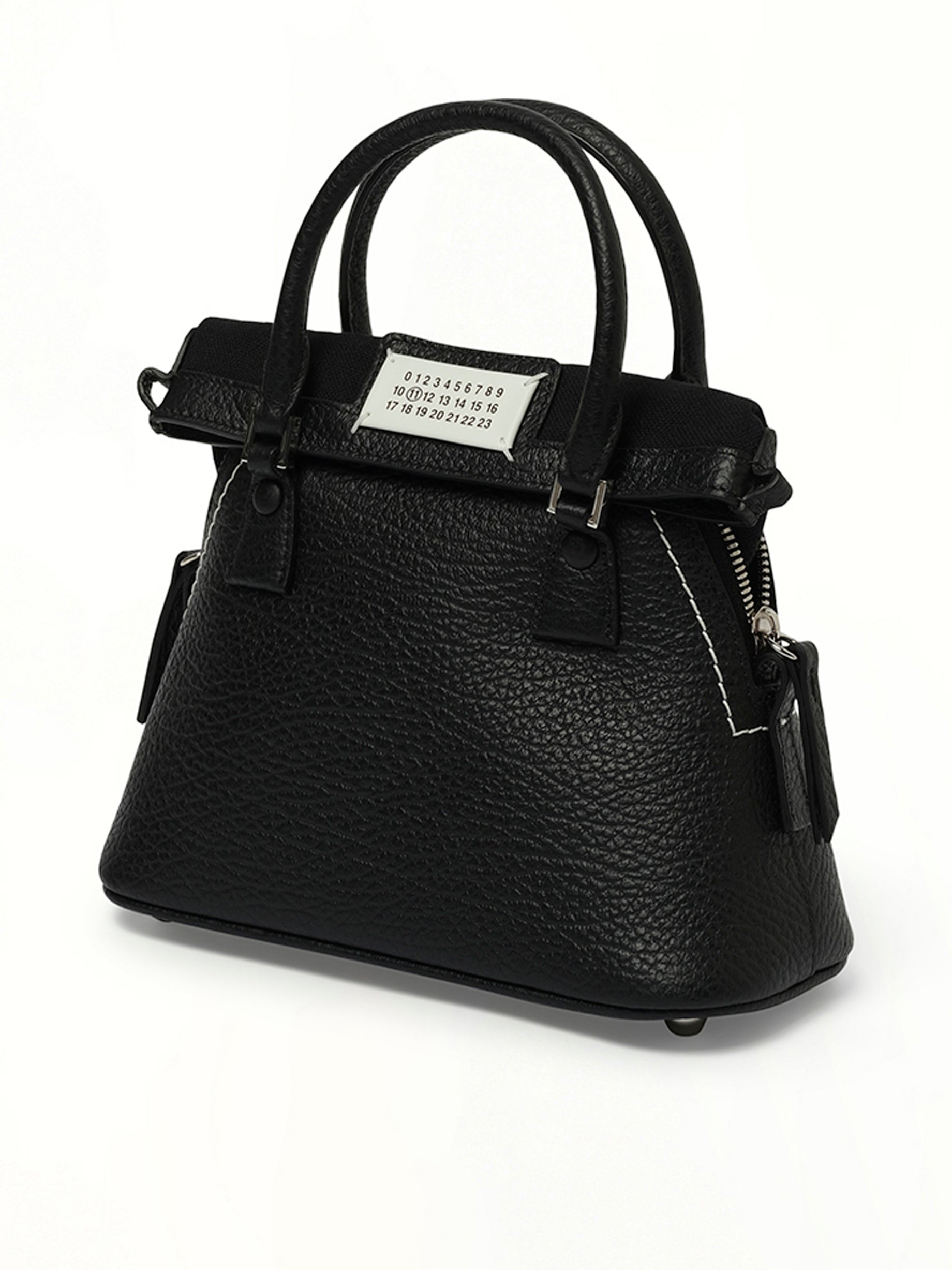 5AC micro bag in black with pebbled texture, logo patch to the front, two top handles and detachable chain-link shoulder strap