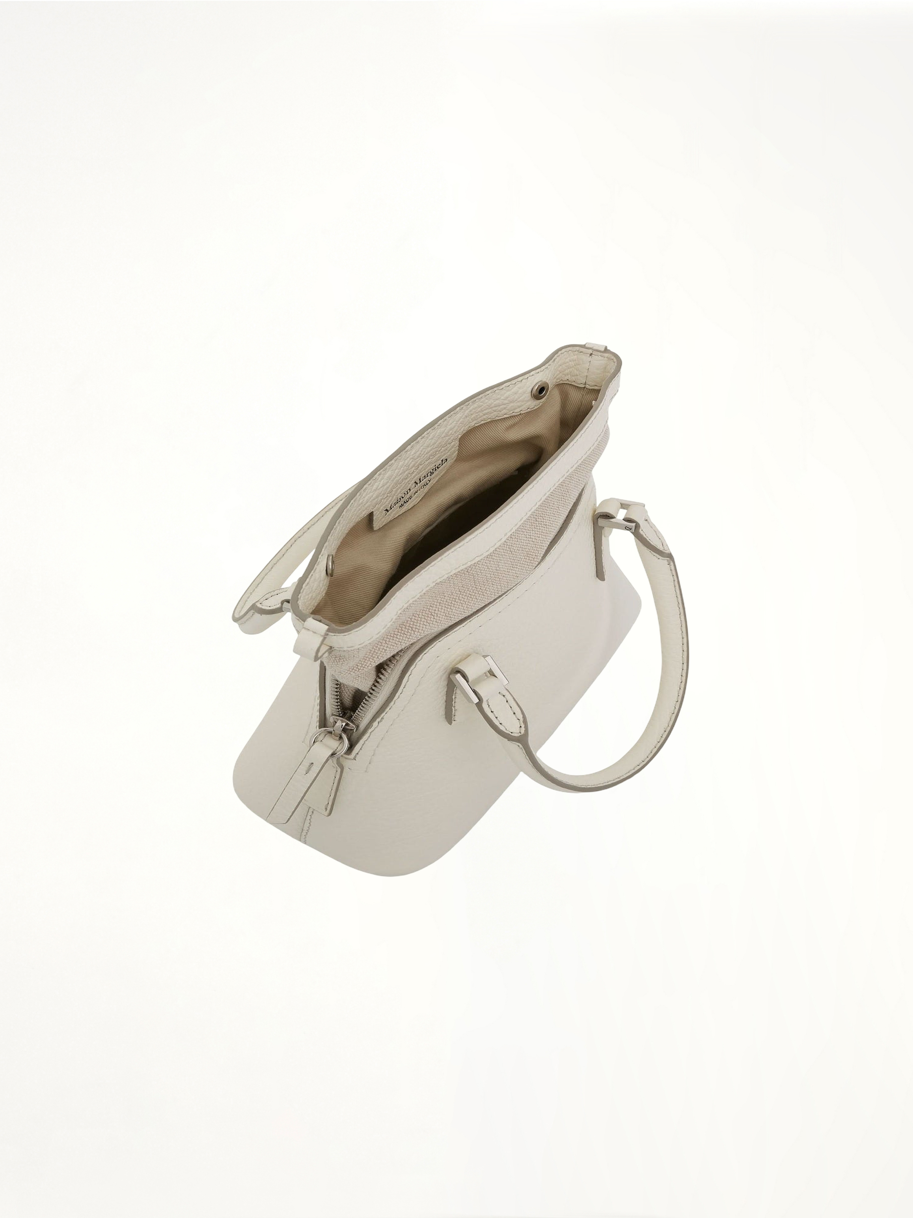5AC micro bag in white with pebbled texture, logo patch to the front, two top handles and detachable chain-link shoulder strap