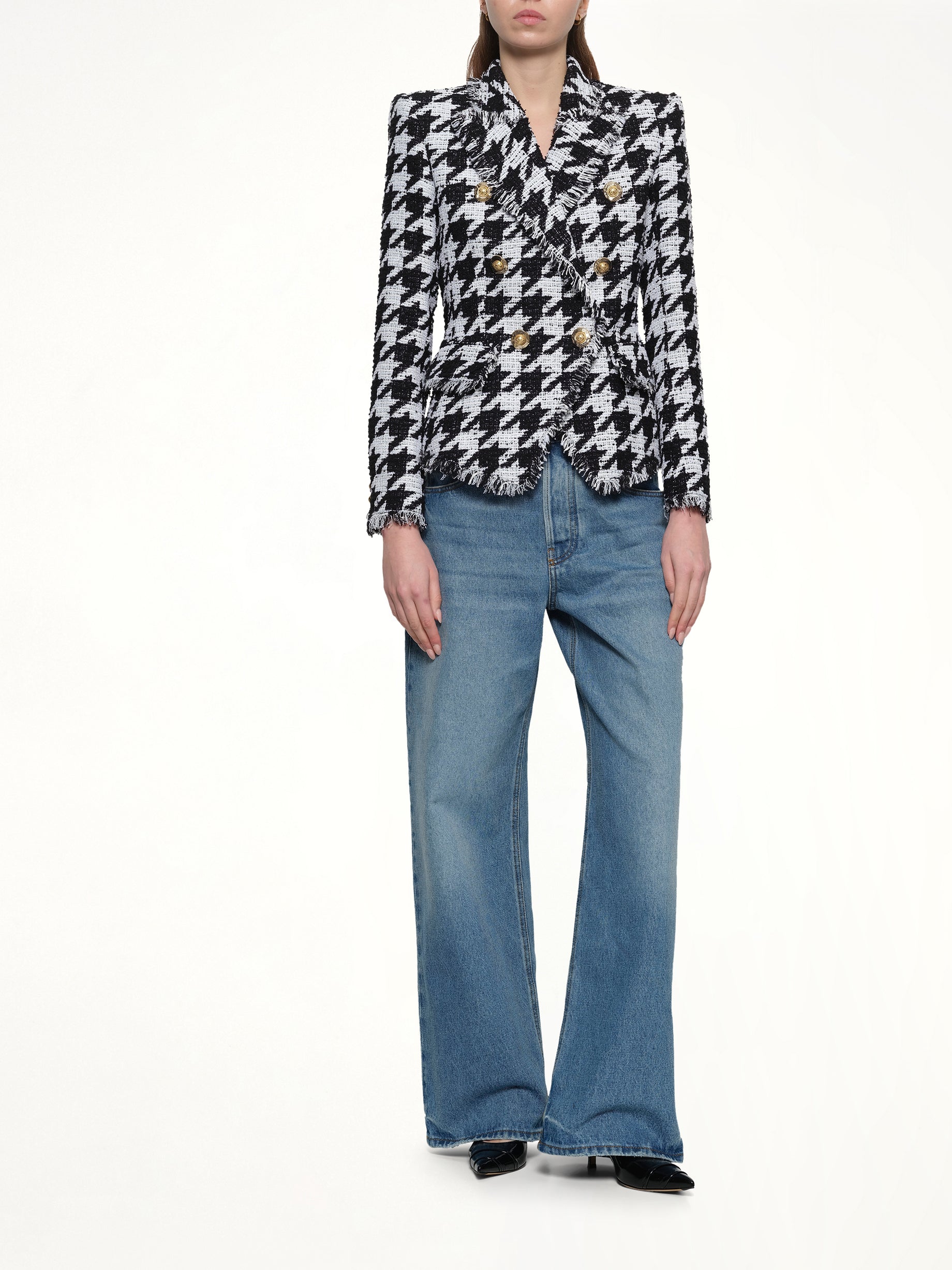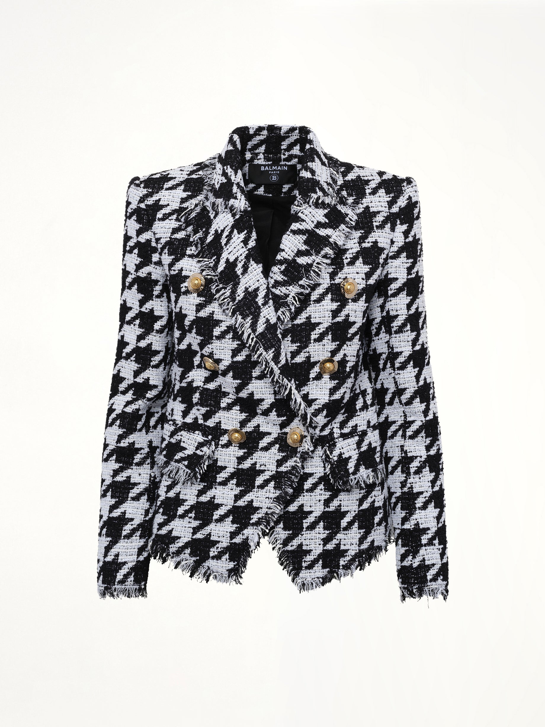 Balmain's 6 Buttons Fitted Tweed Jacket in White/Black is a sophisticated piece that combines classic elegance with modern style. This jacket is designed to make a statement with its structured silhouette and luxurious detailing.