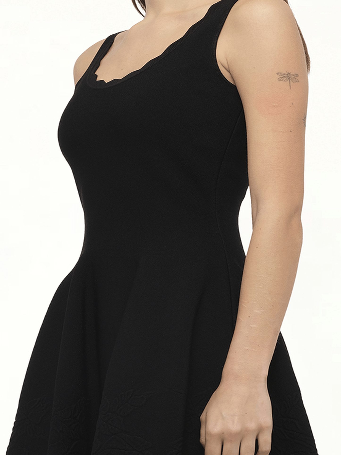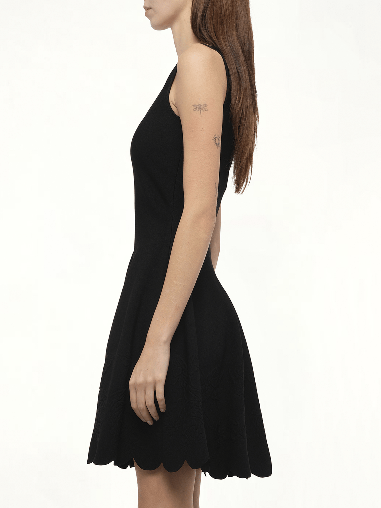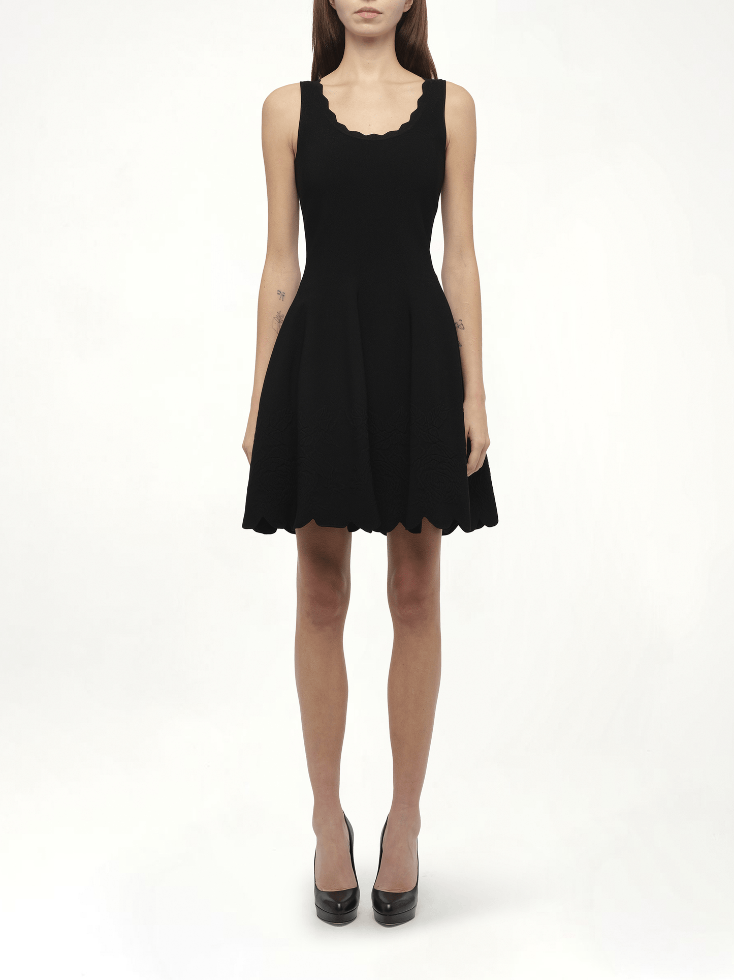 This elegant black mini dress features intricate rose embroidery that adds sophisticated texture and visual interest to its sleek silhouette. The refined embellishment creates a luxurious dimensional effect against the dark backdrop, while the mini length offers versatile styling options. Meticulously crafted for both aesthetic appeal and comfort, this piece effortlessly transitions from day to evening occasions.