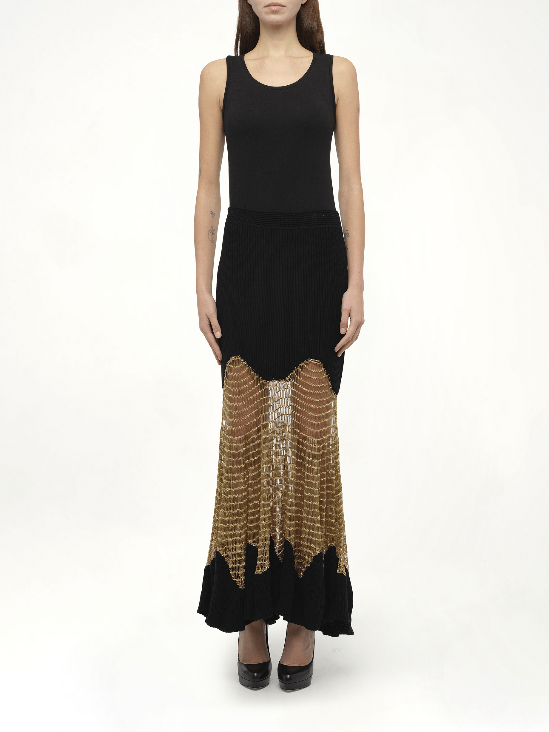 This Alexander McQueen wool skirt in black and gold exemplifies superior textile engineering and design precision. The premium wool construction provides exceptional drape and structure while maintaining thermal efficiency. The distinctive black/gold colourway creates visual depth through strategic contrast, demonstrating sophisticated colour theory application. Expertly tailored with meticulous attention to proportions and finishing details, this piece represents the intersection of technical craftsmanship and refined aesthetics for the discerning wardrobe.