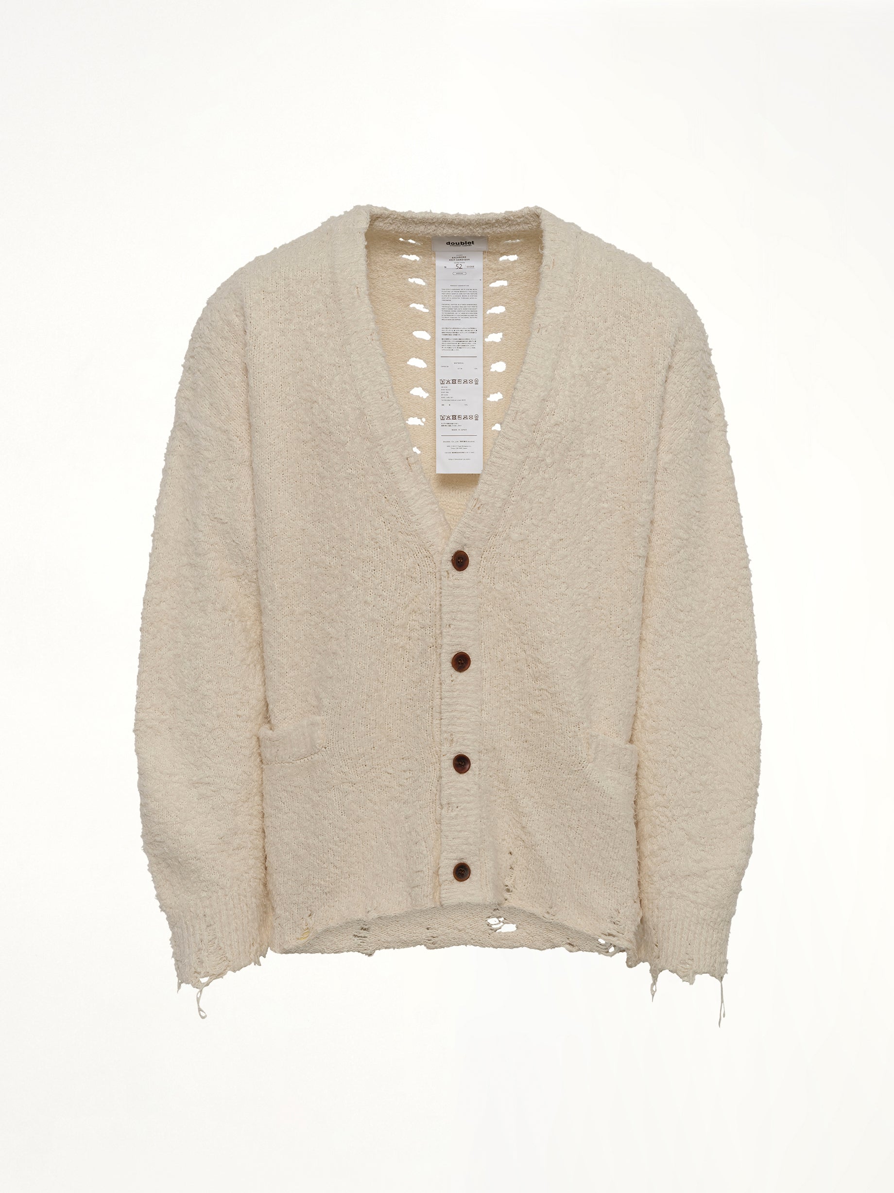 Doublet's Backbone Knit Cardigan in Ivory is a stylish and versatile addition to any wardrobe. This cardigan offers a perfect blend of comfort and contemporary design.