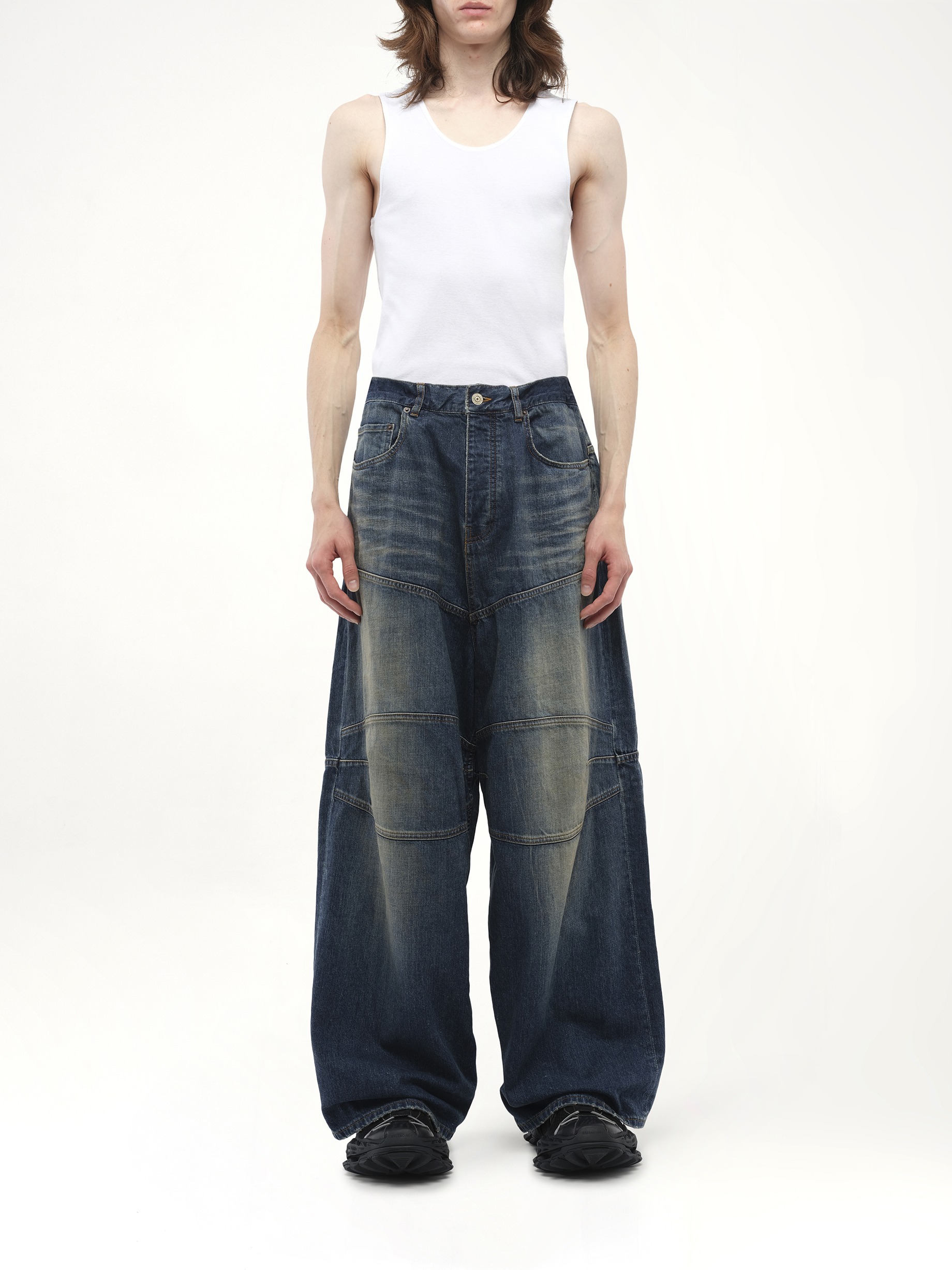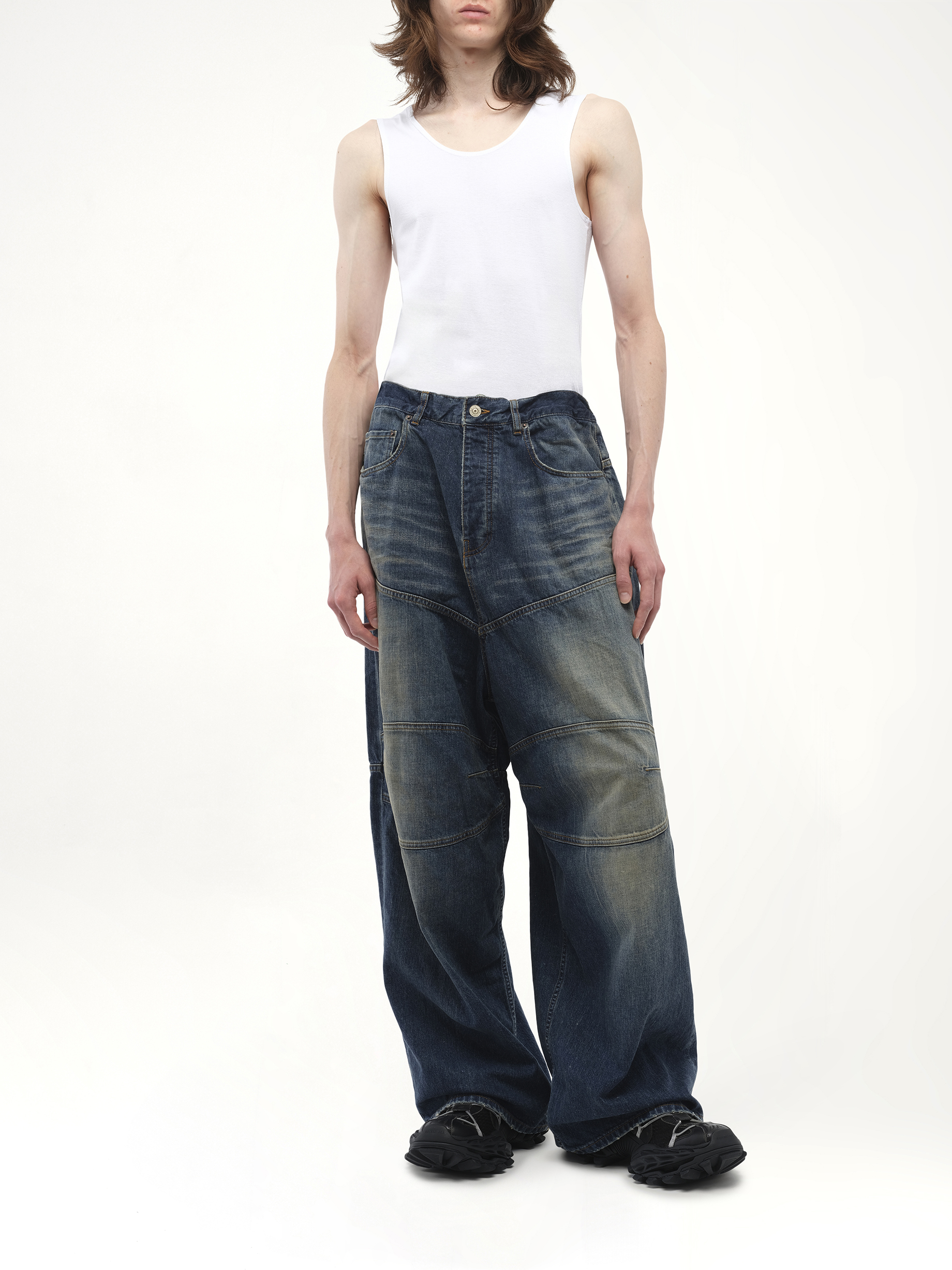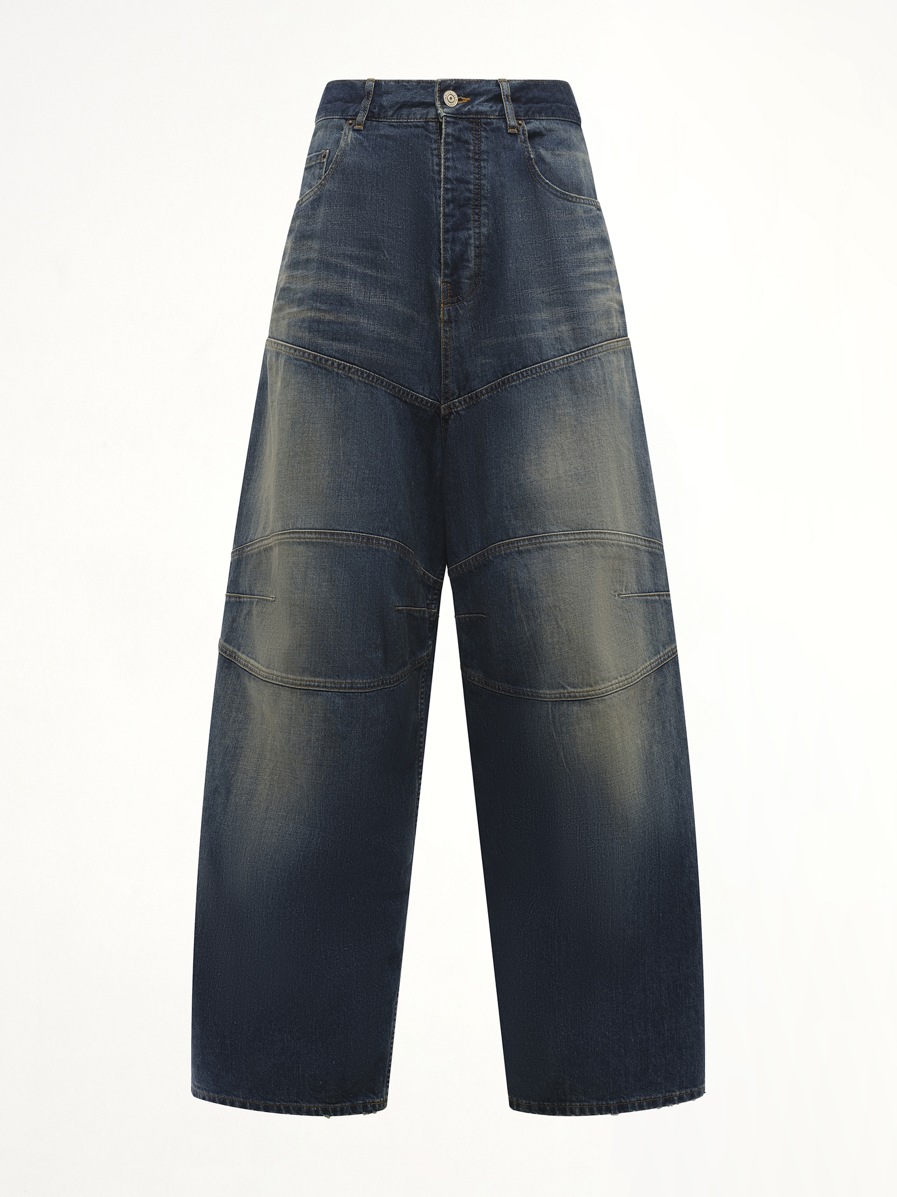Balenciaga's Baggy Denim Pants in Whisker, a relaxed silhouette crafted from premium rigid Japanese denim with a distinctive stonewashed finish. These jeans merge oversized structure with timeless detailing for a bold take on classic denim.