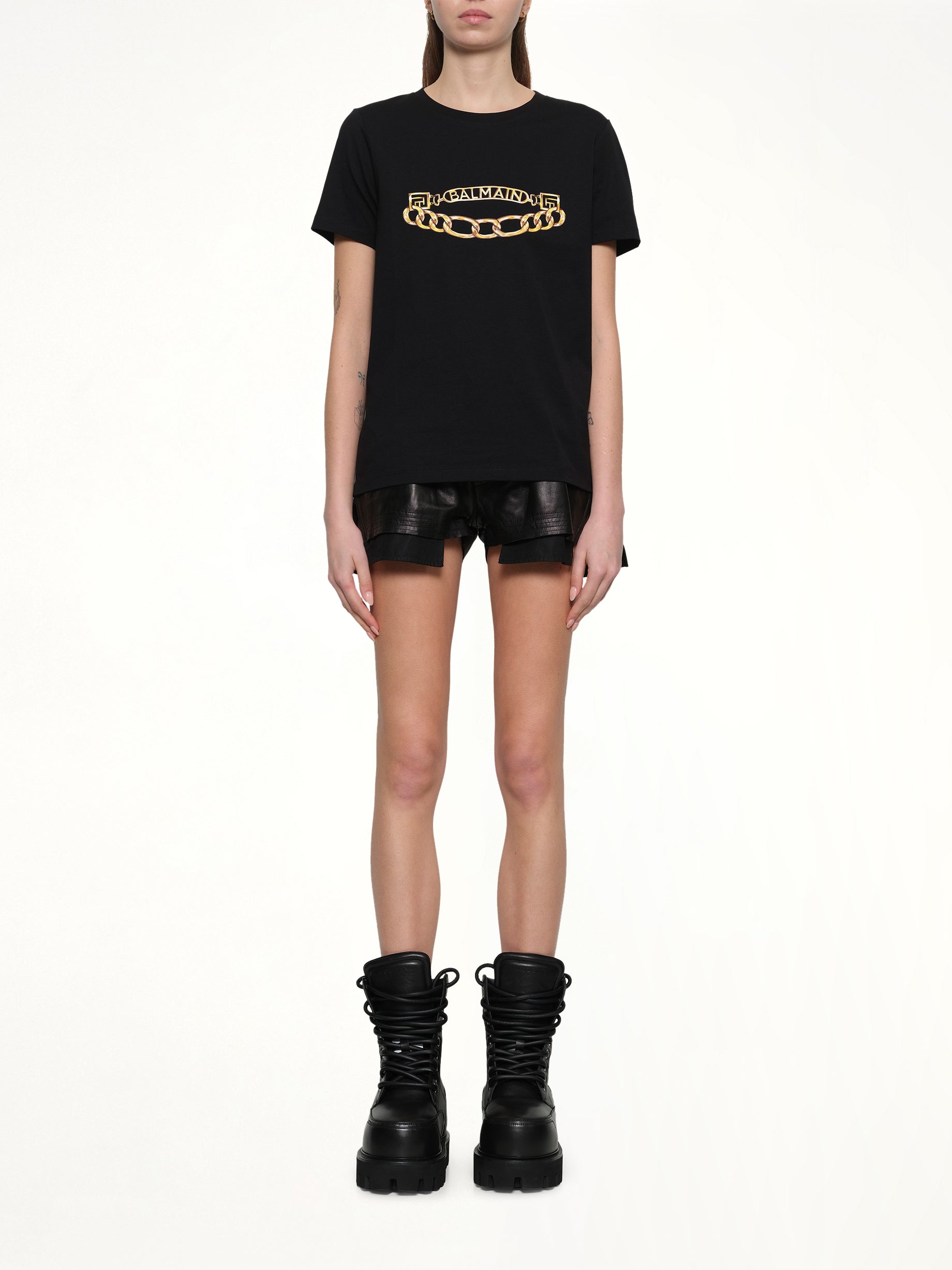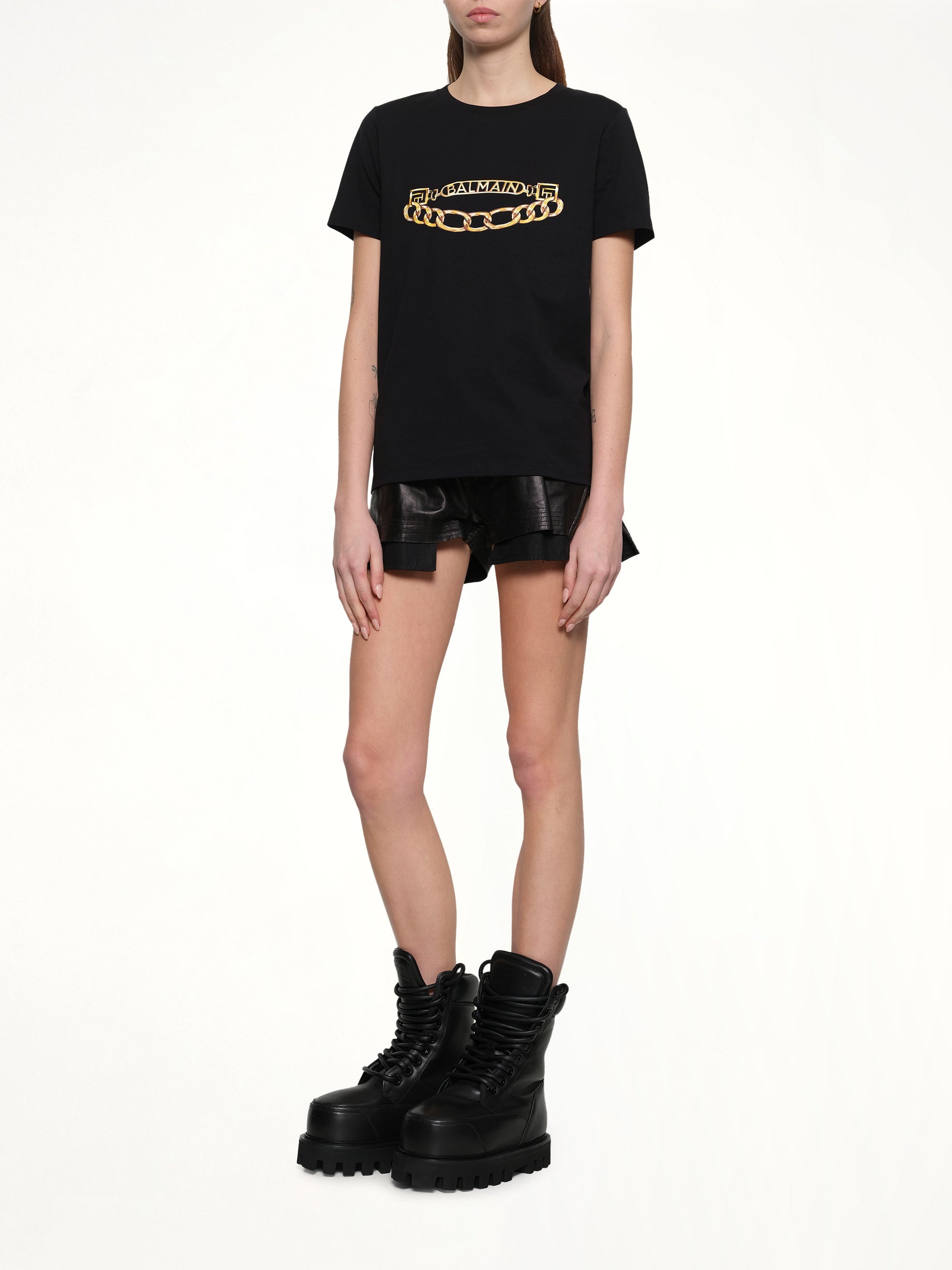 Balmain's Balmain Chains Printed T-Shirt in Black/Gold is a striking piece that combines luxury with a bold design. This t-shirt features an intricate chain print that adds a touch of opulence to any outfit.