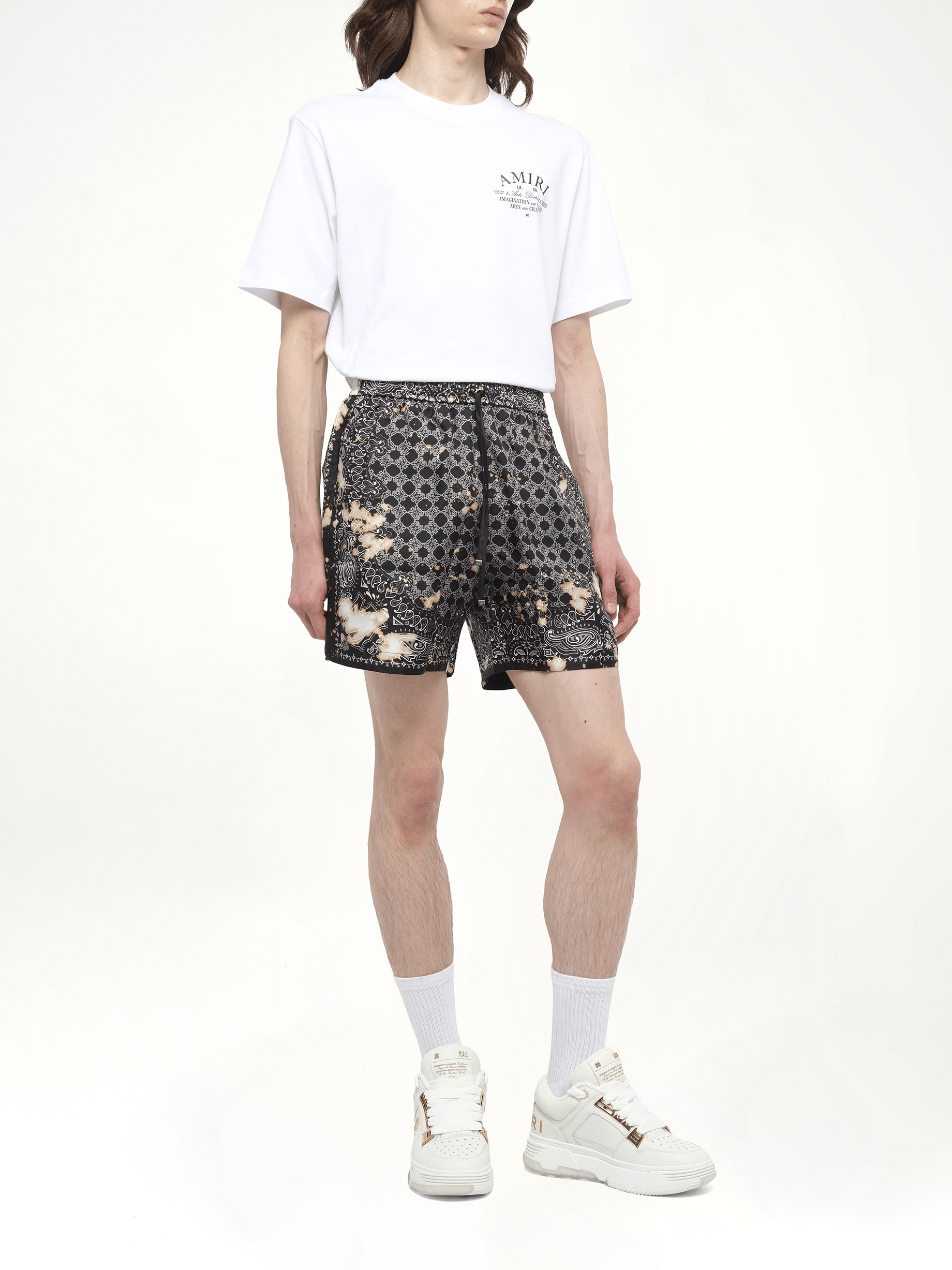 Amiri's Bleach Bandana Silk Shorts in Black offer a unique blend of luxury and street style, perfect for those who want to make a bold fashion statement. These shorts feature a distinctive bleach bandana print, adding an edgy touch to any outfit. Designed for comfort and style, they are an essential addition to any modern wardrobe.
