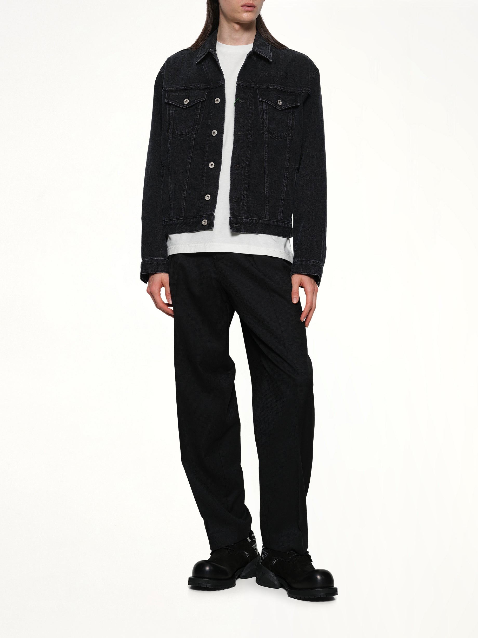 Kenzo's Boke Flower Trucker Jacket in Stone Bleached Black Denim is a stylish and versatile piece that combines classic design with modern flair. Perfect for any casual outing, this jacket offers a unique aesthetic with its distinctive floral motif.