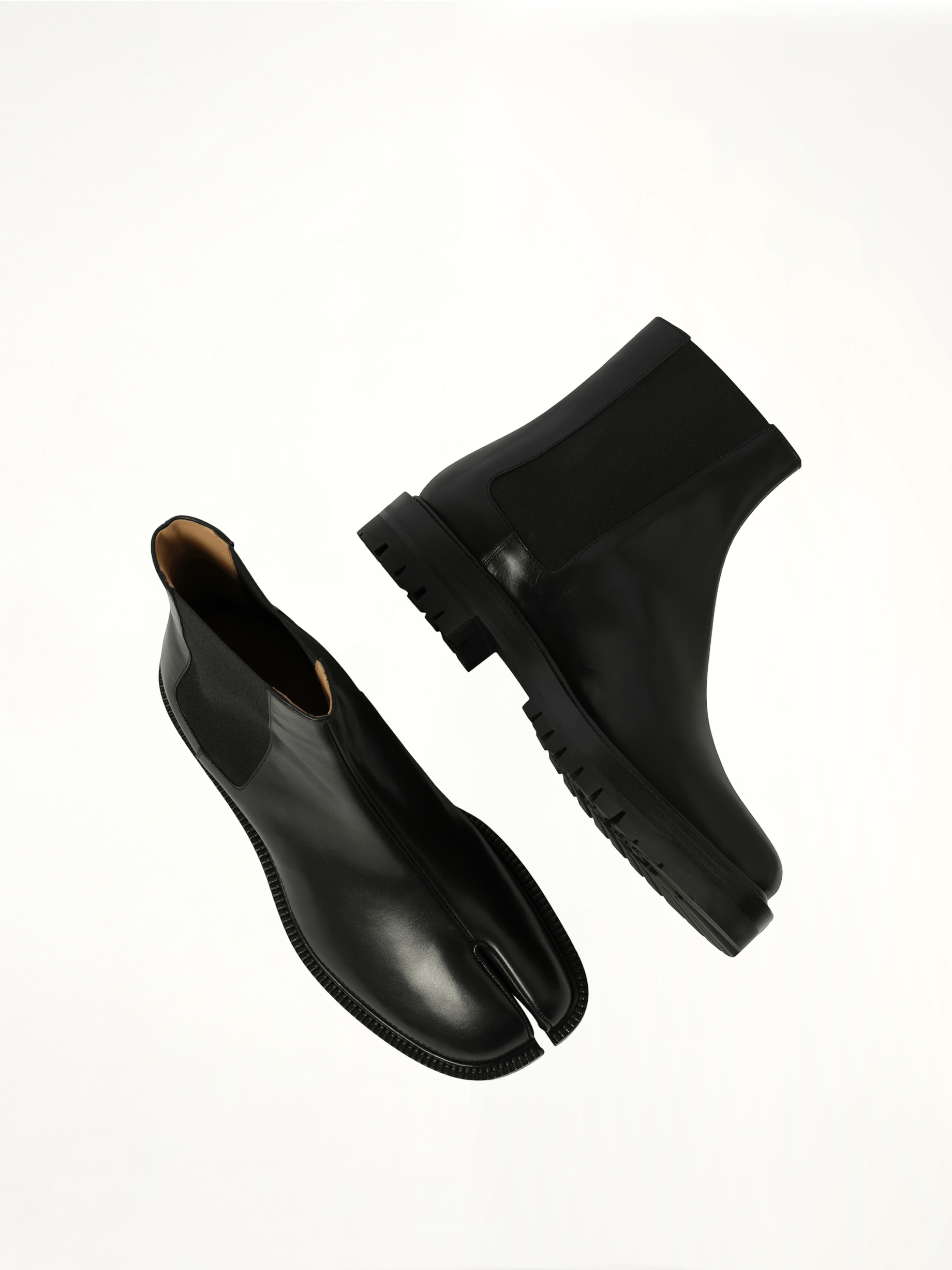 Crafted from high-quality calfskin leather, our Tabi County Chelsea Boots offer both style and durability. The iconic split toe design adds a unique touch to the classic Chelsea boot silhouette. Perfect for any occasion, these boots are sure to elevate any outfit.