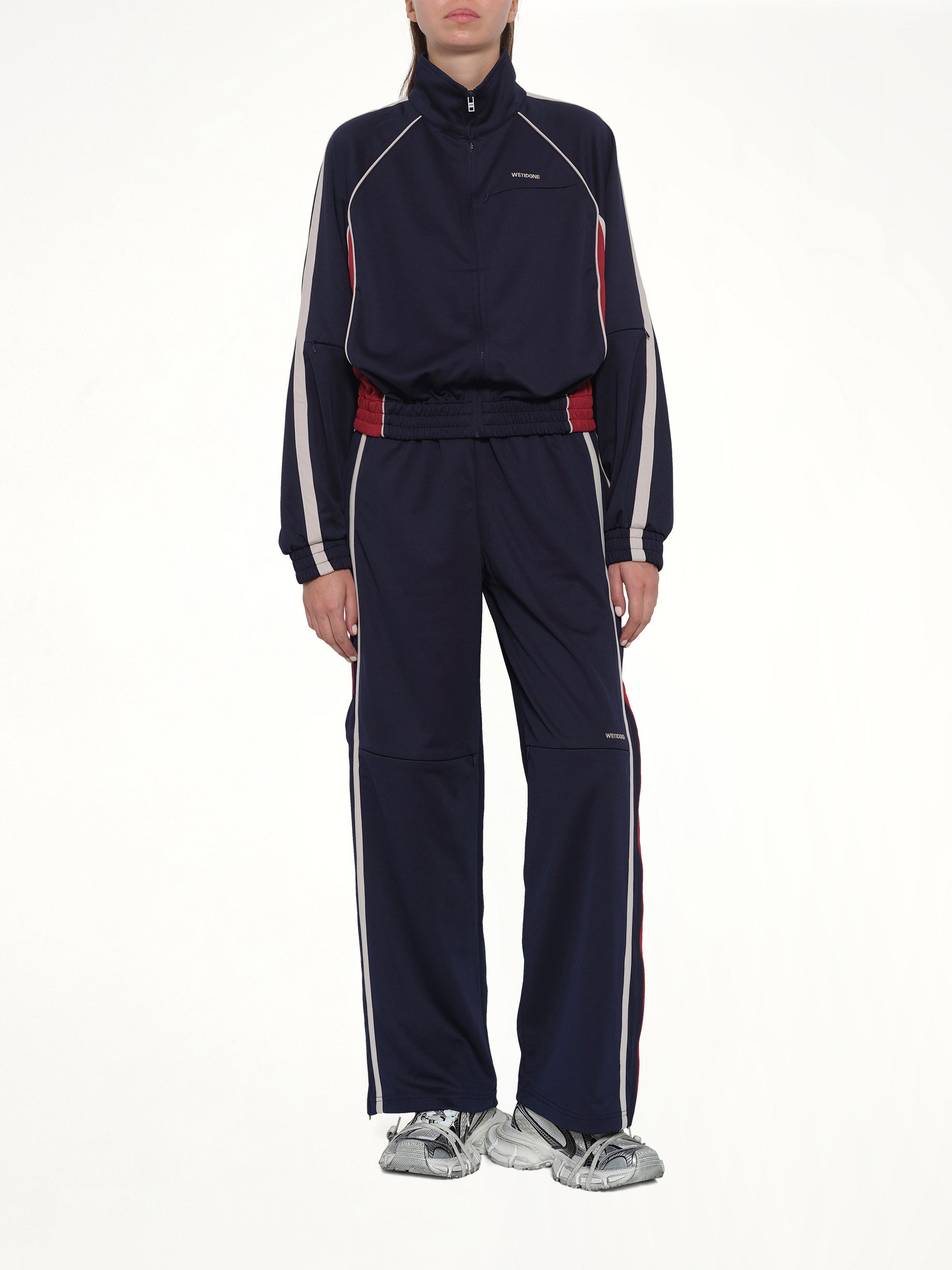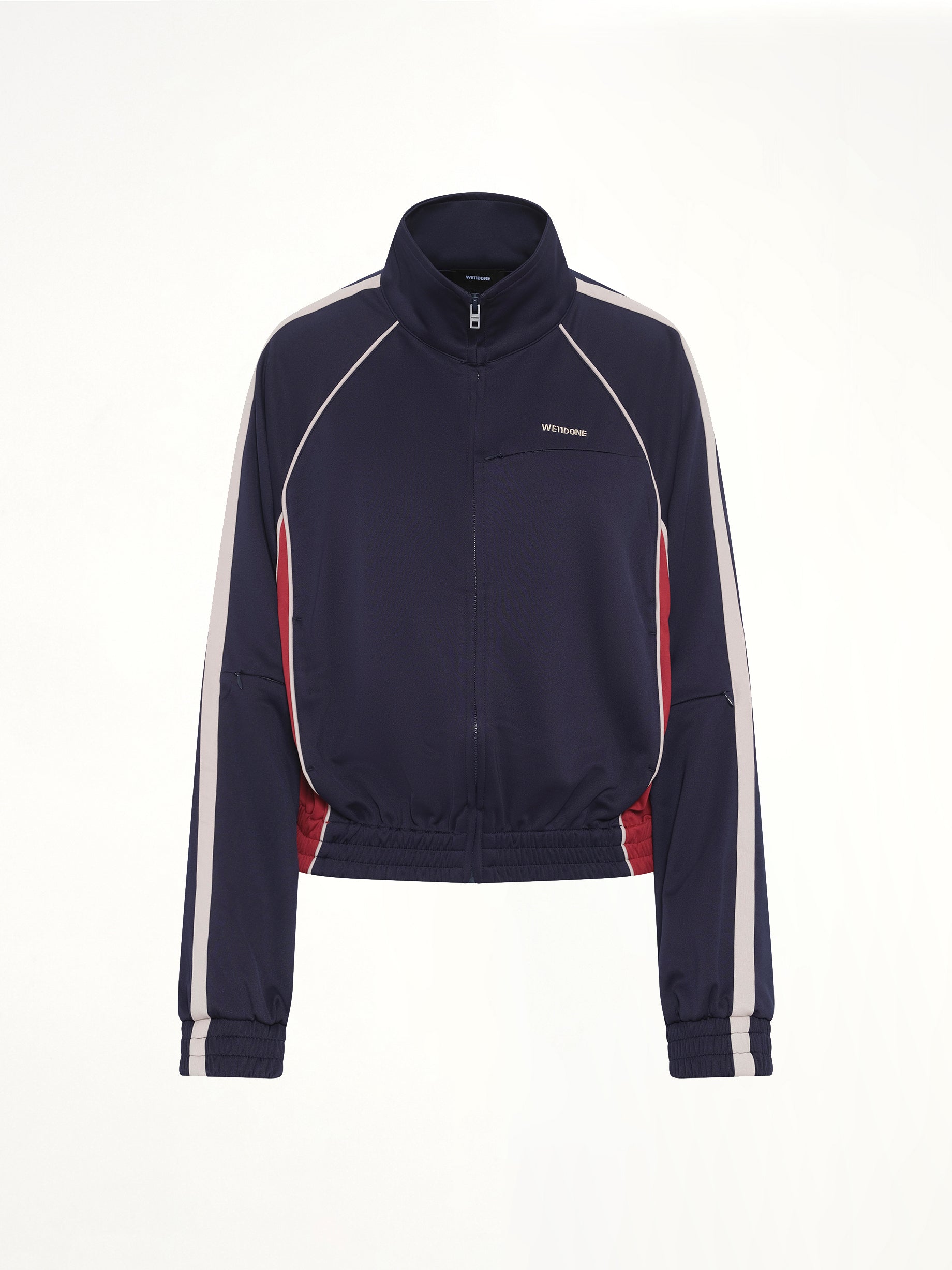 We11done's Contrast Track Jacket in Navy is a stylish and versatile addition to any wardrobe. This jacket combines a modern design with functional features, making it perfect for both casual and athletic wear.