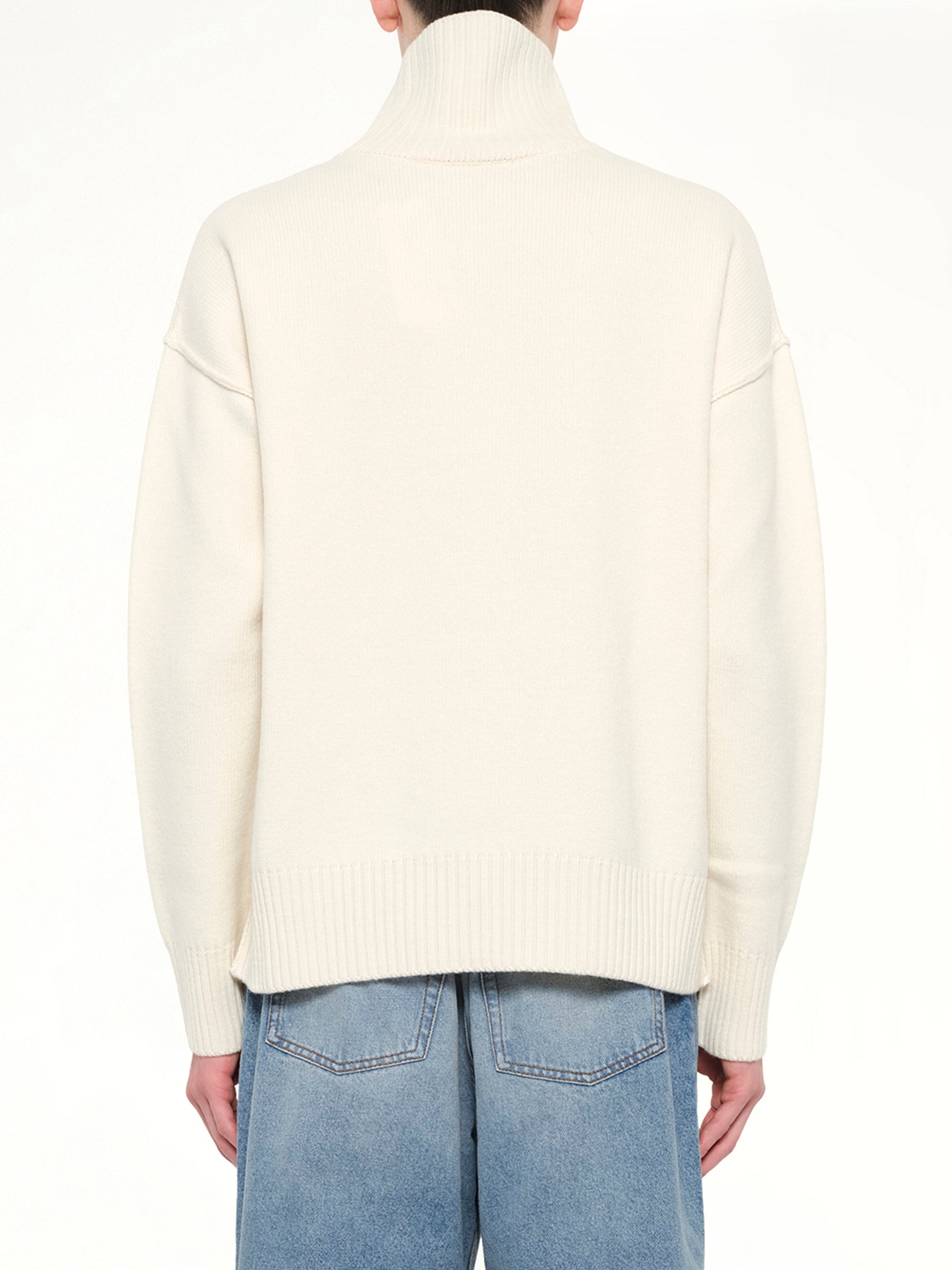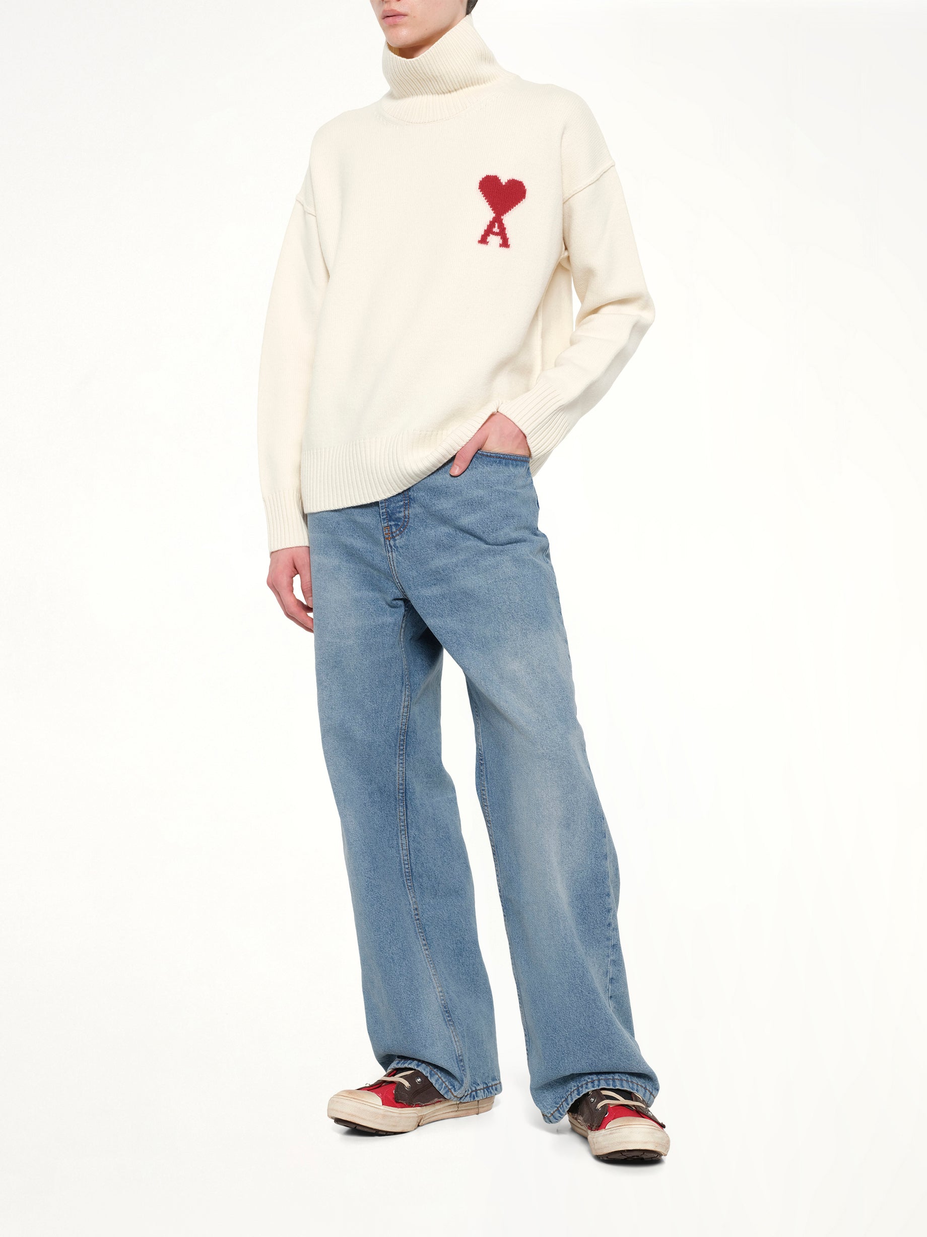 Ami Paris's Contrasted ADC Funnel Neck Sweater in Cream is a stylish and versatile addition to any wardrobe. This sweater combines a modern design with classic elements, making it perfect for both casual and formal occasions.