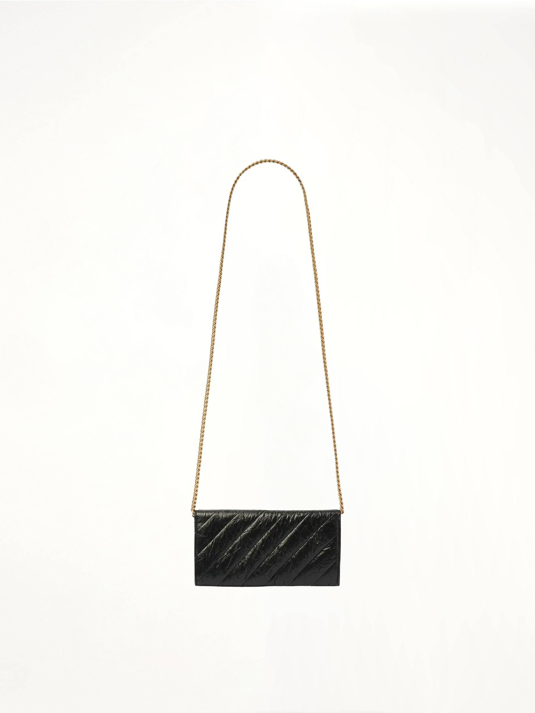 The Crush Wallet on Chain in Black is a stylish and versatile accessory that can be worn as a wallet or a crossbody bag. Made with durable black leather, this item features multiple compartments for organizing your essentials.