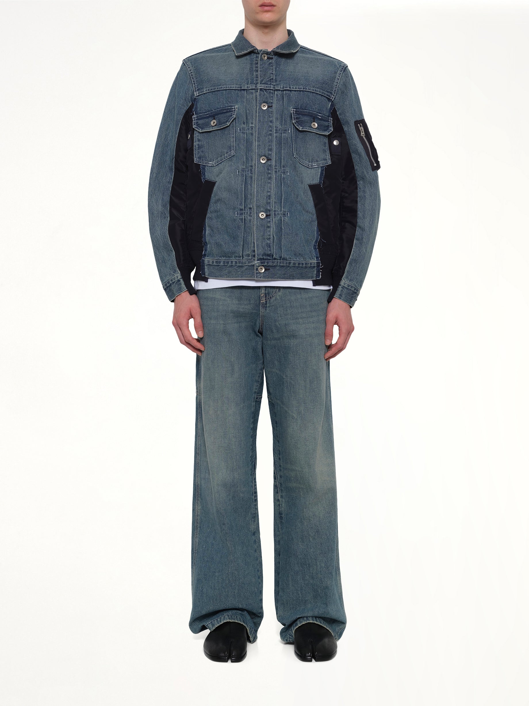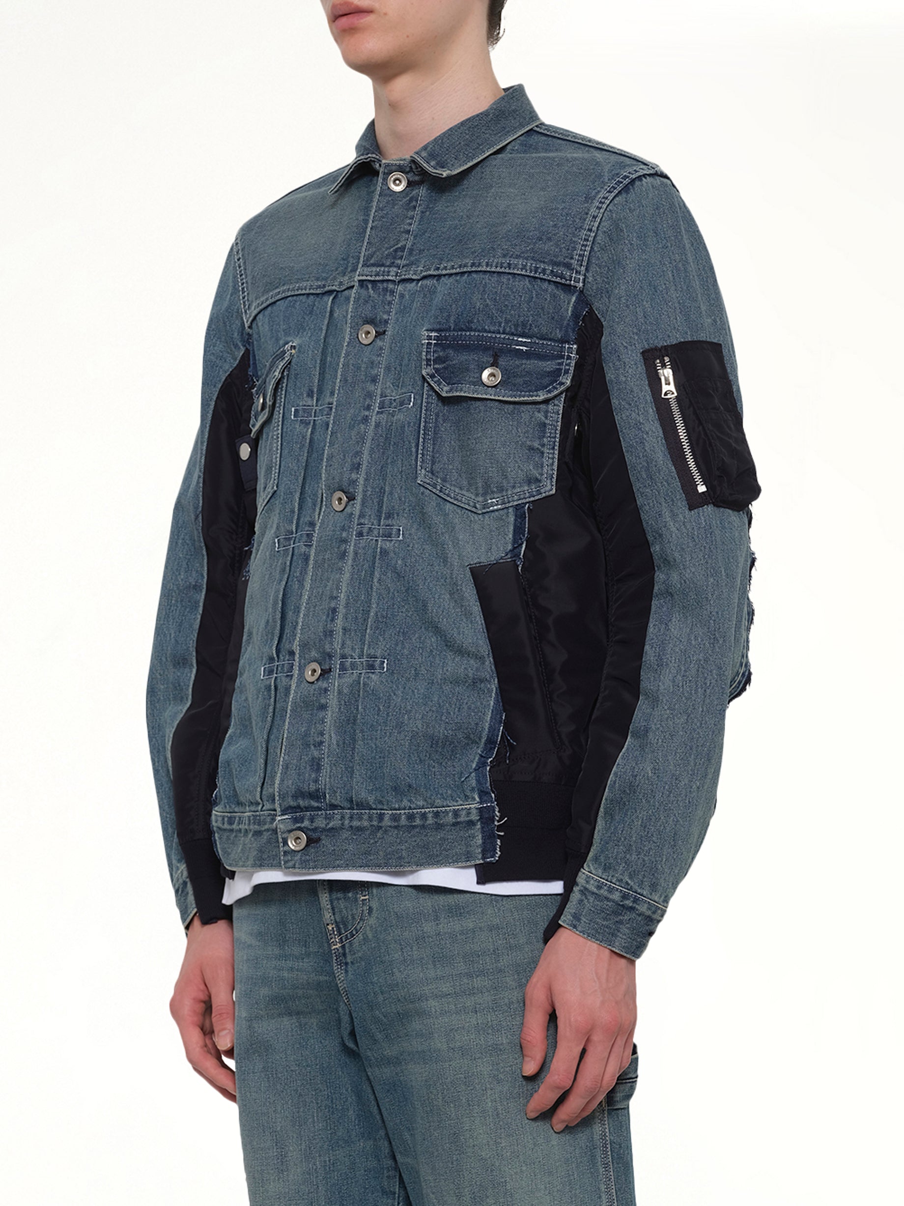 Sacai's Denim x Nylon Twill Jacket in Light Blue is a versatile piece that combines classic denim with modern nylon twill for a unique look. This jacket offers a contemporary twist on a timeless style, perfect for elevating any casual outfit.