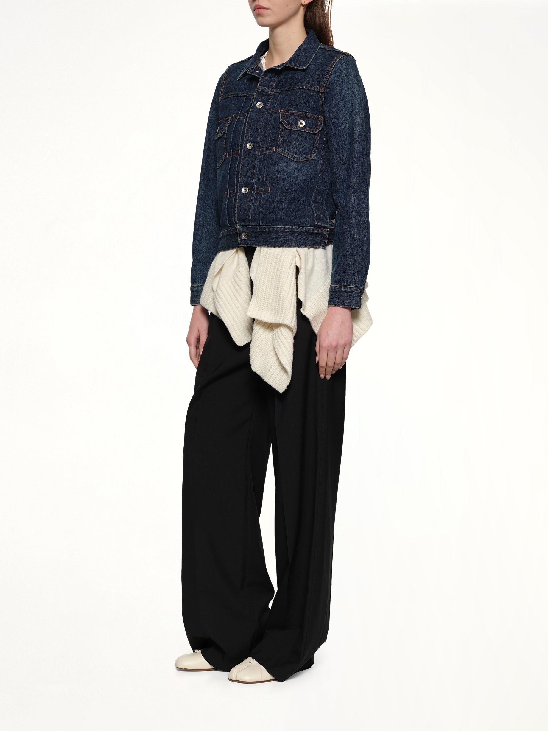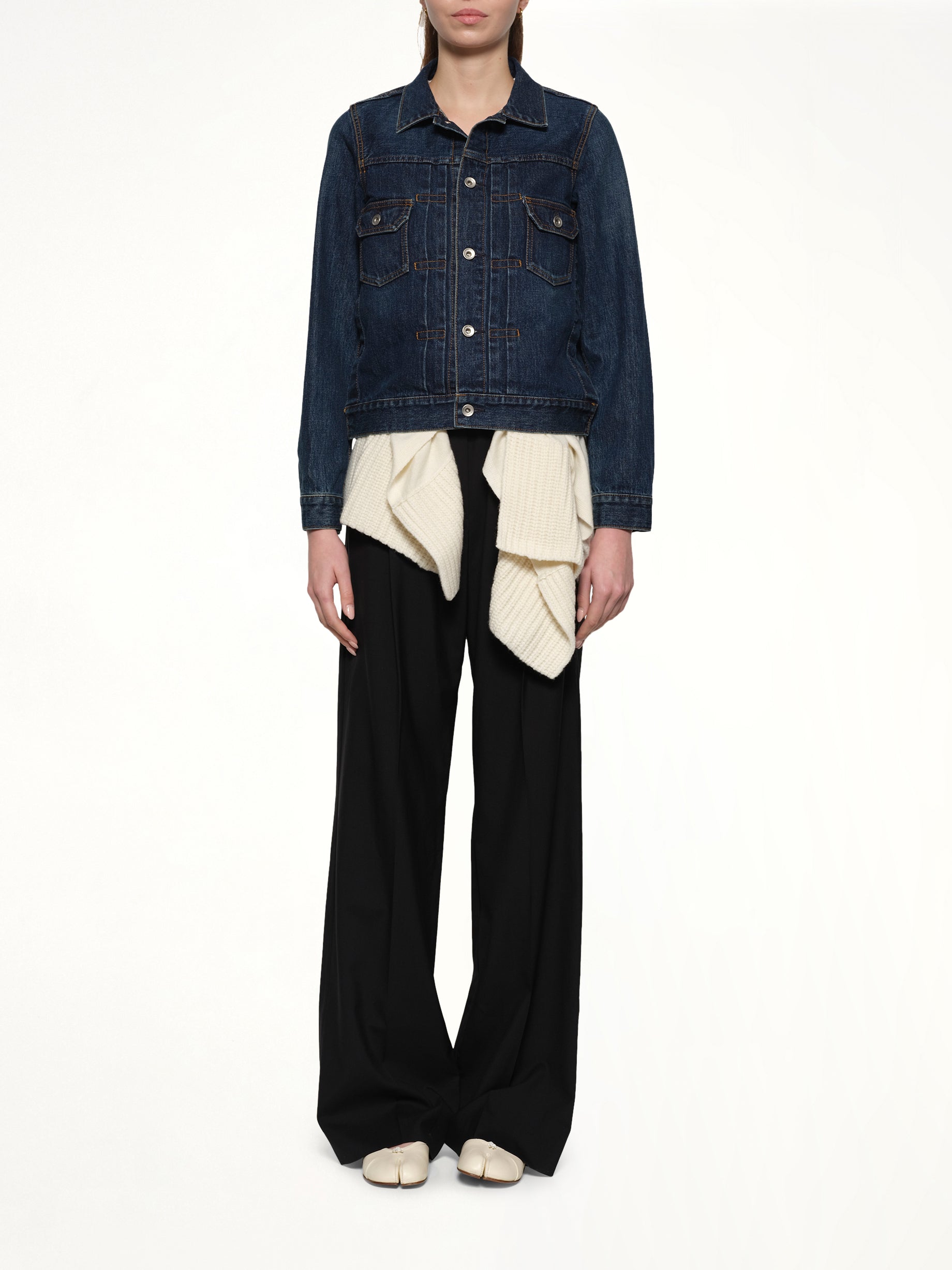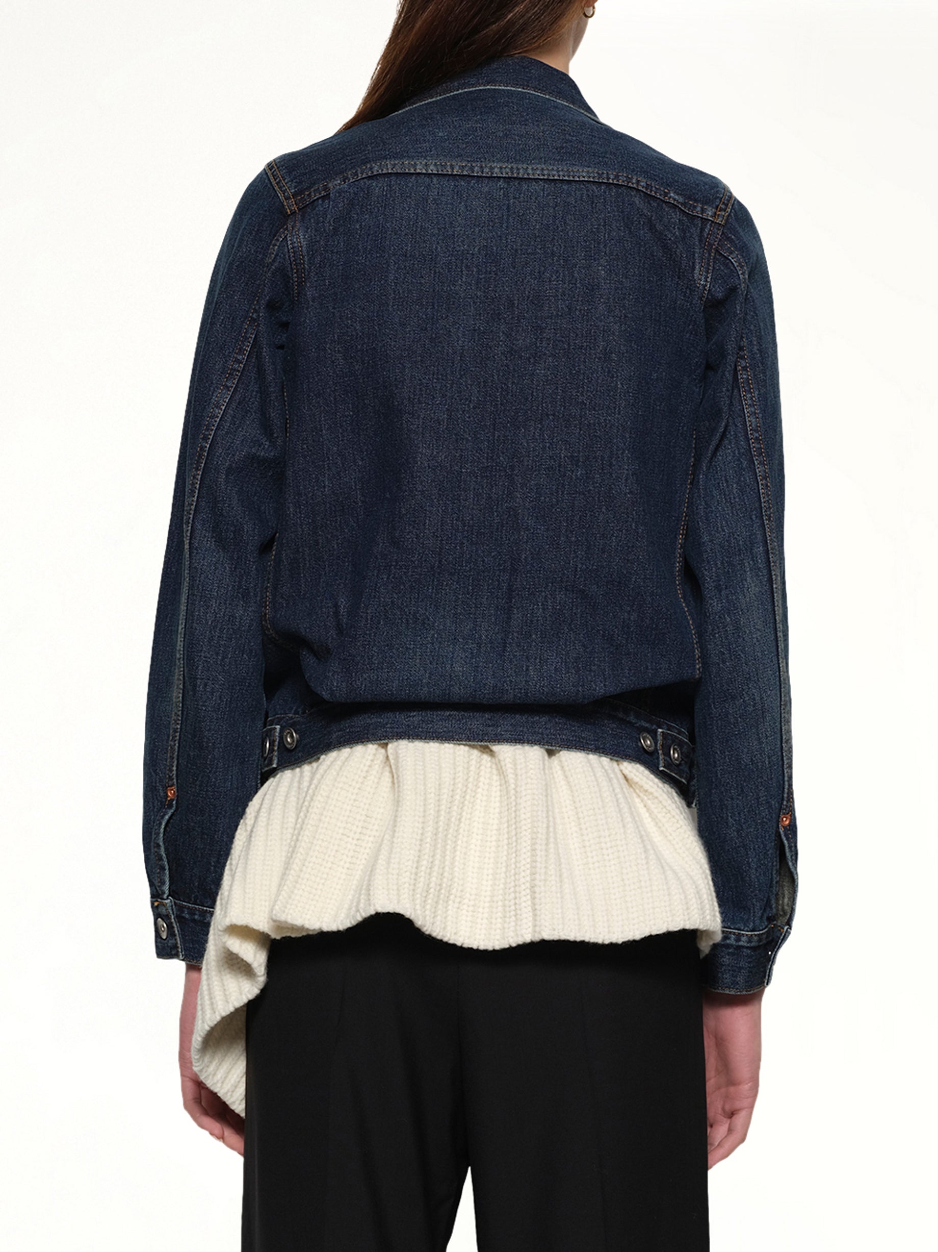 Sacai's Denim x Wool Knit Jacket in Blue/Off White is a unique blend of casual and sophisticated style, perfect for versatile layering. This jacket combines the rugged appeal of denim with the cozy warmth of wool knit, making it a standout piece for any wardrobe.