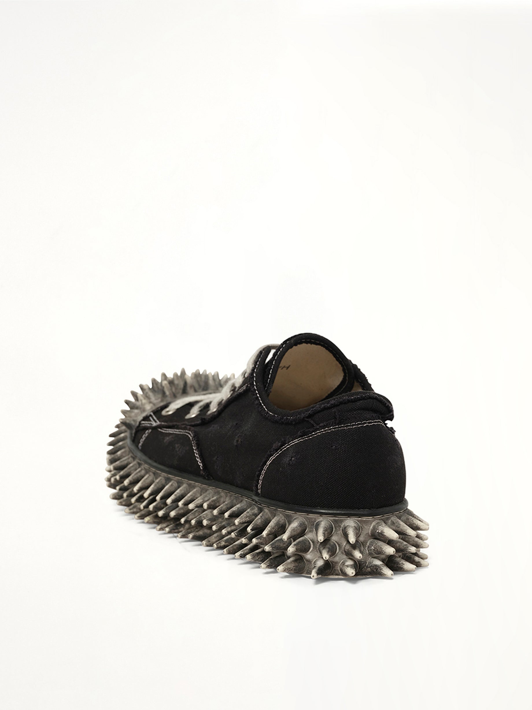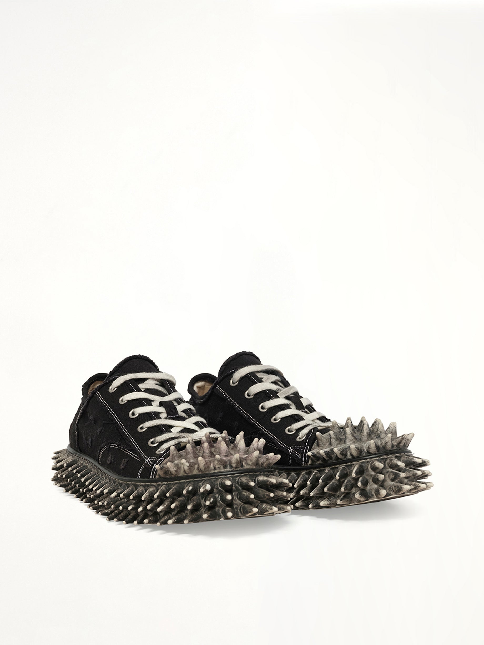 Doublet's Dirty Spike Toe Cap Canvas Sneaker in Black is a bold and edgy footwear choice that combines street style with a touch of punk. Designed for those who dare to stand out, these sneakers offer a unique aesthetic with their distinctive spike detailing.