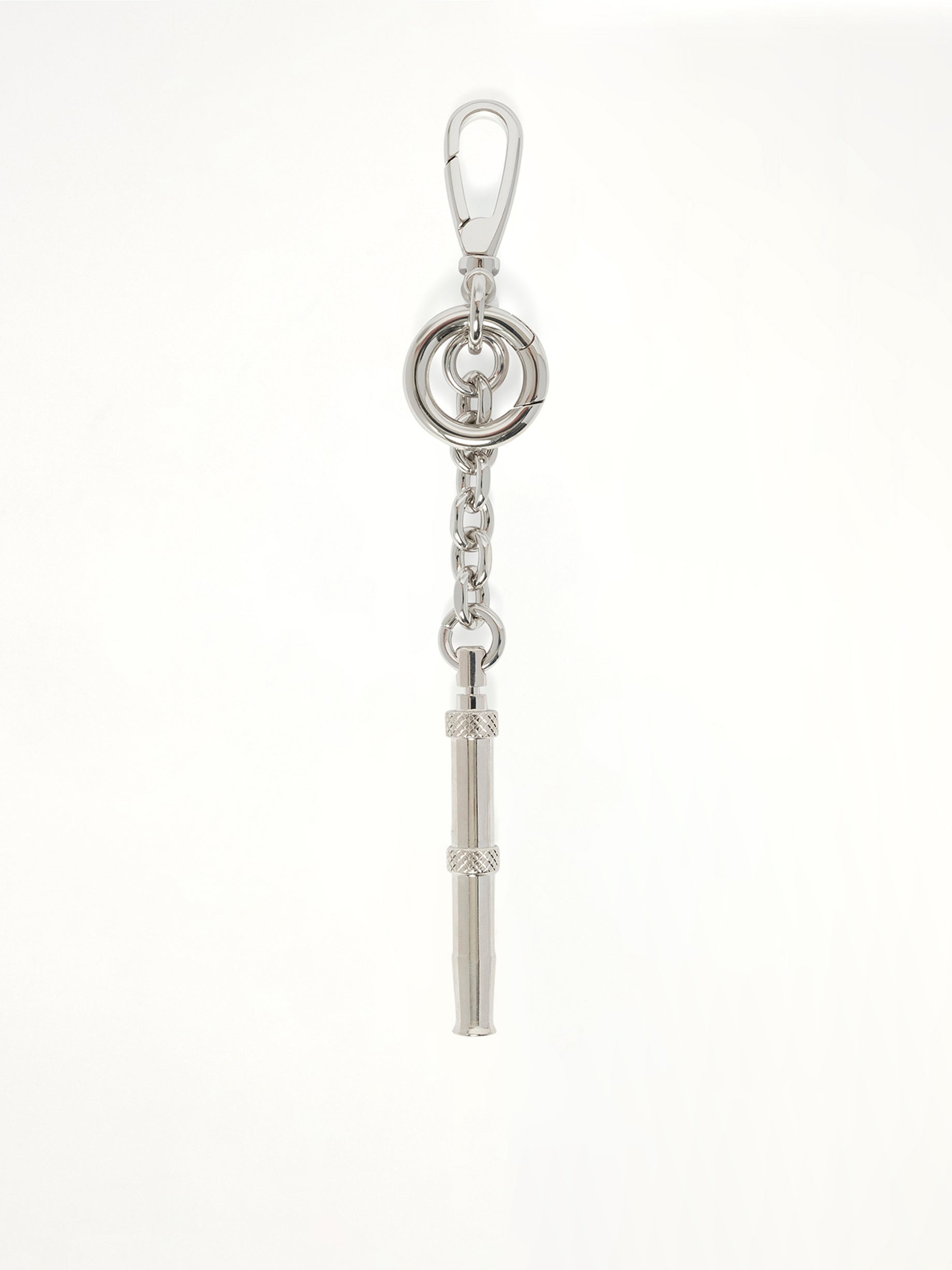 Maison Margiela's Dog Whistle Keychain in Silver is a sleek and functional accessory that combines style with utility. This elegant keychain is designed to keep your keys organized while offering a discreet dog whistle feature.